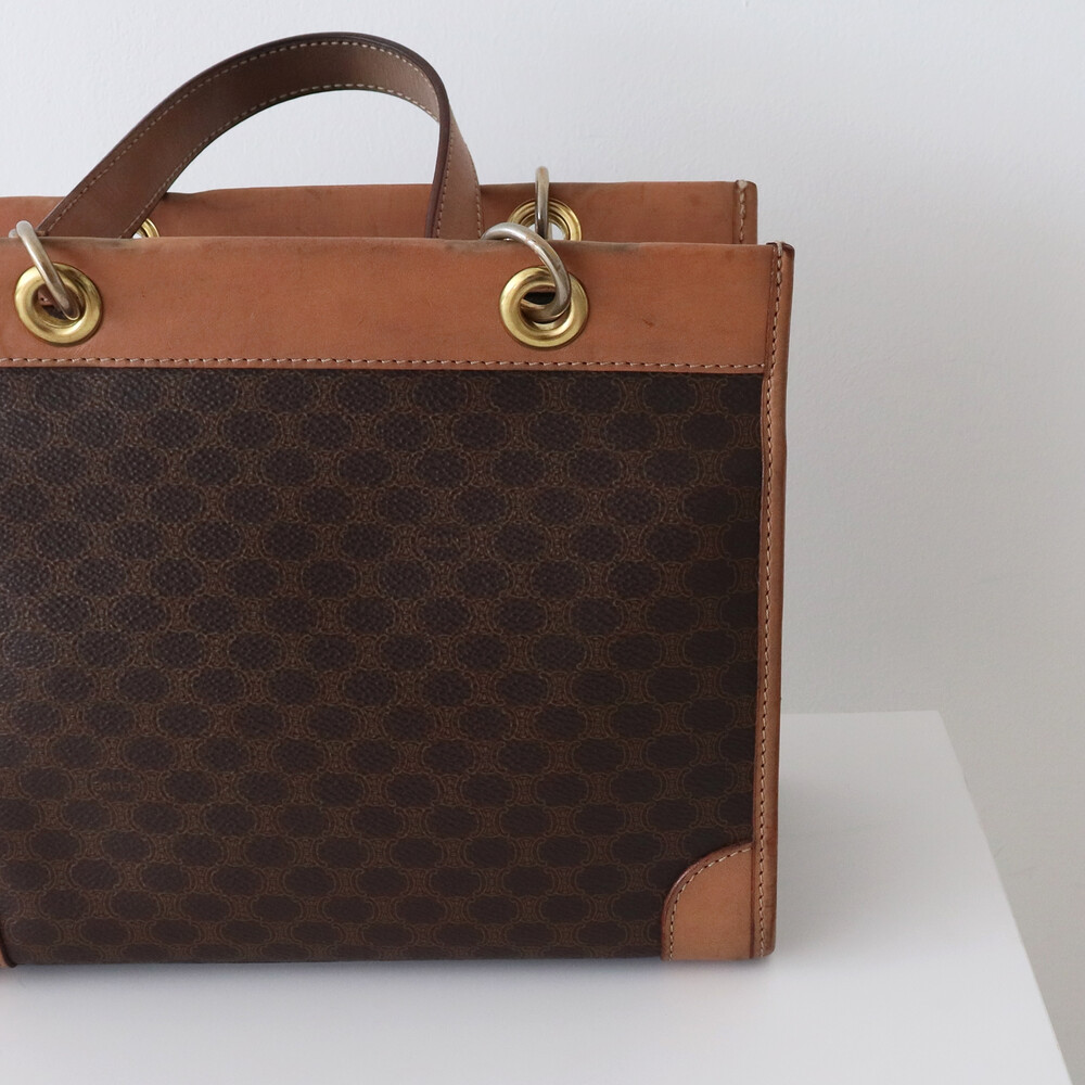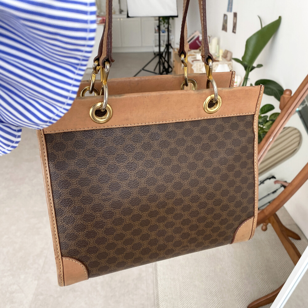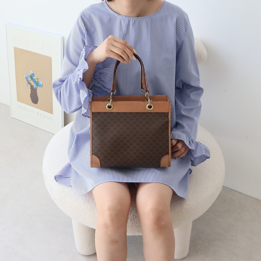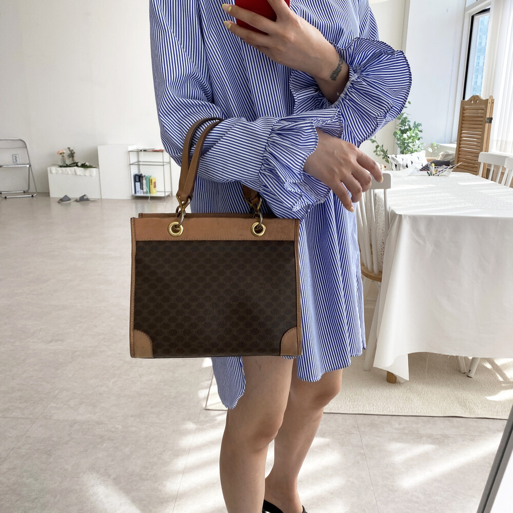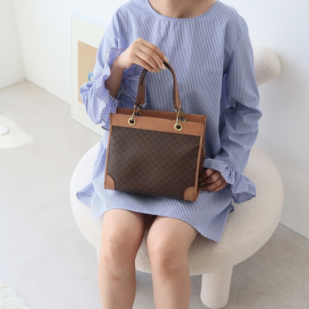 클래식한 스퀘어 실루엣에 브랜드 아이덴티티를 상징하는 마카담 패턴이 더해져 조화로운 비율을 자랑하는 빈티지 셀린느 토트백입니다.