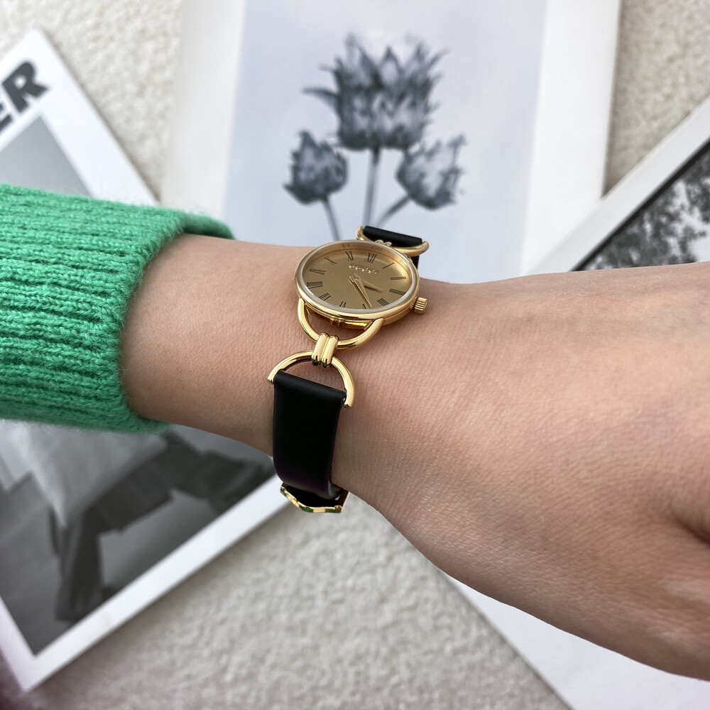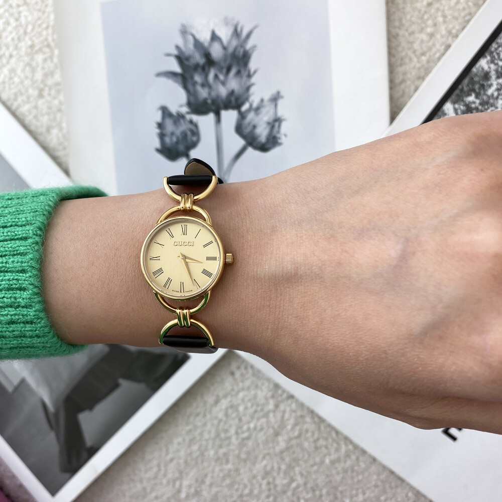 부드러운 골드톤 케이스와 다이얼 위릉 장식하는 구찌 로고와