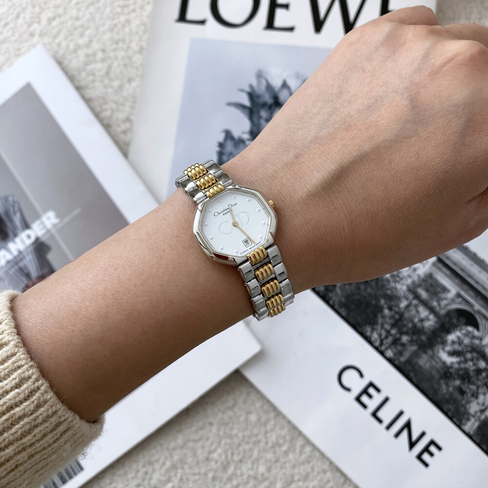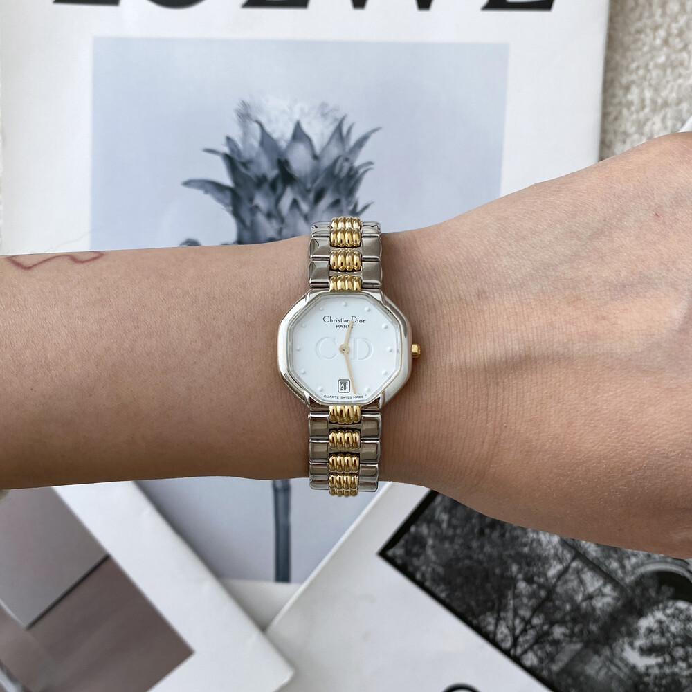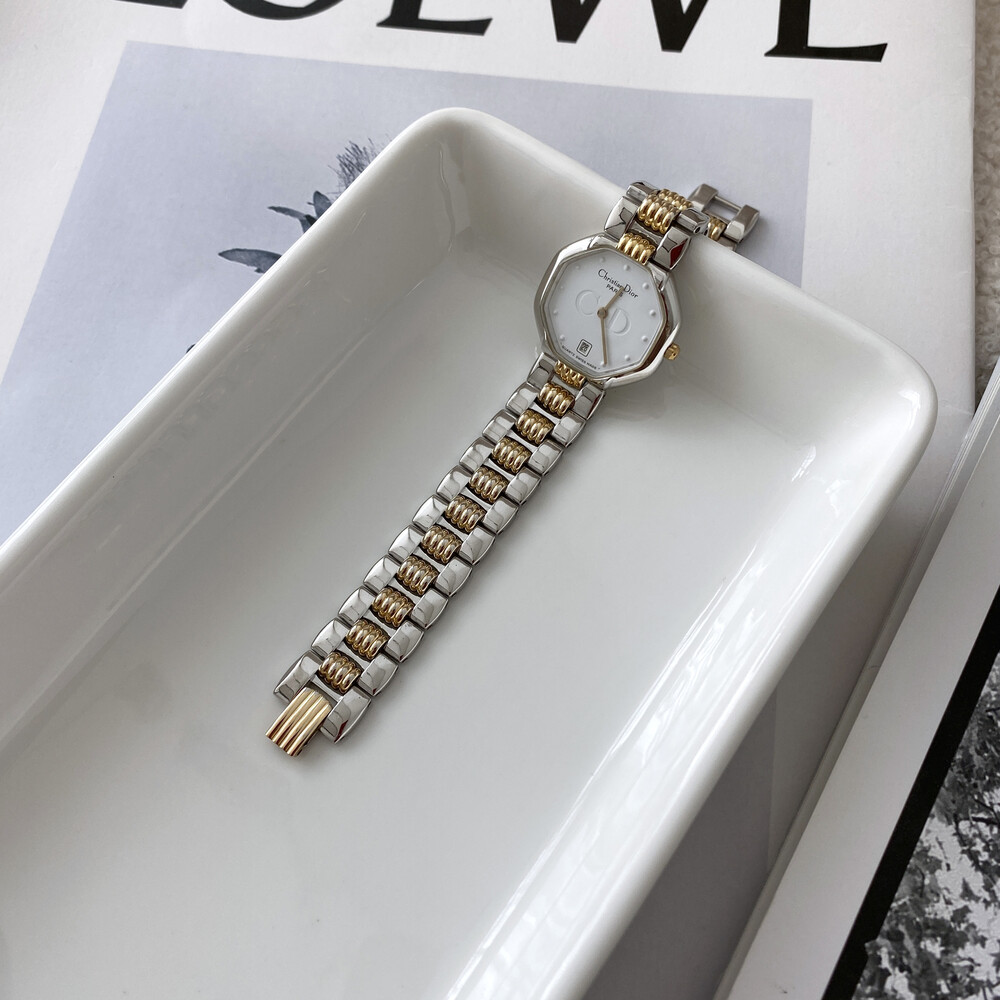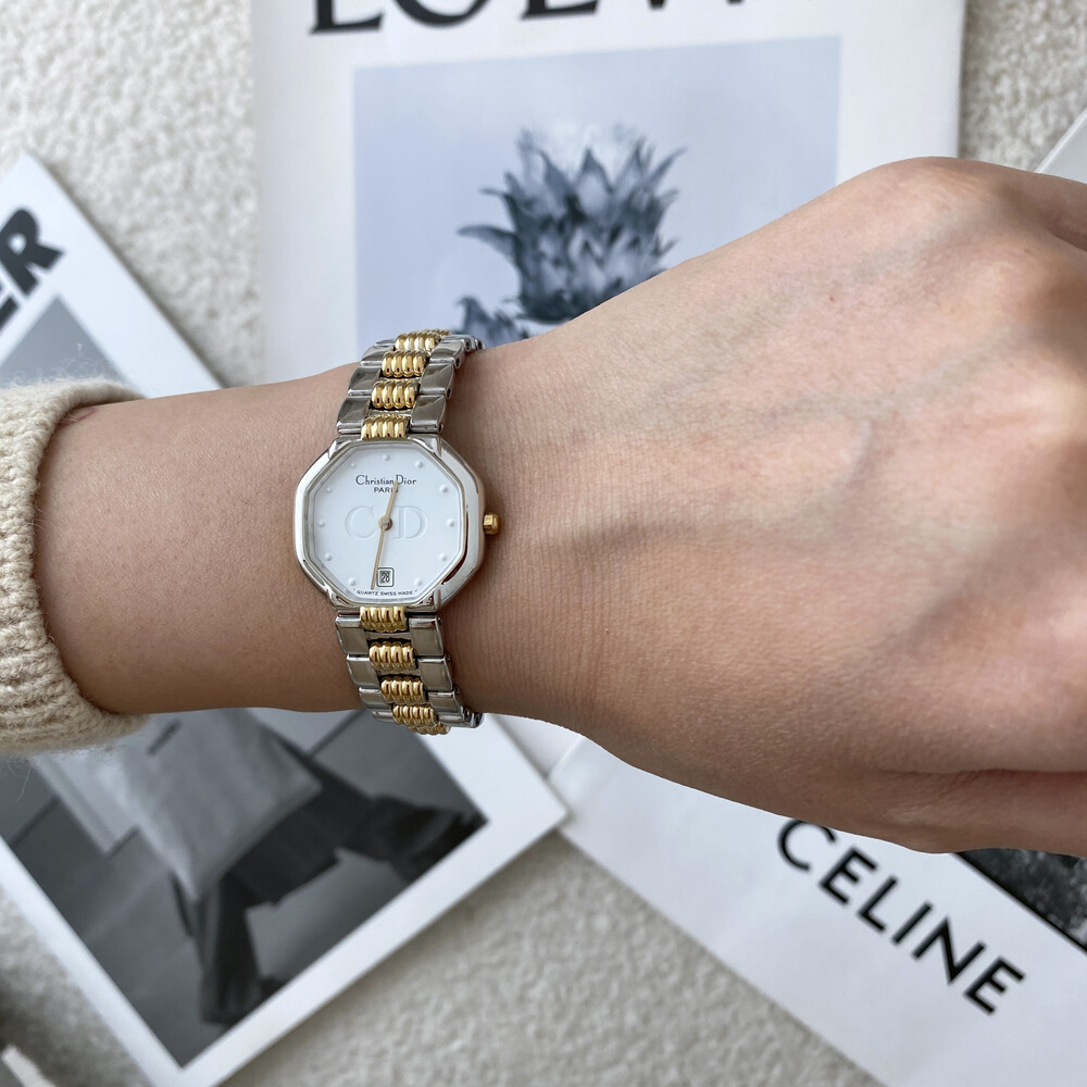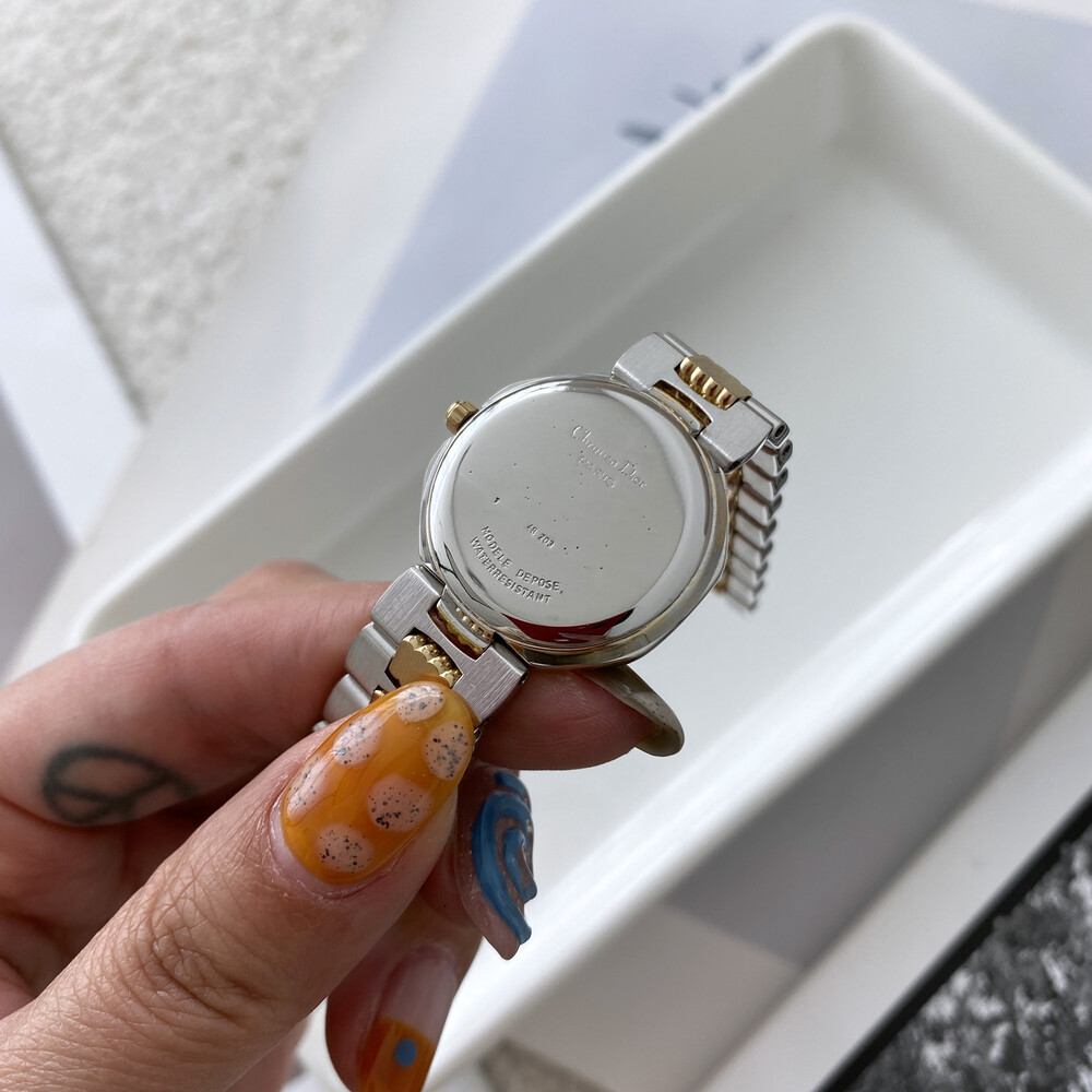 여성용으로 제작된 빈티지 디올 시계이며 스위스에서 생산된 쿼츠 무브먼트로 제작되었습니다.