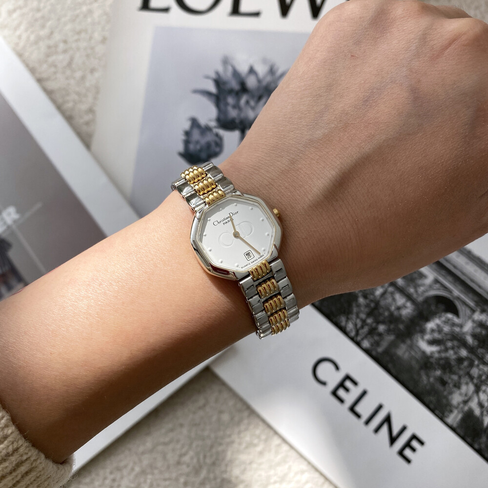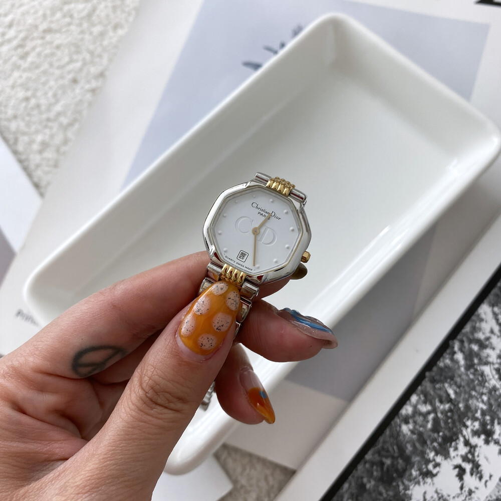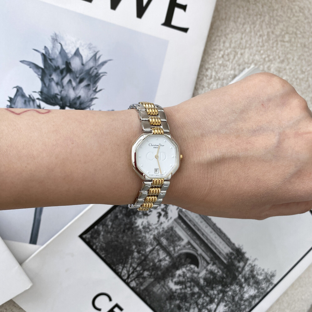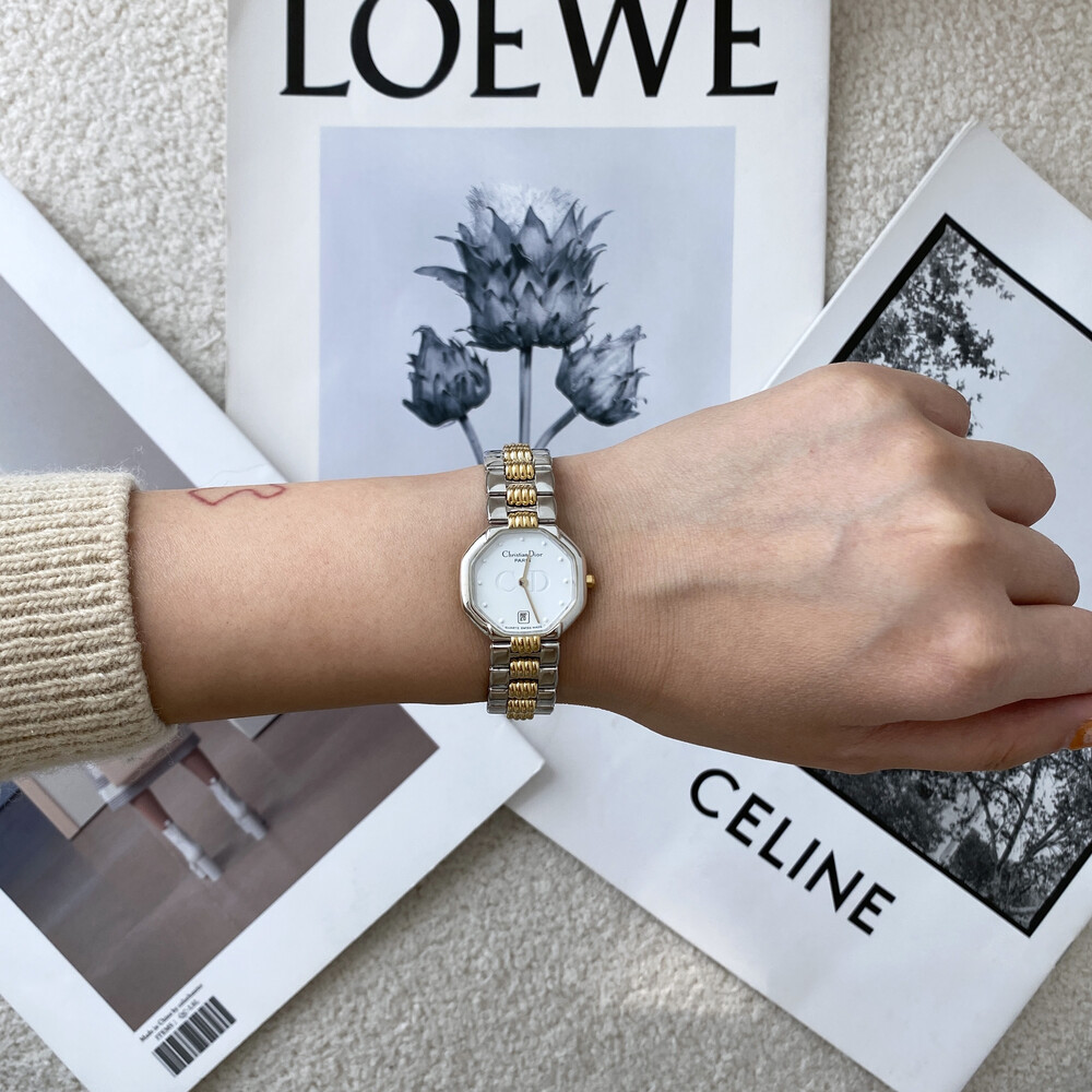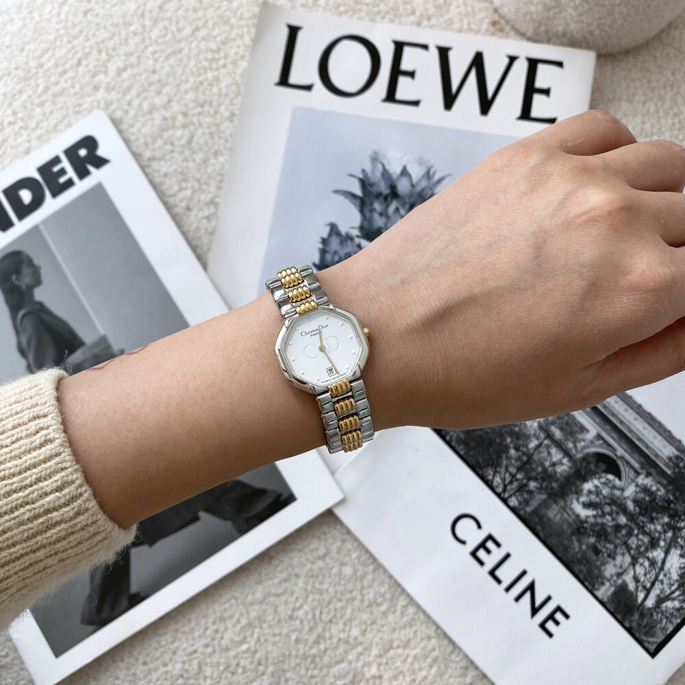 여성용으로 제작된 빈티지 디올 시계이며 스위스에서 생산된 쿼츠 무브먼트로 제작되었습니다.