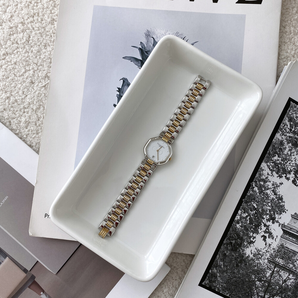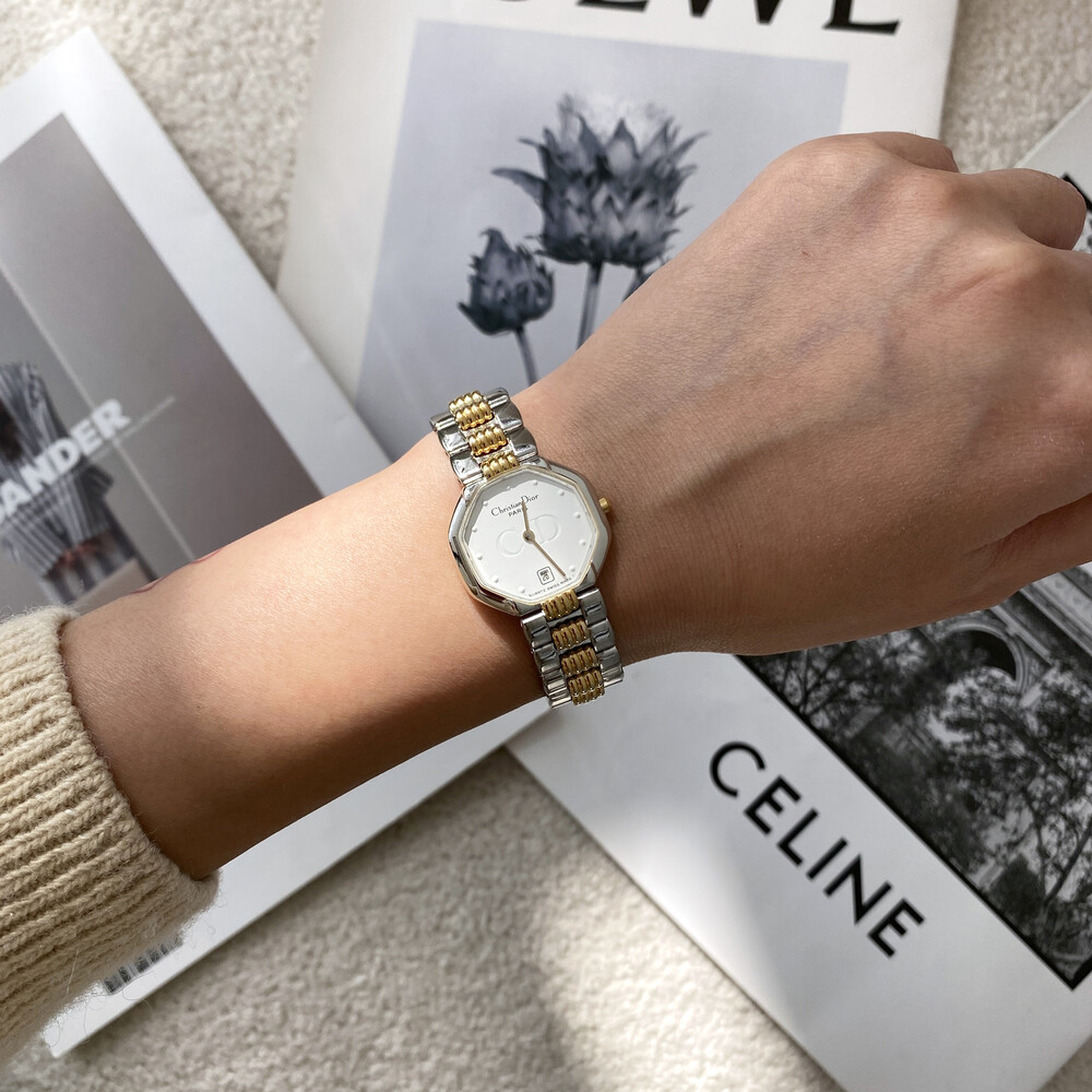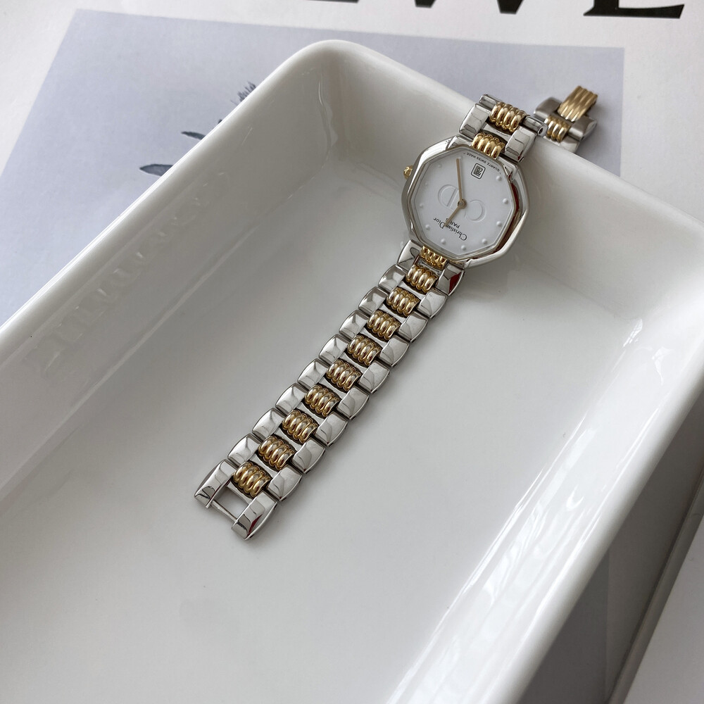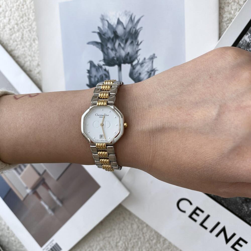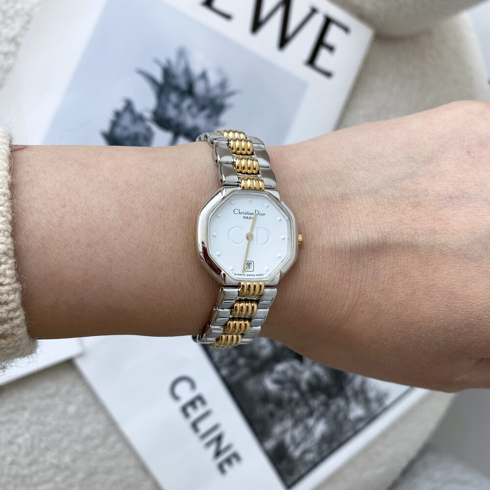 여성용으로 제작된 빈티지 디올 시계이며 스위스에서 생산된 쿼츠 무브먼트로 제작되었습니다.
