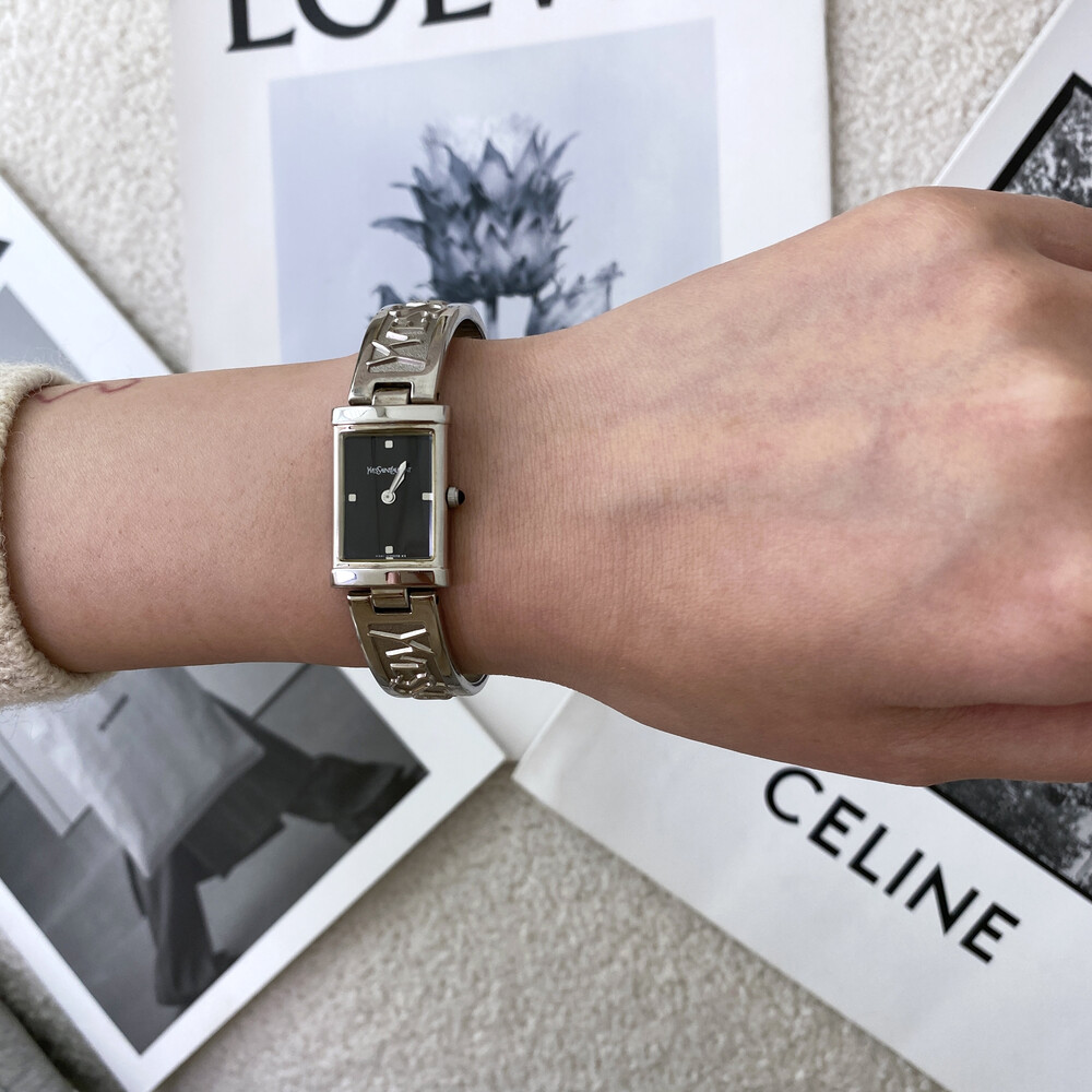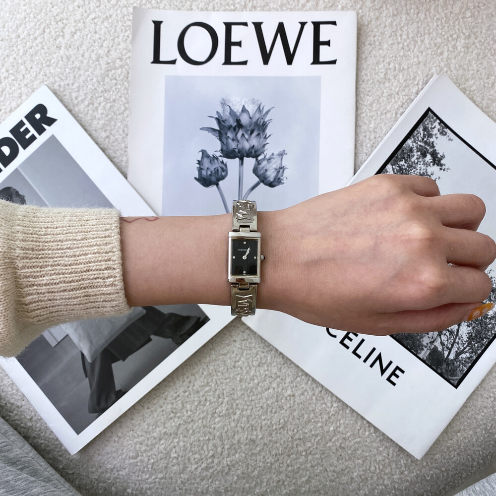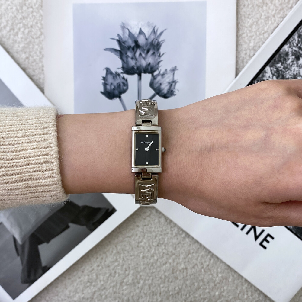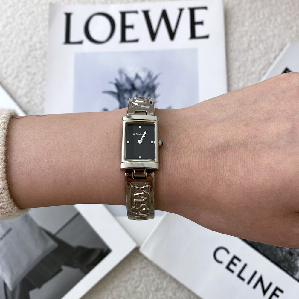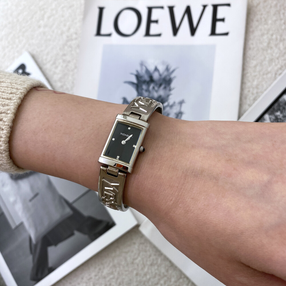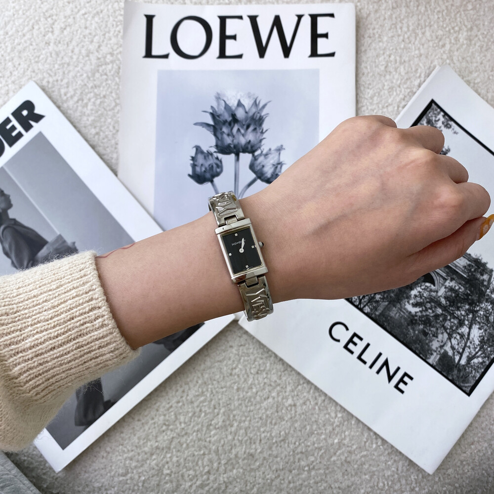 입생로랑 로고로 장식된 브레이슬릿이 돋보이는 시계이며 착용 하였을 때