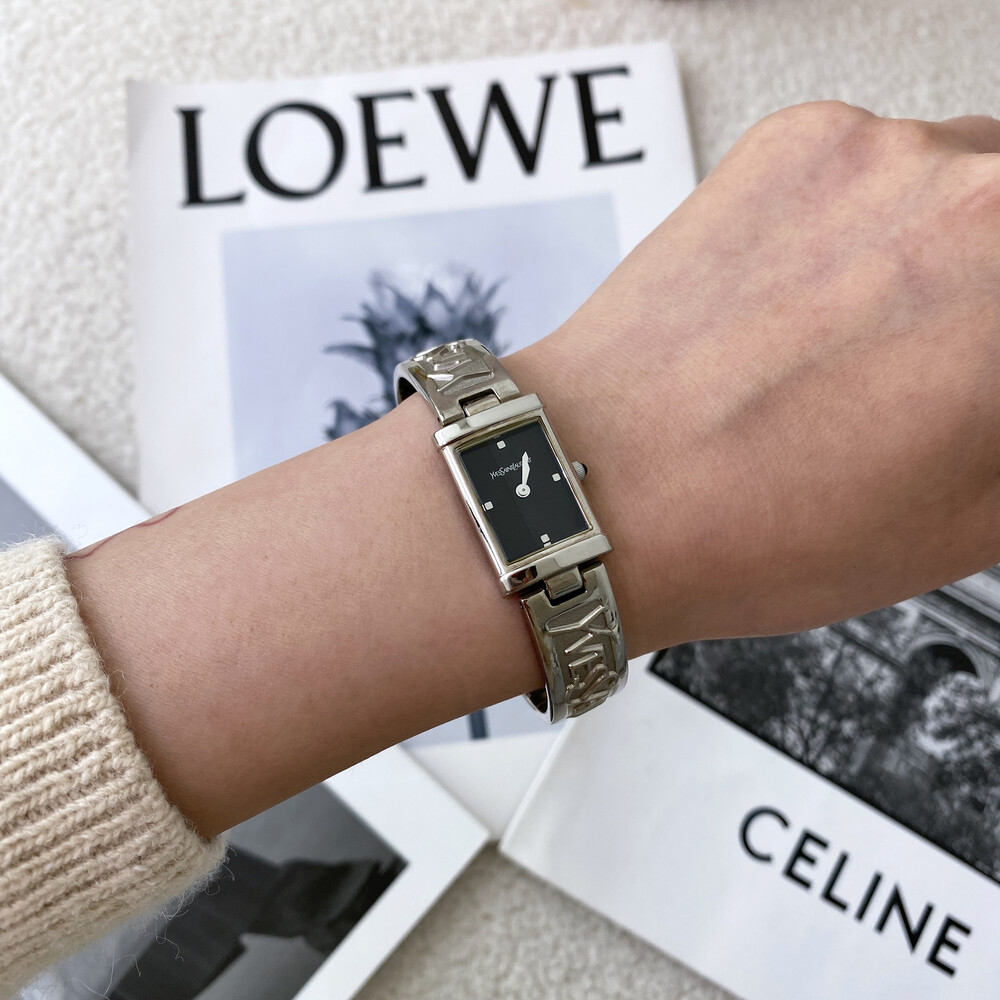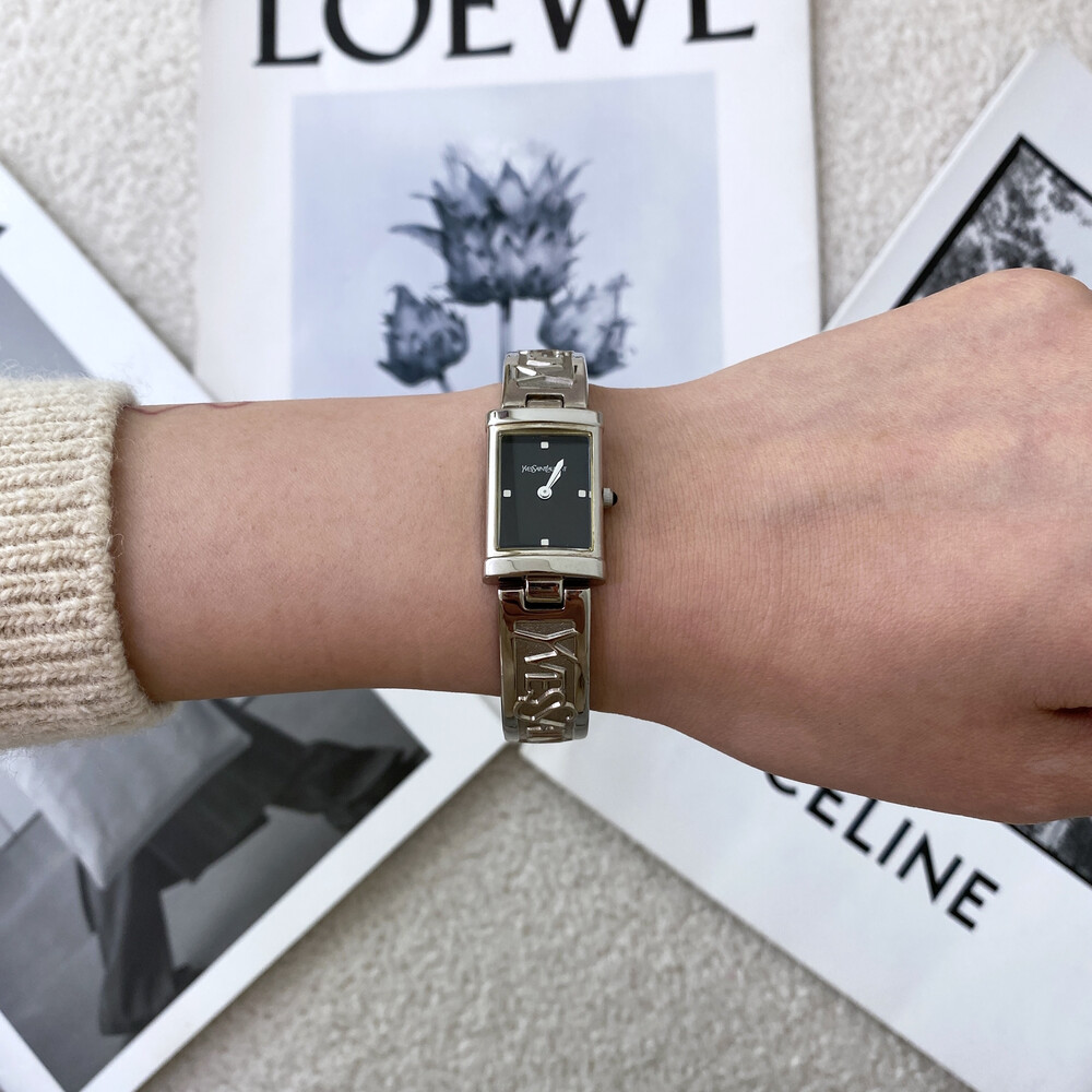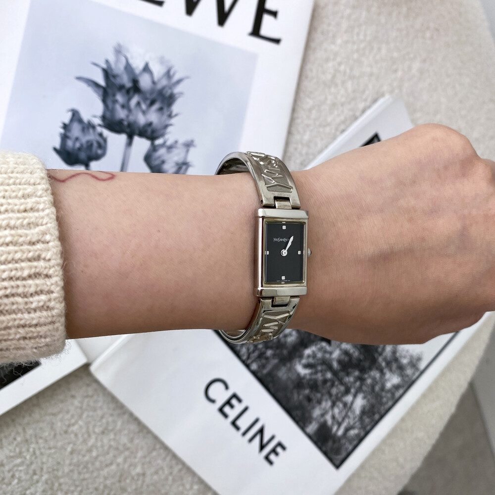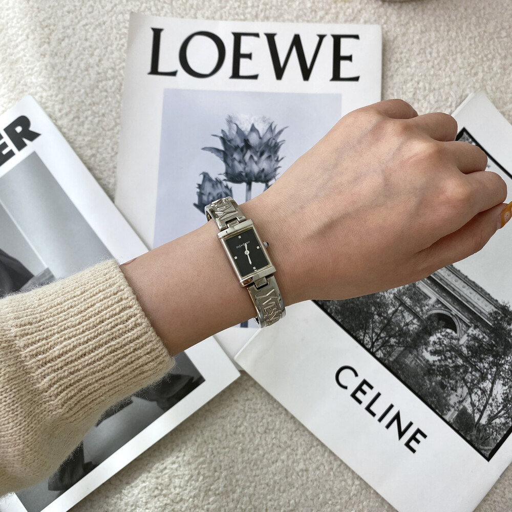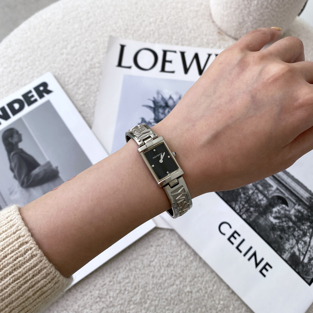입생로랑 로고로 장식된 브레이슬릿이 돋보이는 시계이며 착용 하였을 때