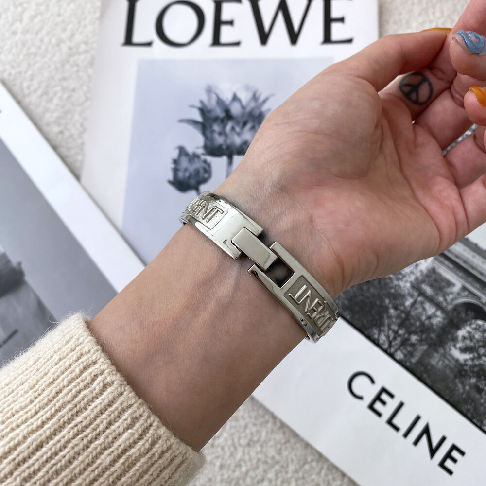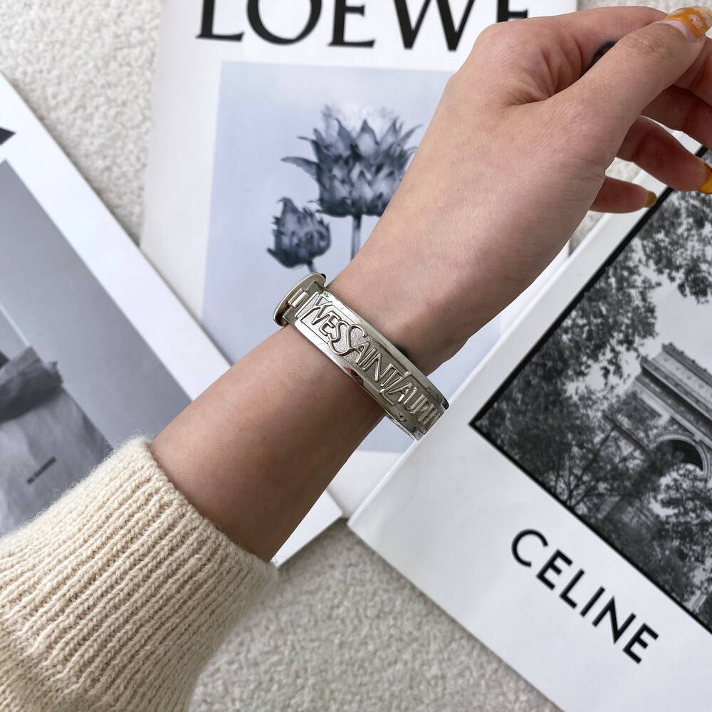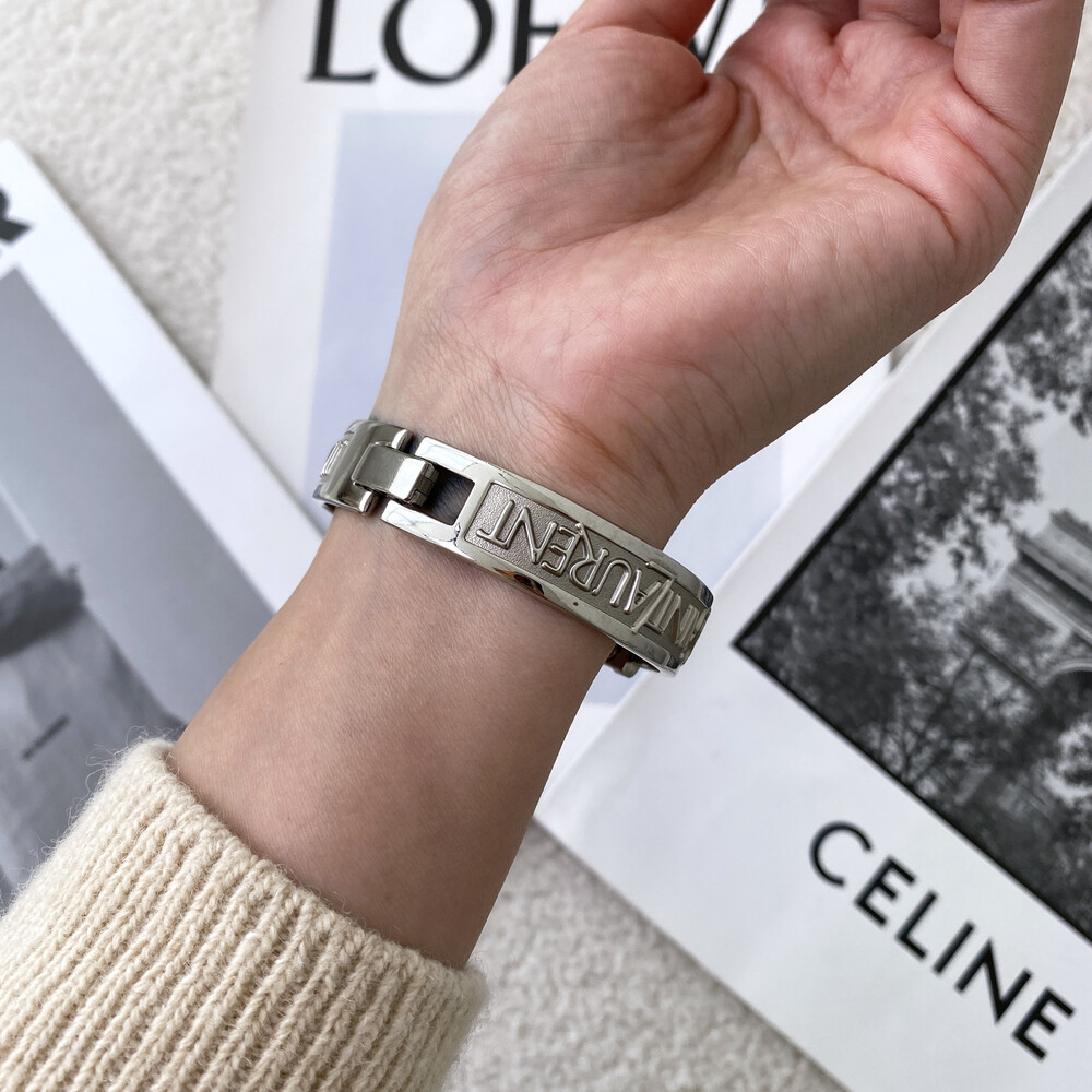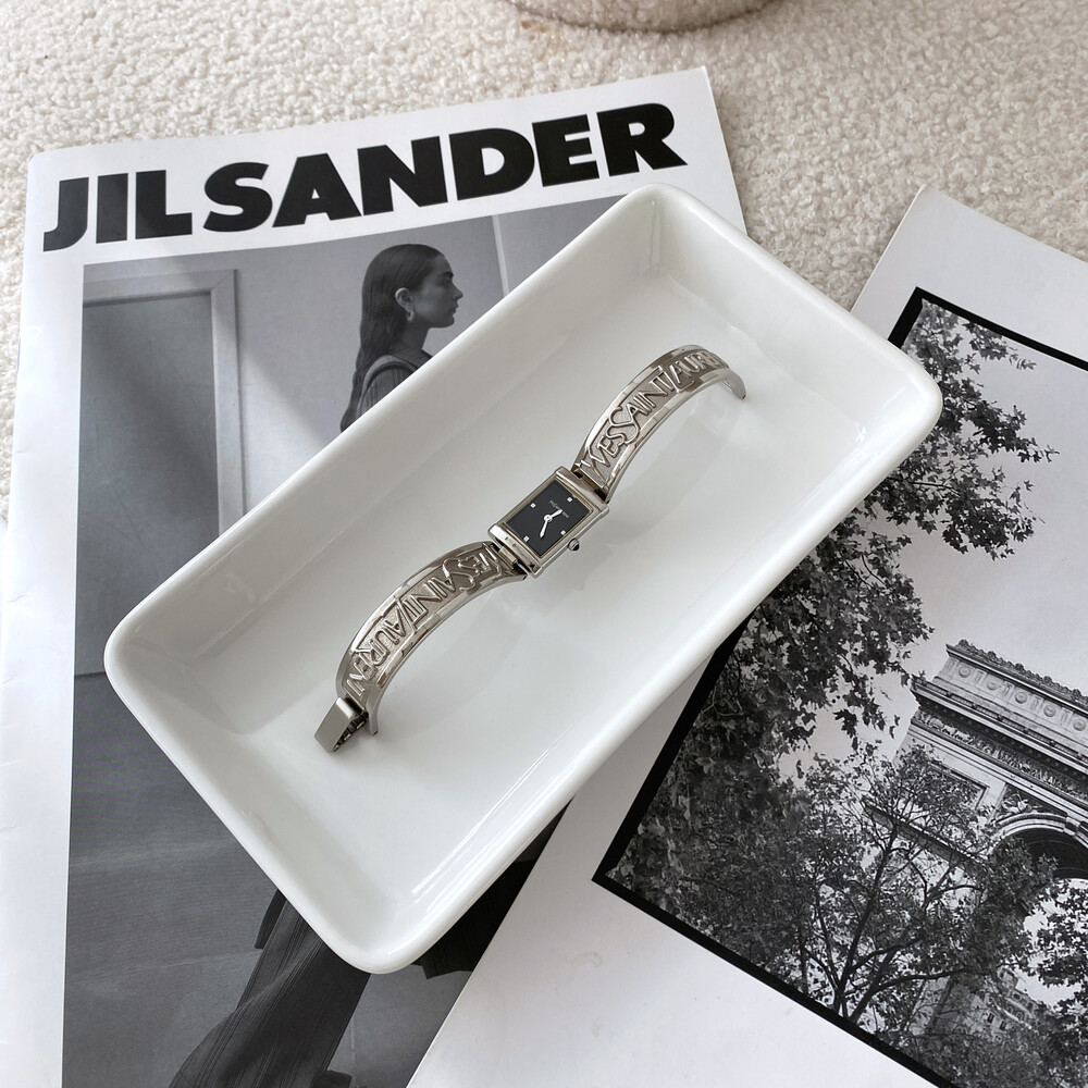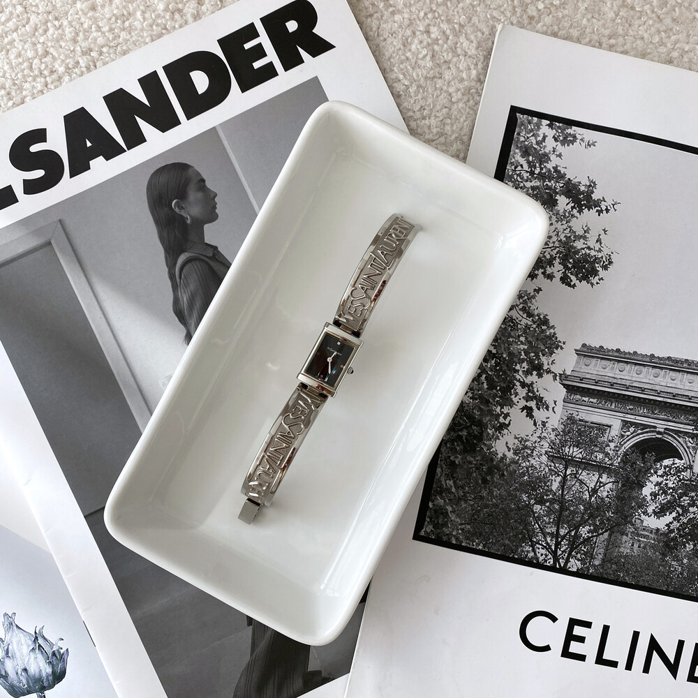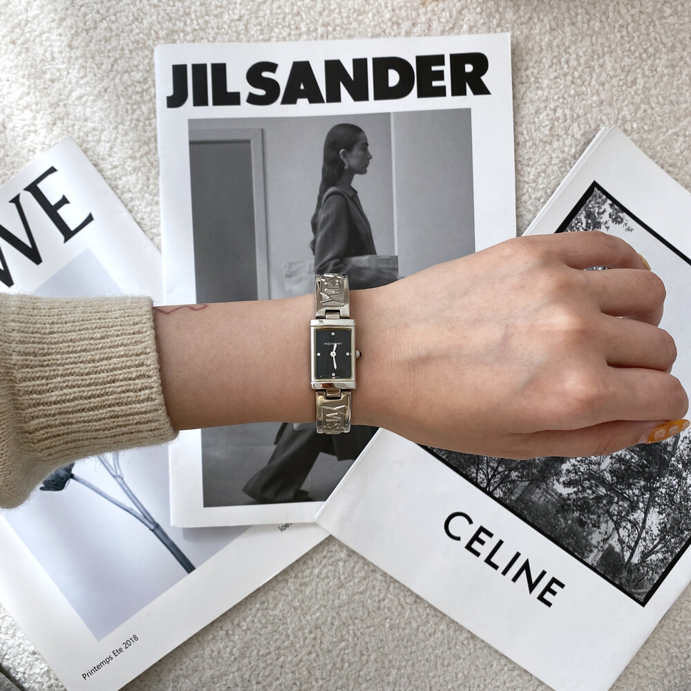 입생로랑 로고로 장식된 브레이슬릿이 돋보이는 시계이며 착용 하였을 때