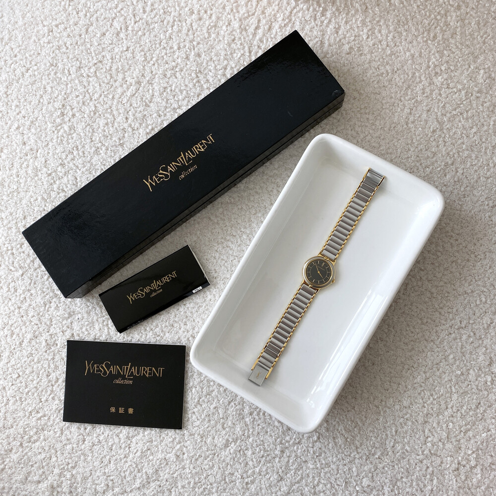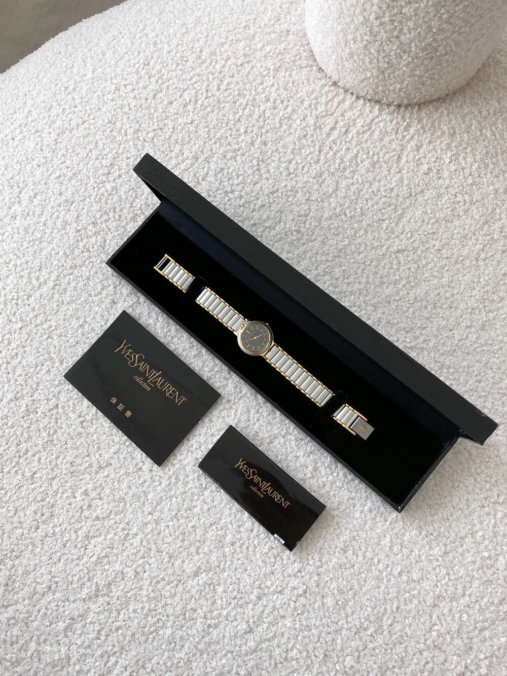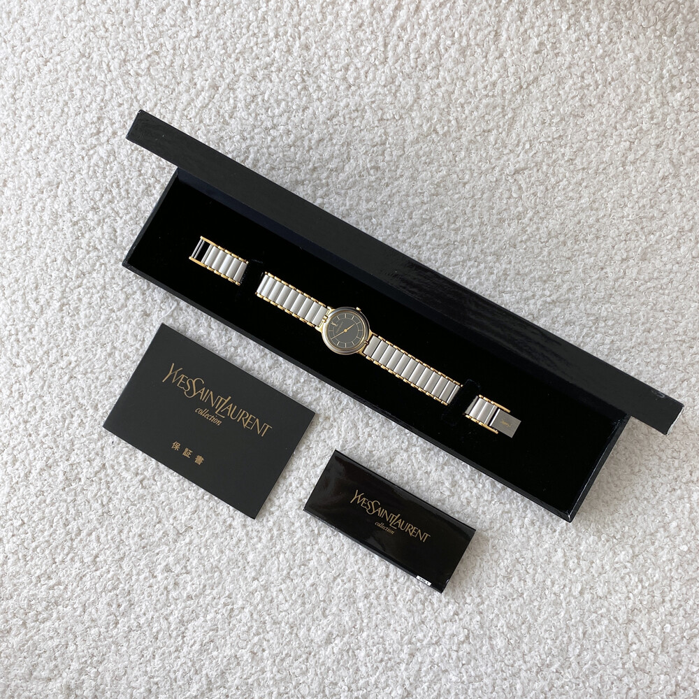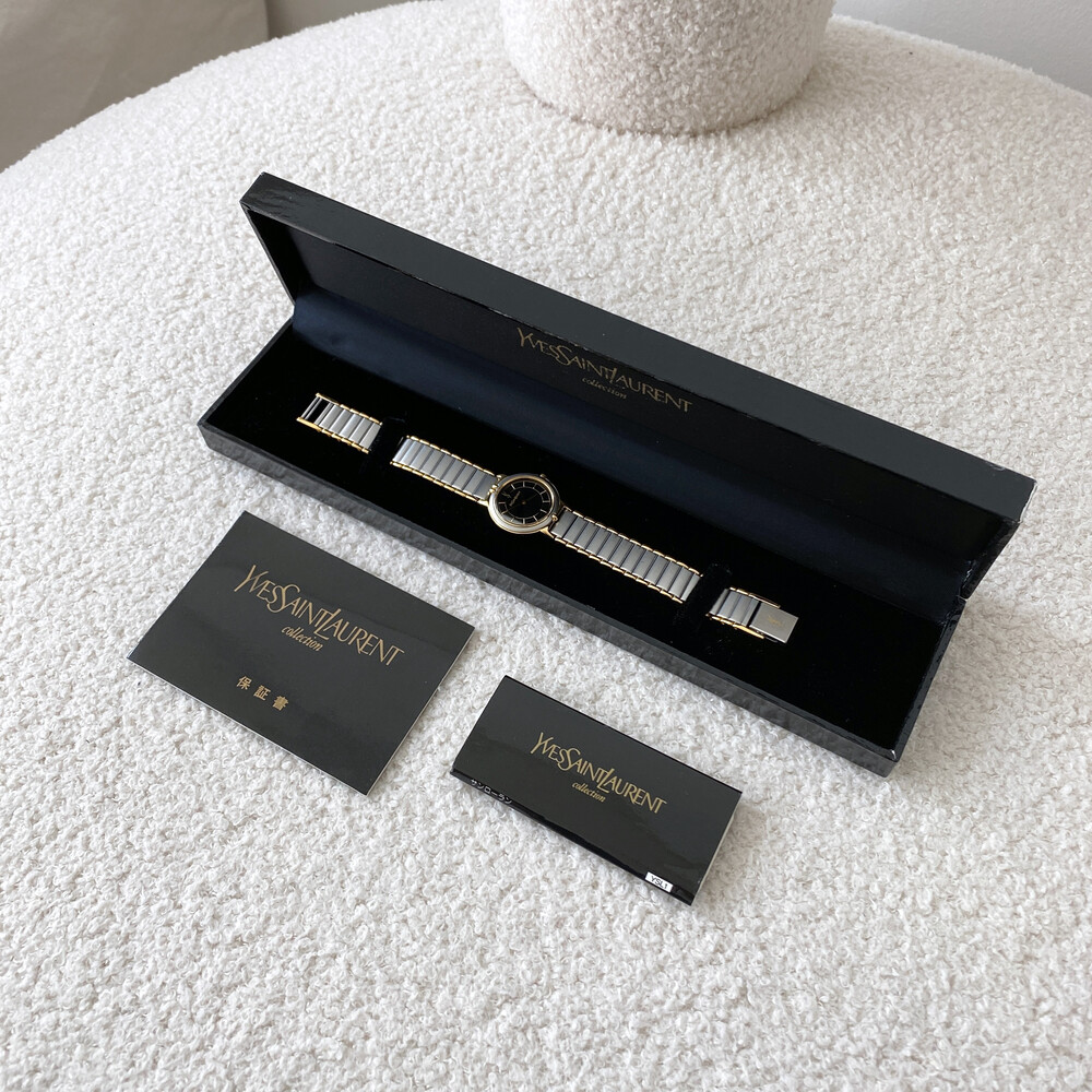 입생로랑 시계 케이스, 보증서, 사용설명서가 포함된 제품입니다.