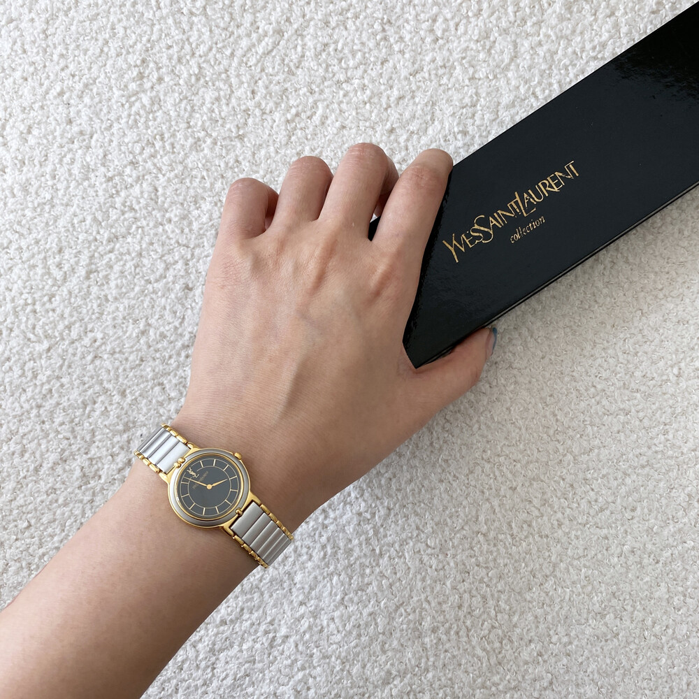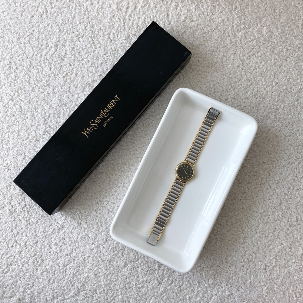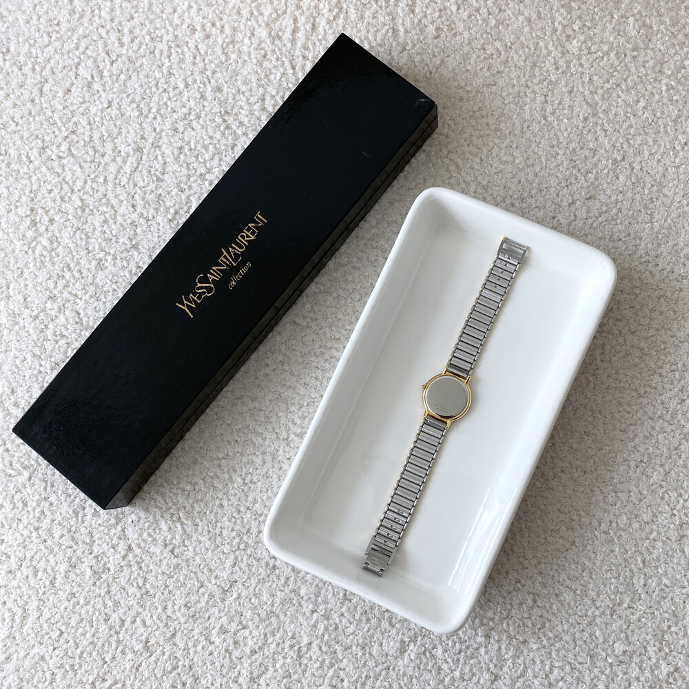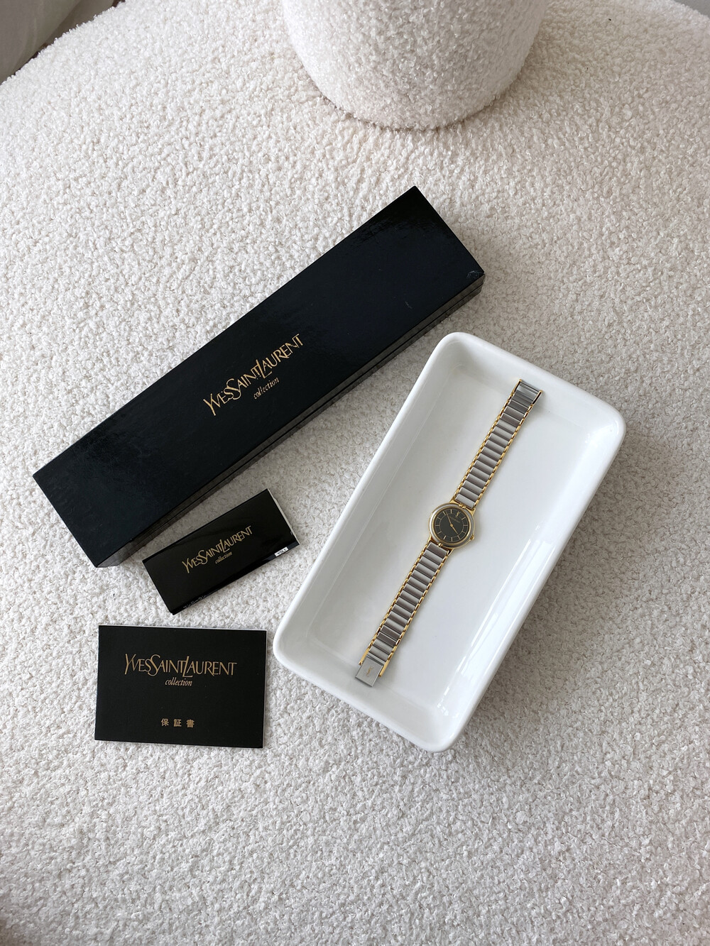 입생로랑 시계 케이스, 보증서, 사용설명서가 포함된 제품입니다.