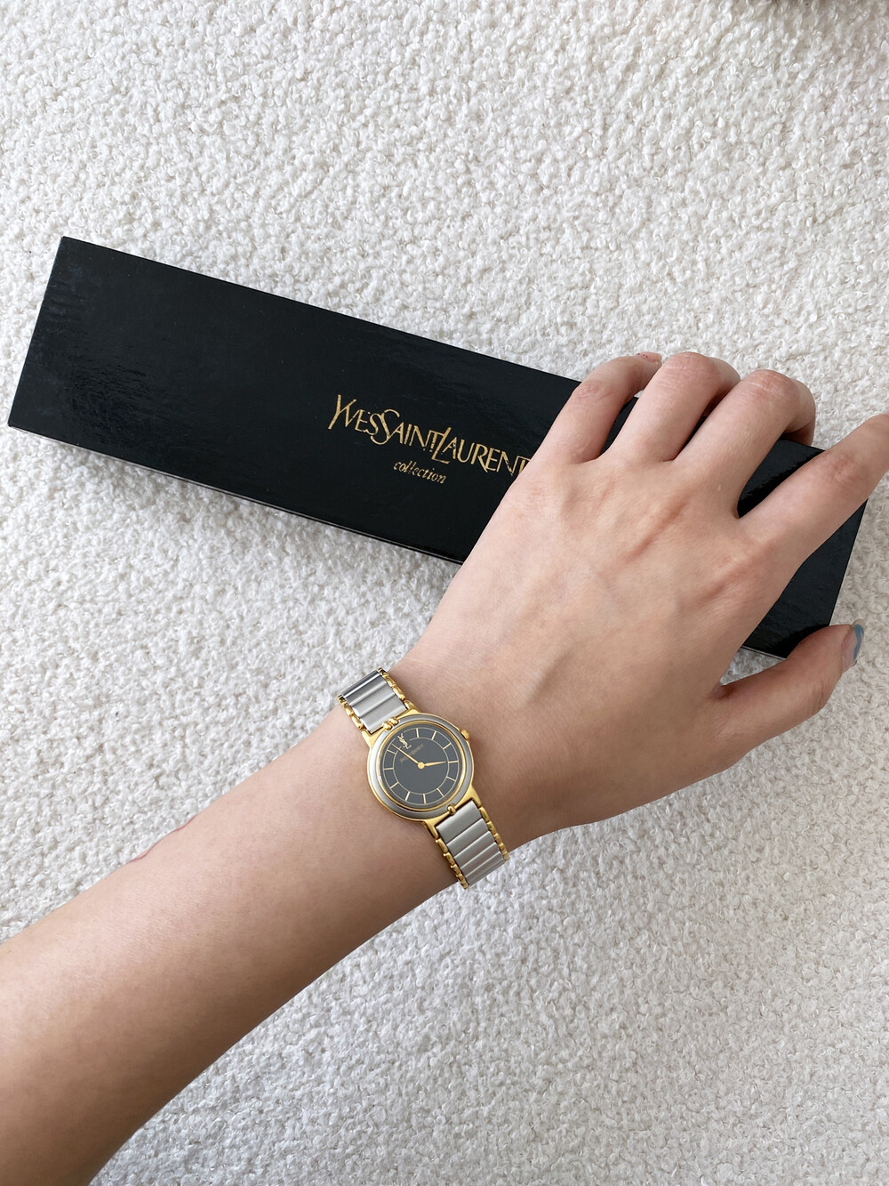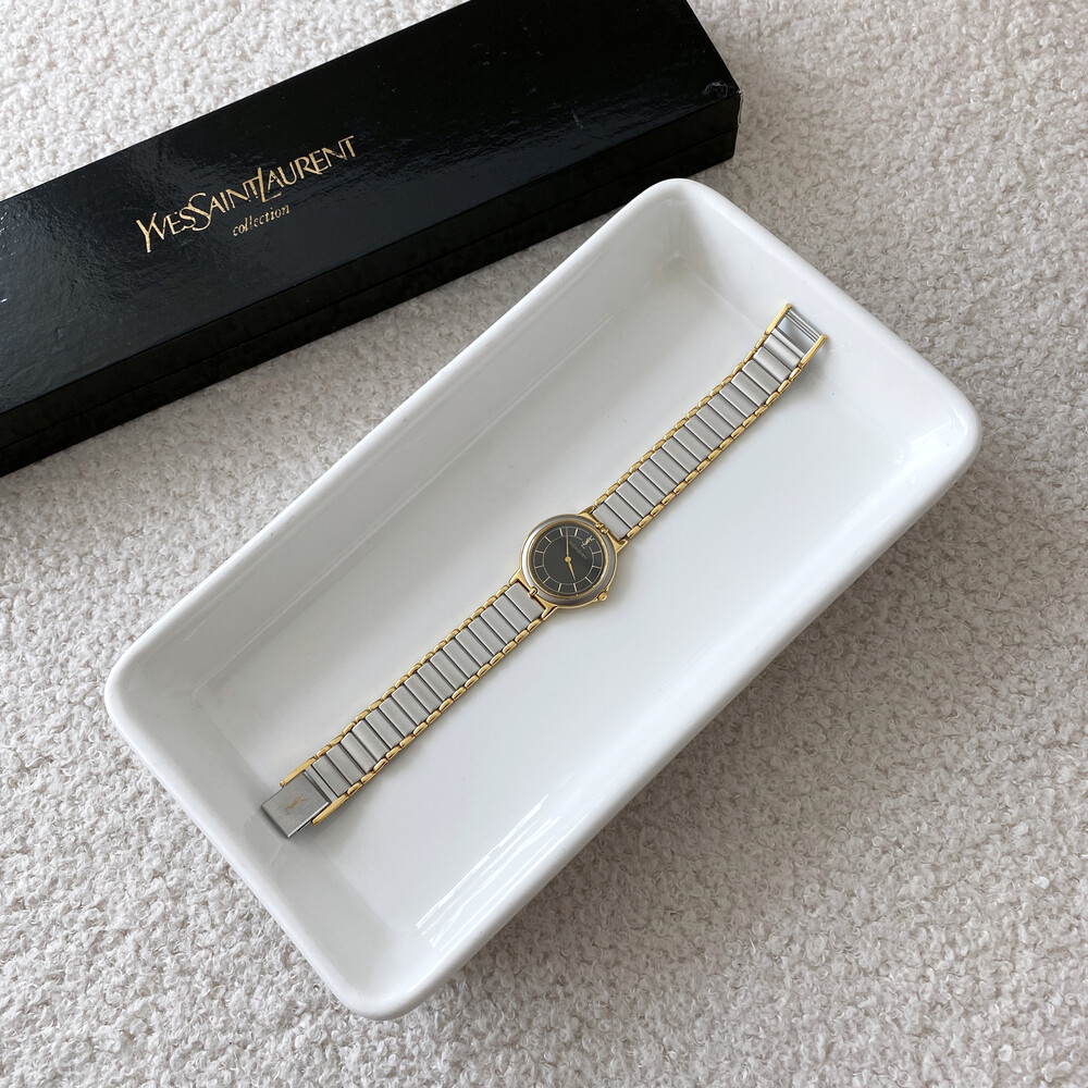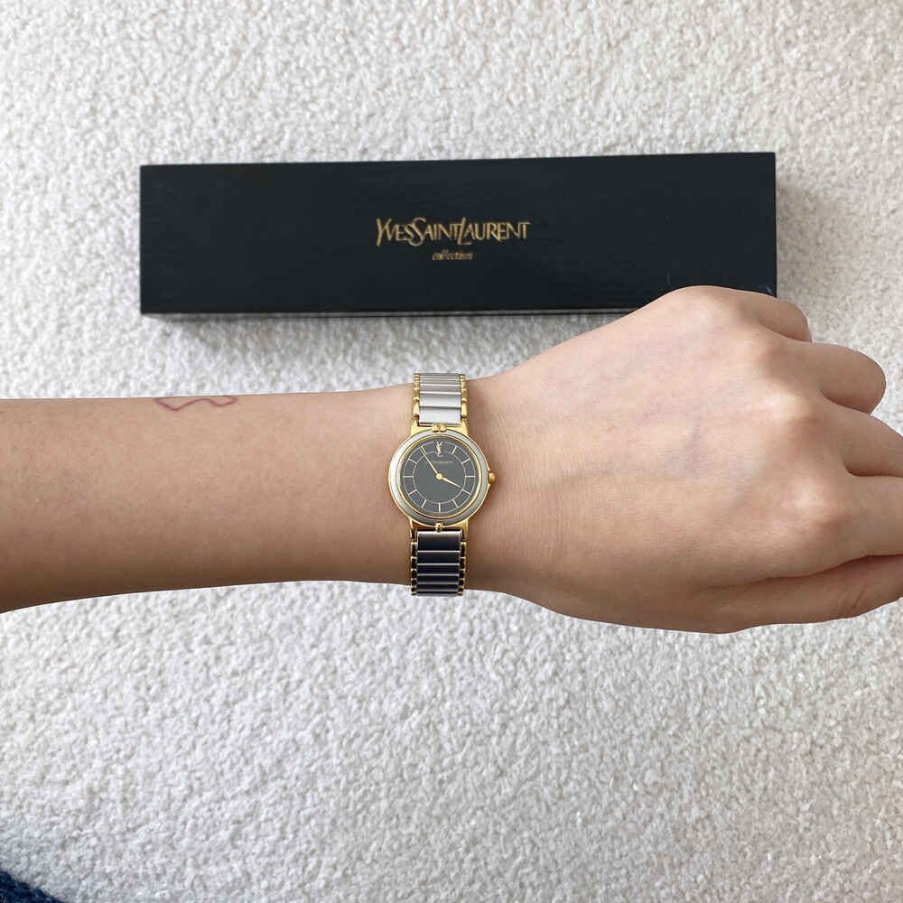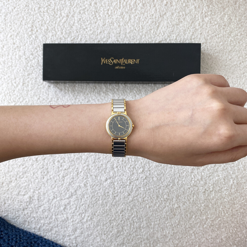입생로랑 시계 케이스, 보증서, 사용설명서가 포함된 제품입니다.