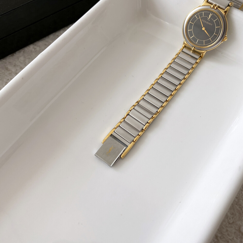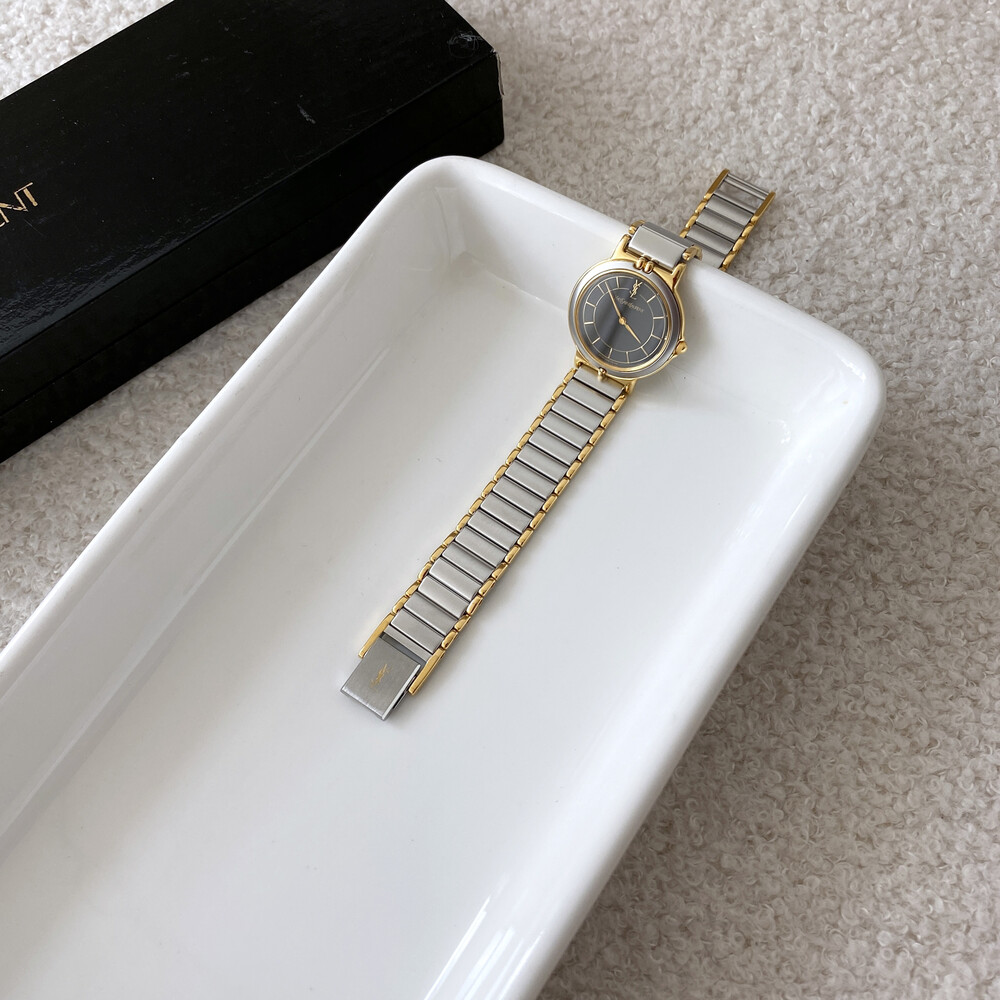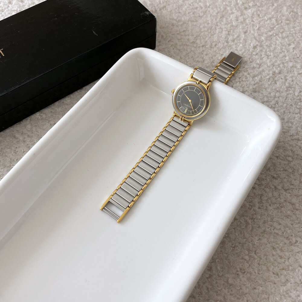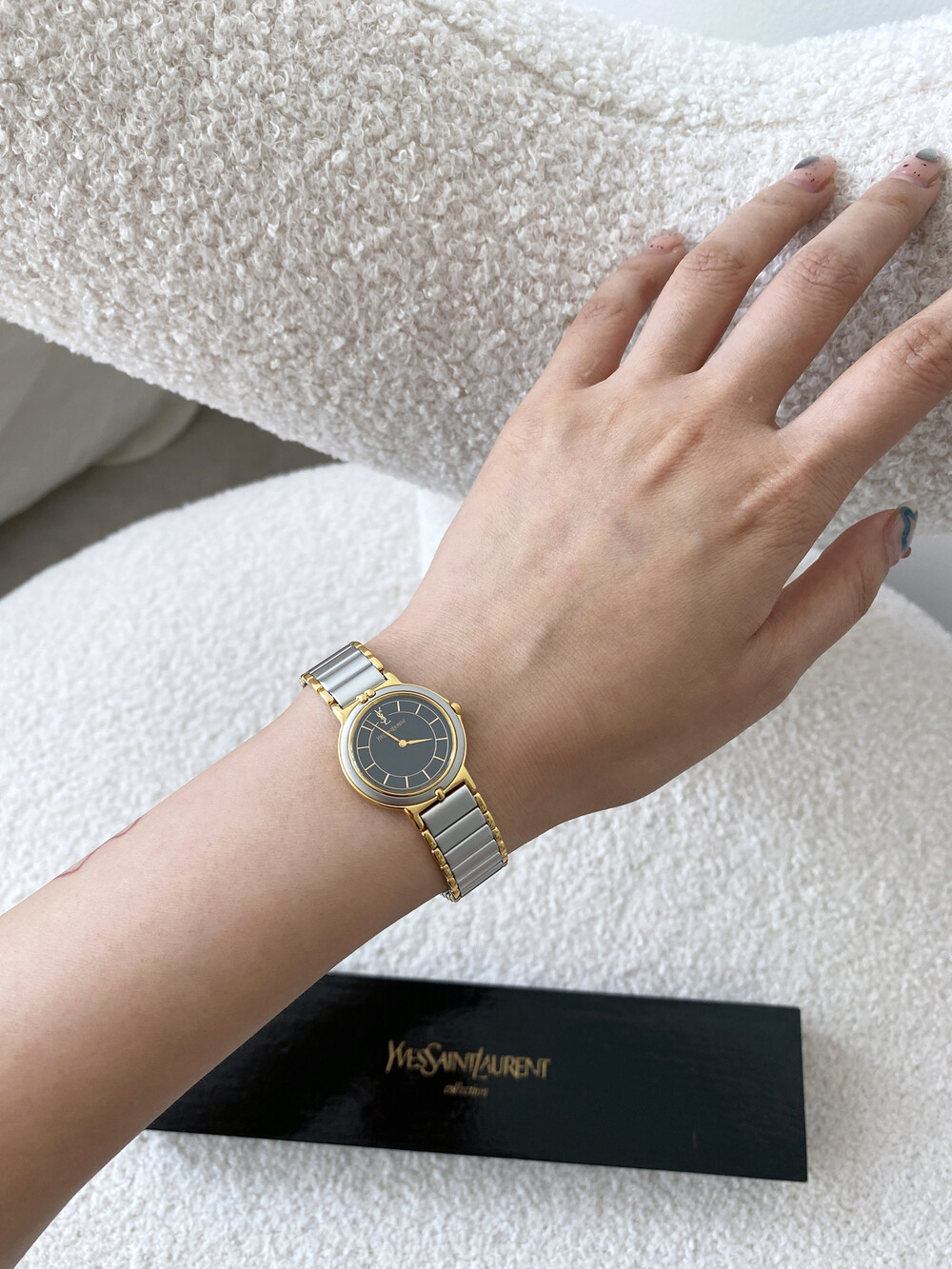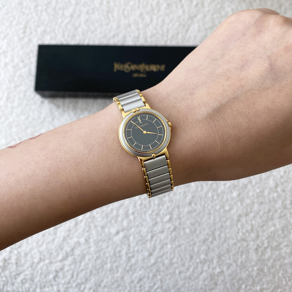 여성용으로 제작된 생로랑 시계이며 쿼츠 무브먼트로 제작되었습니다.
