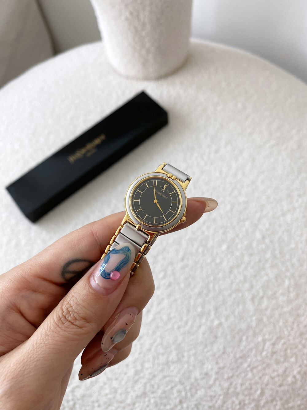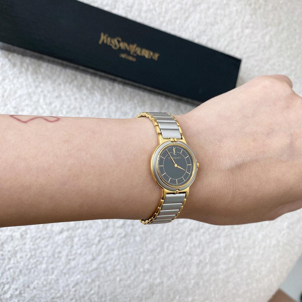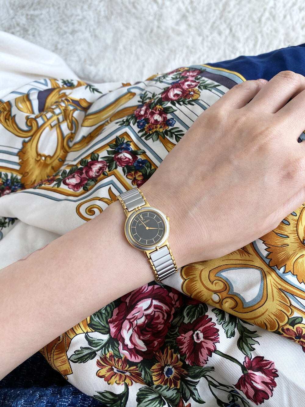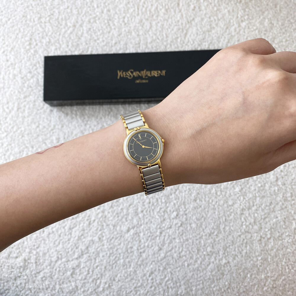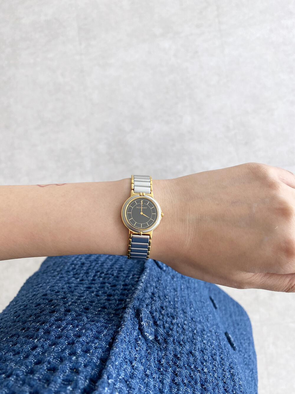 여성용으로 제작된 생로랑 시계이며 쿼츠 무브먼트로 제작되었습니다.
