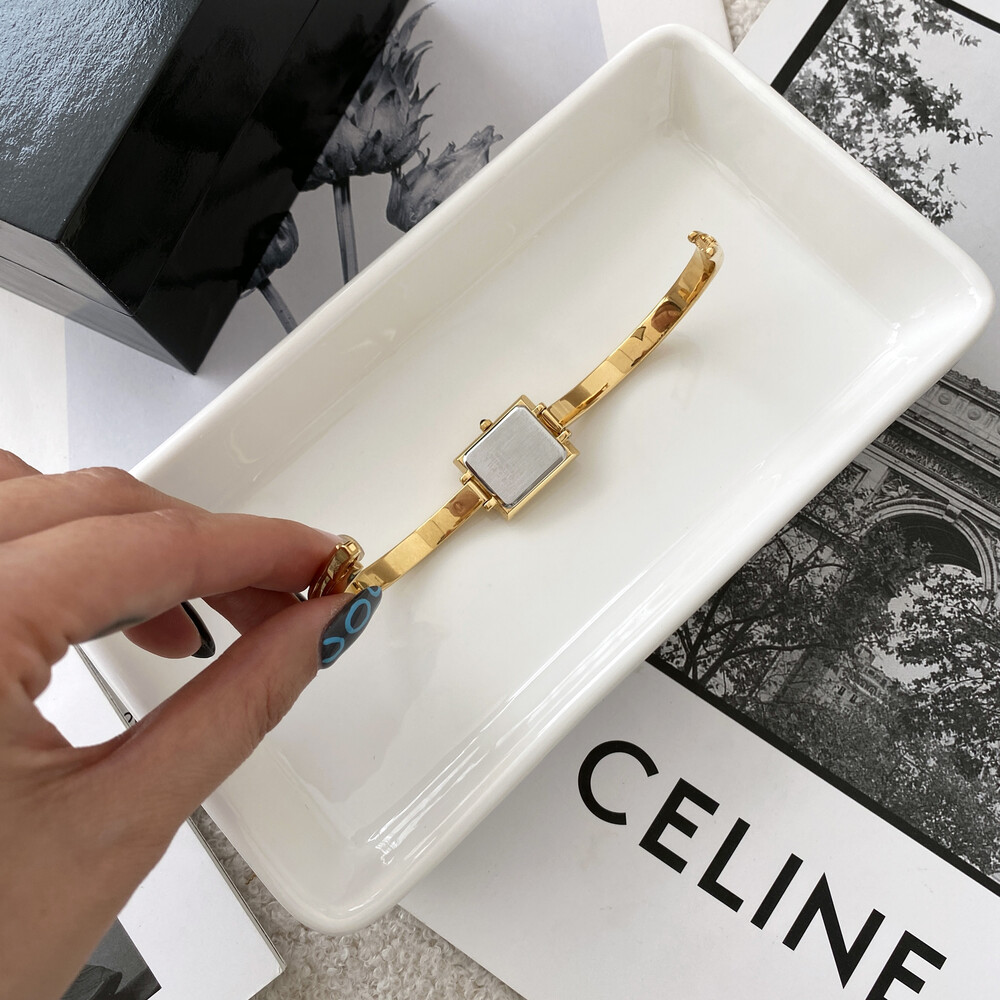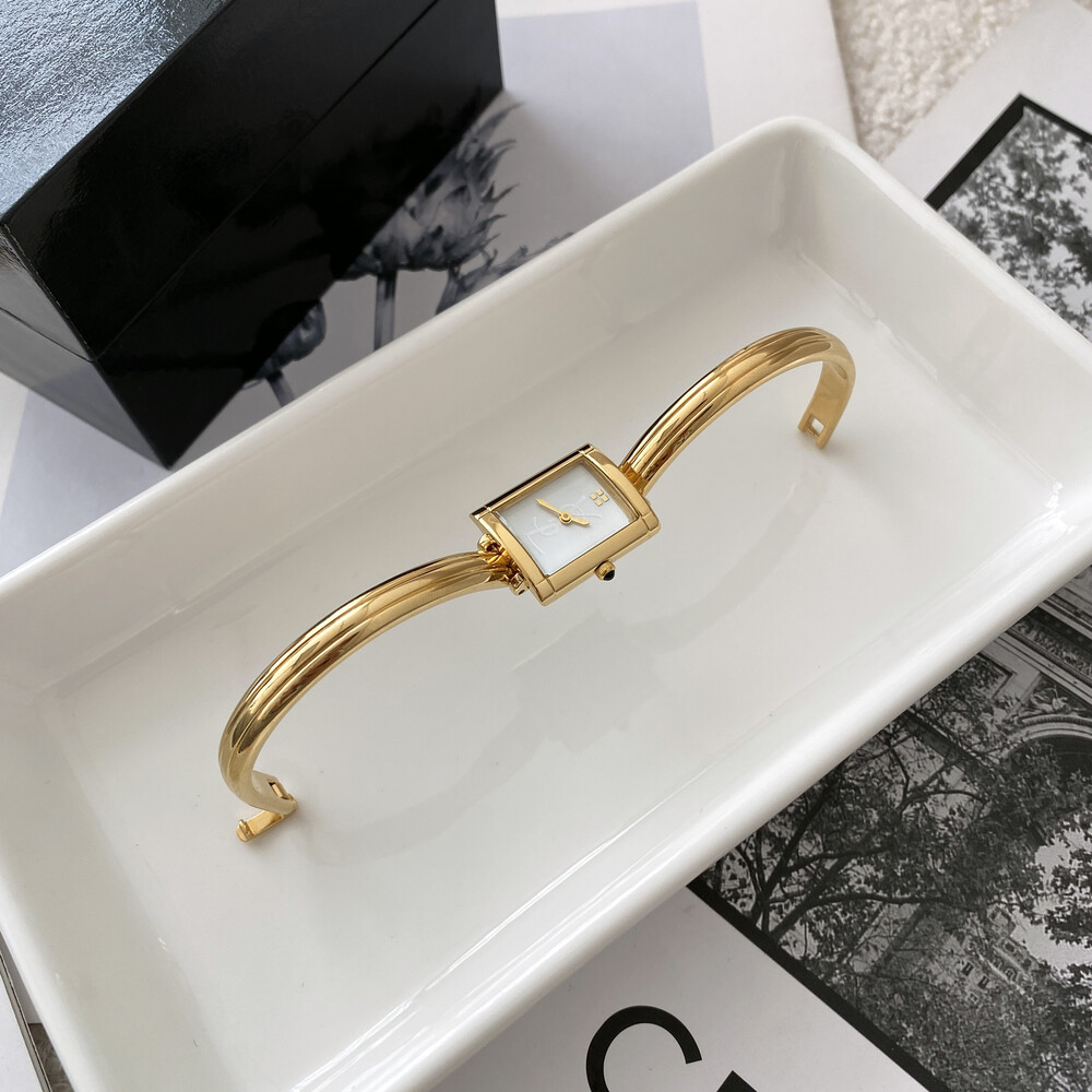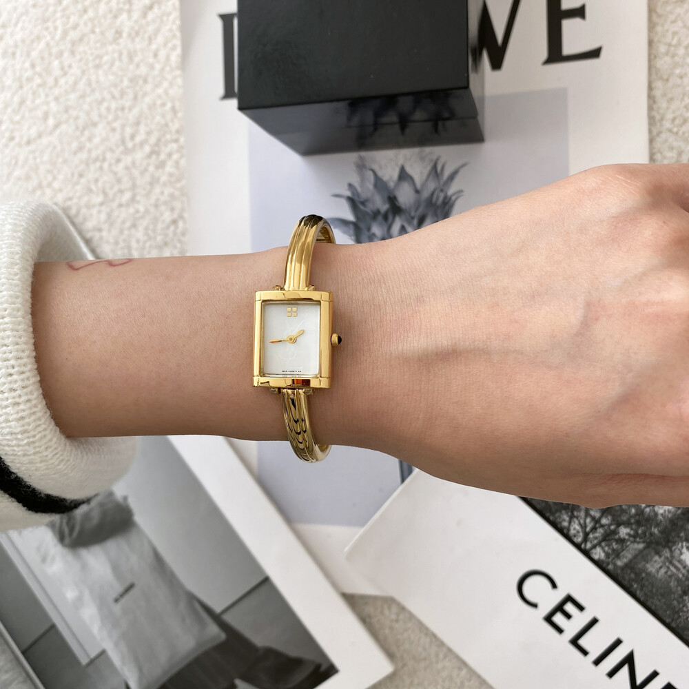 부드러운 골드 톤 스퀘어 타입의 케이스와 크라운 위의 카보숑 장식,