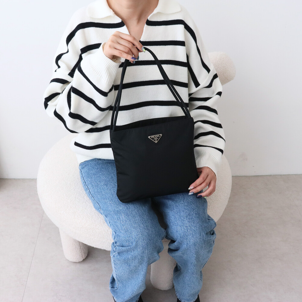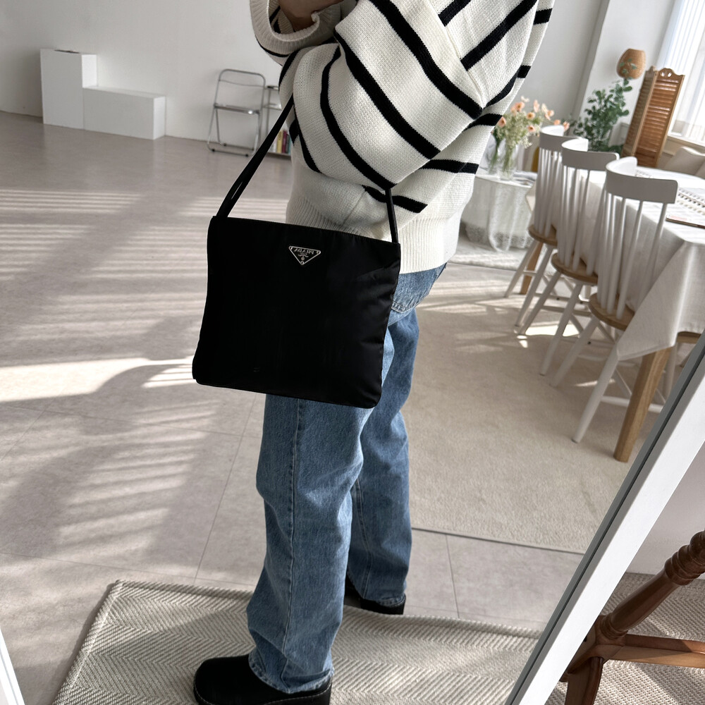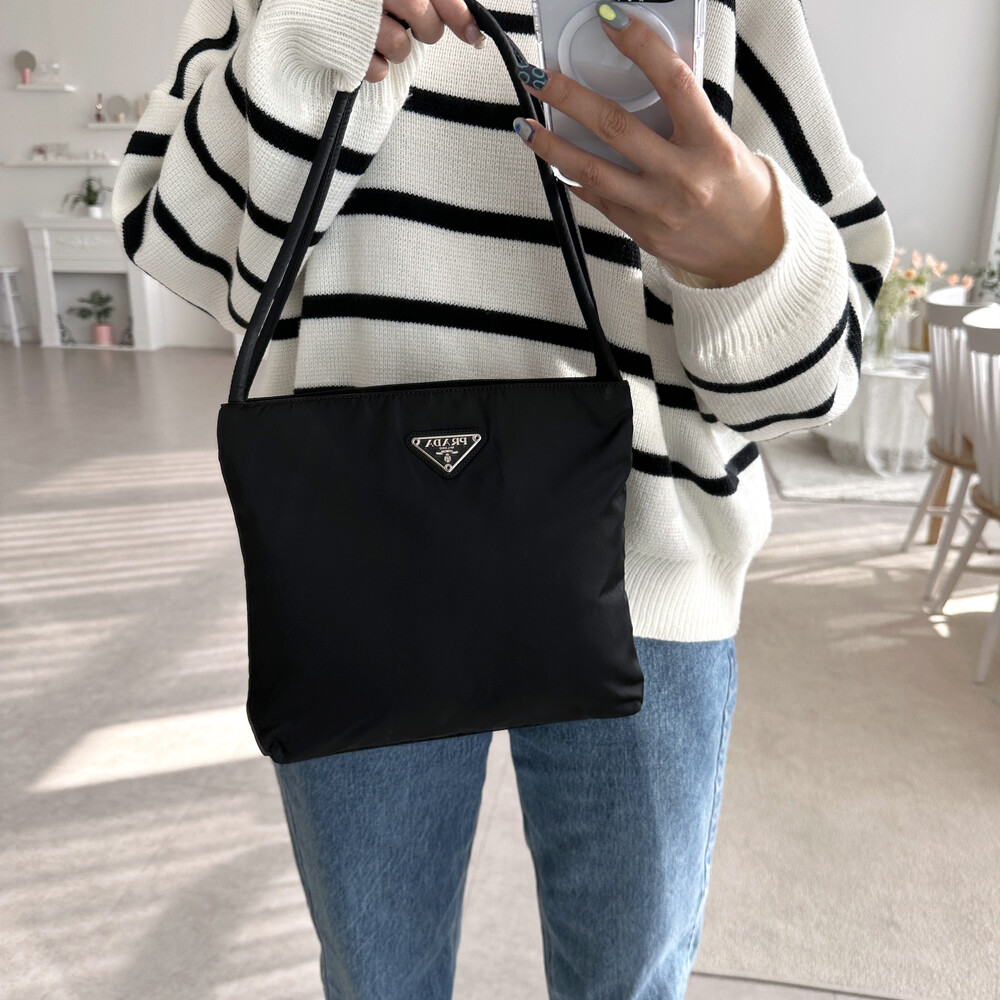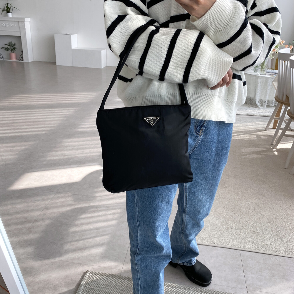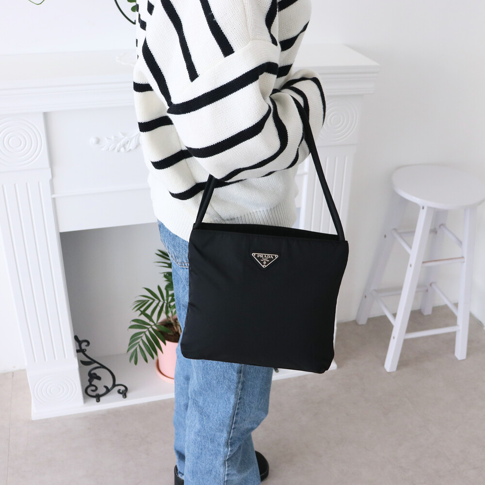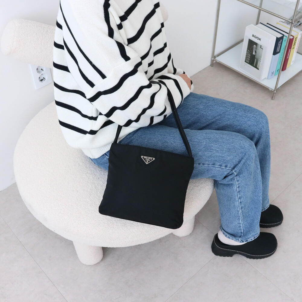 프라다 헤리티지 나일론 바디와 프라다 삼각 플레이트 장식이 매력적인 모델입니다.