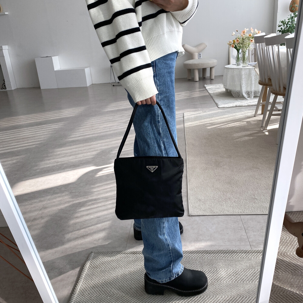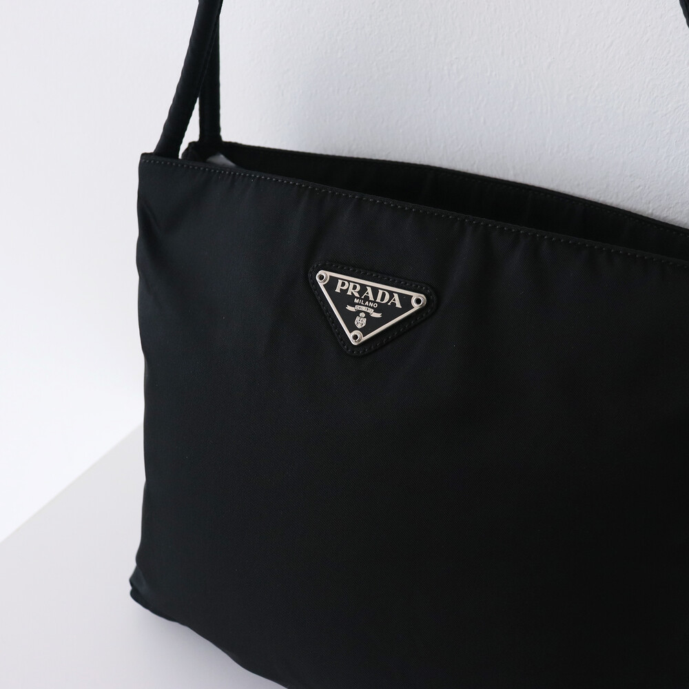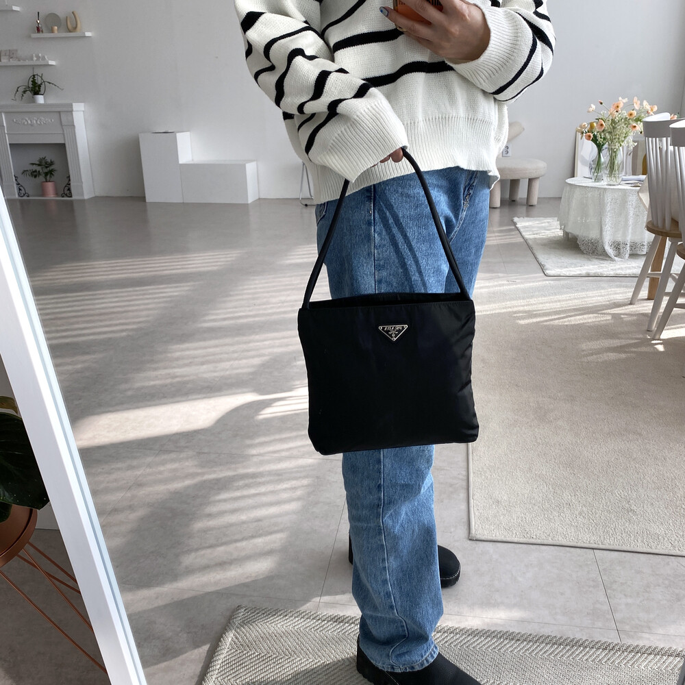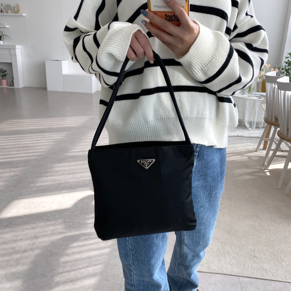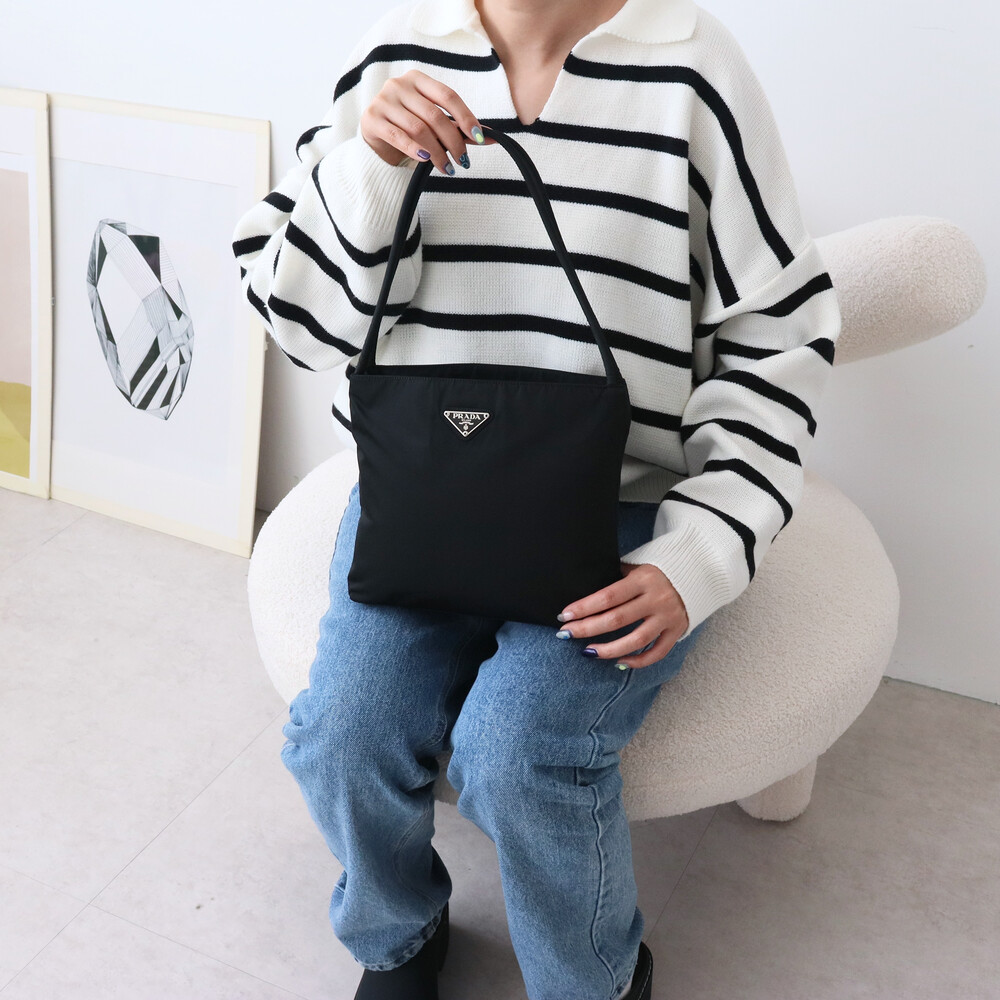 프라다 헤리티지 나일론 바디와 프라다 삼각 플레이트 장식이 매력적인 모델입니다.