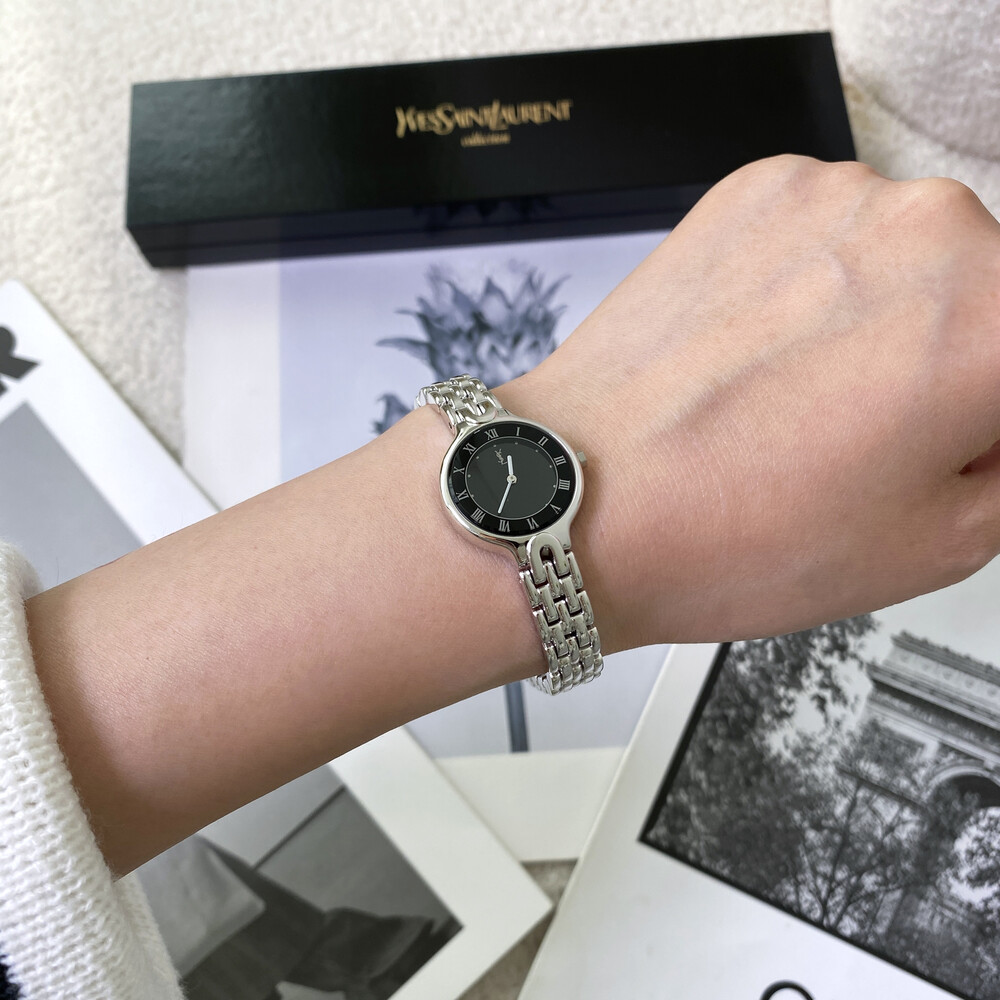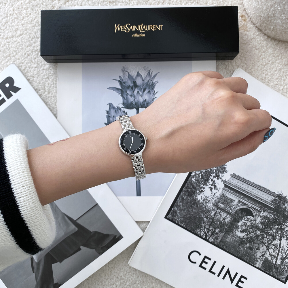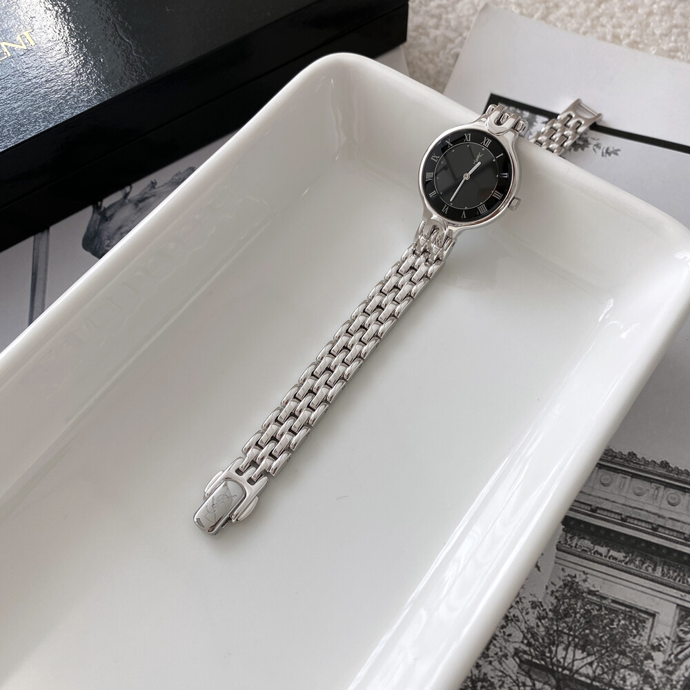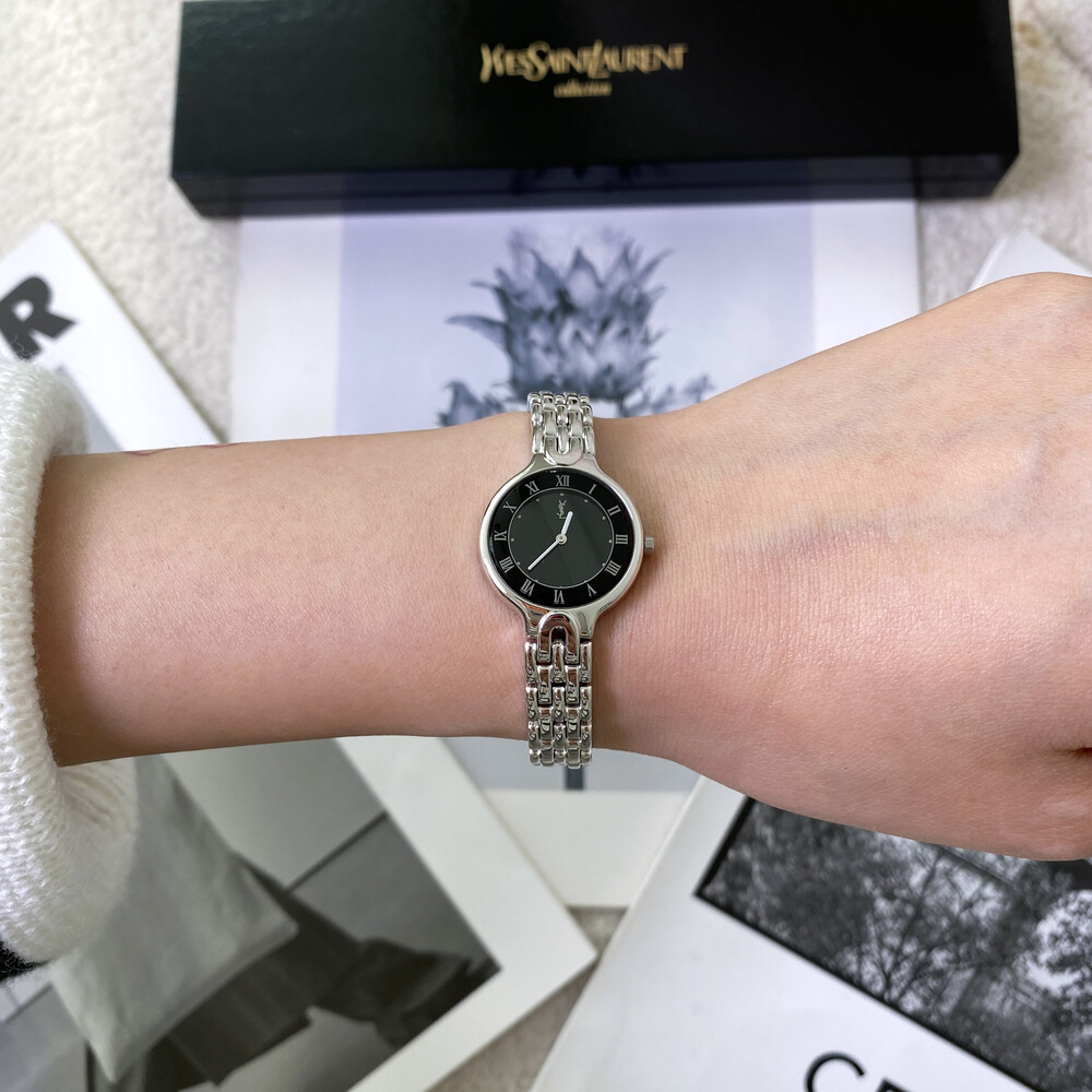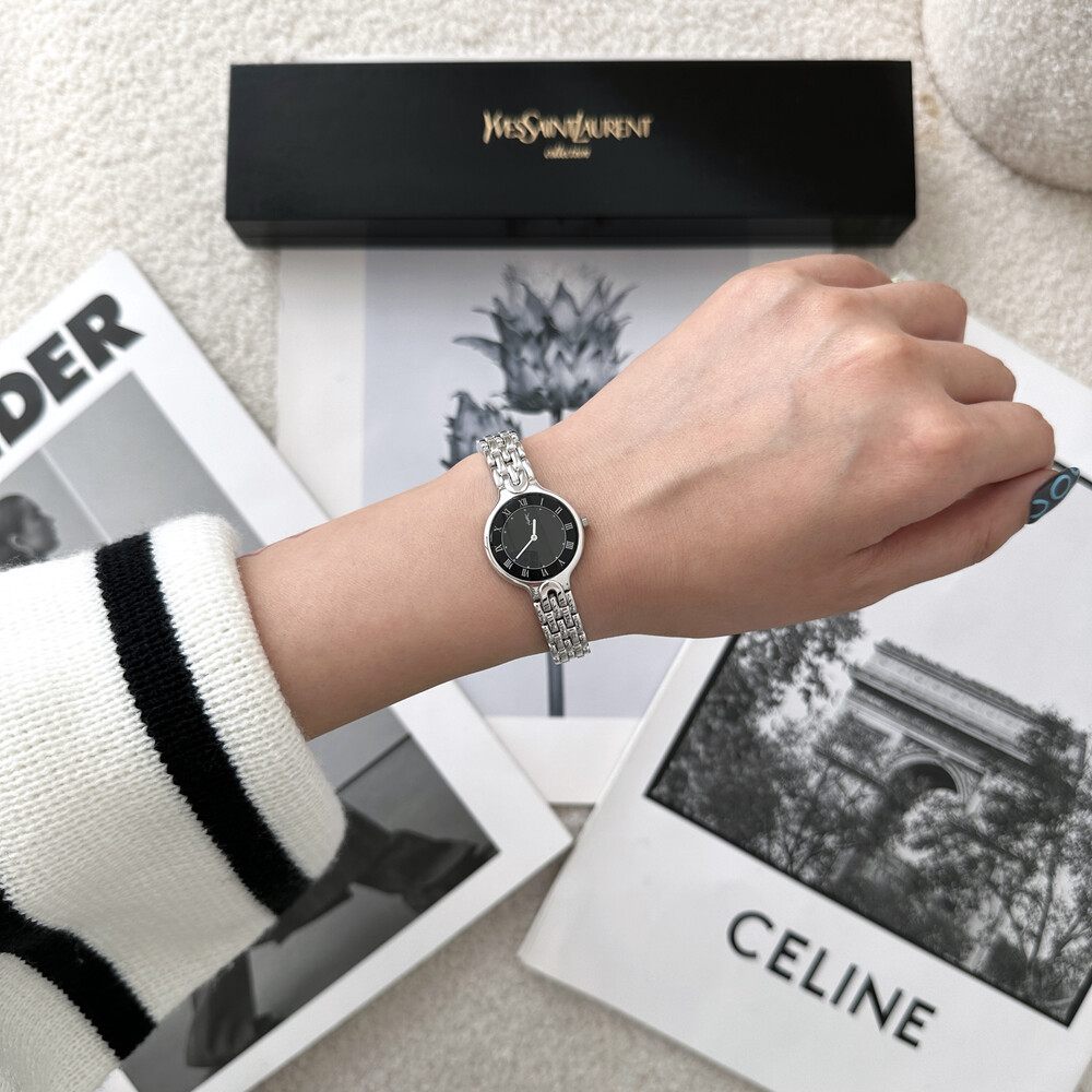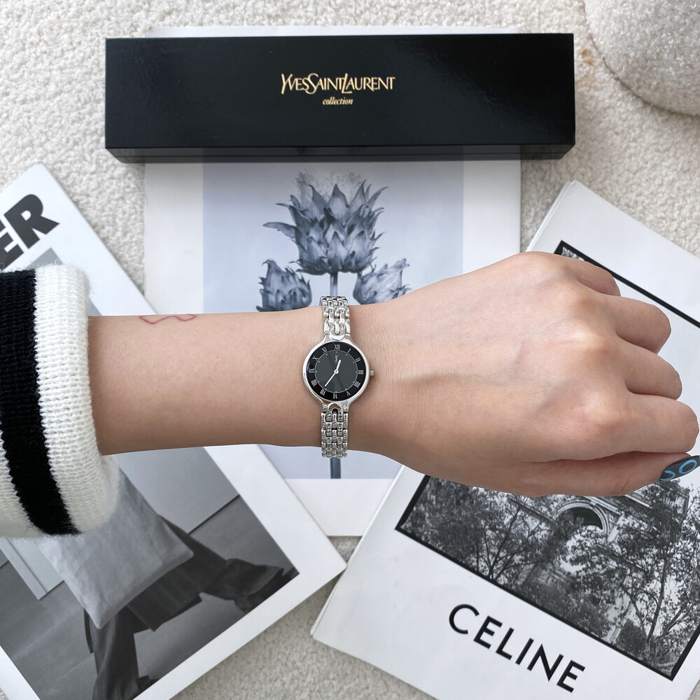 매력적인 라운드 바디와 블랙 다이얼 위를 장식하는 생로랑 YSL 시그니처가 매력적인 모델입니다.
