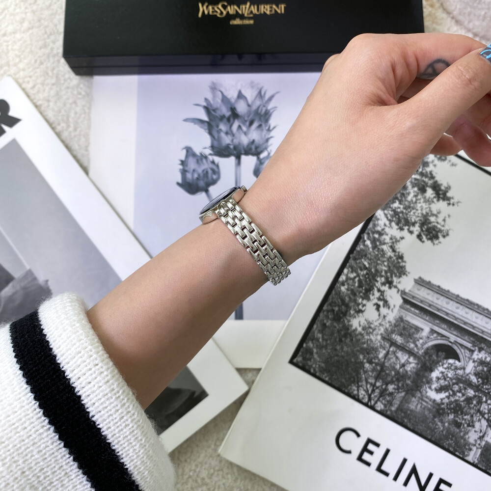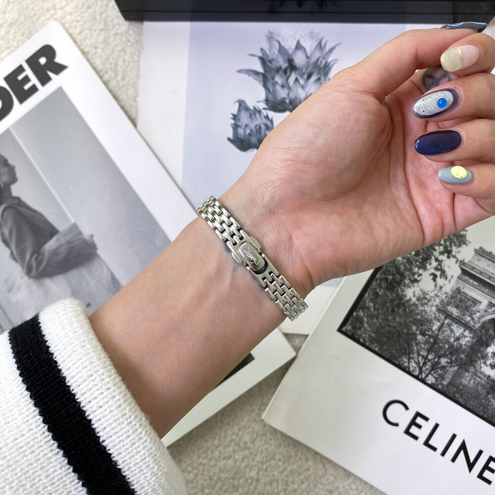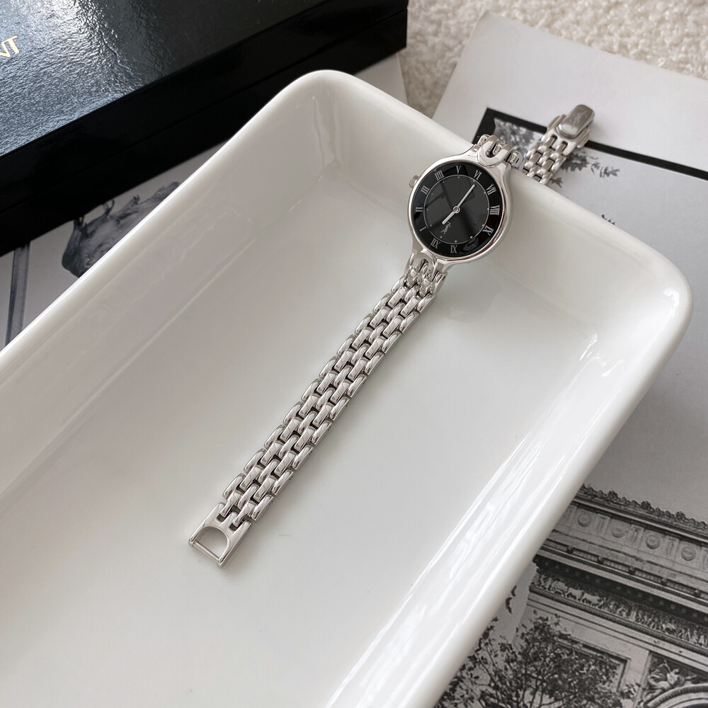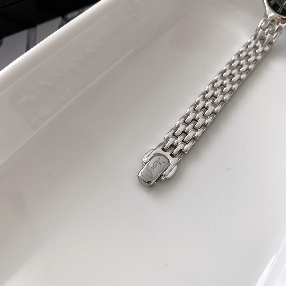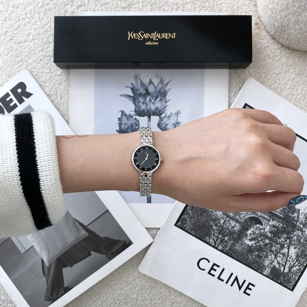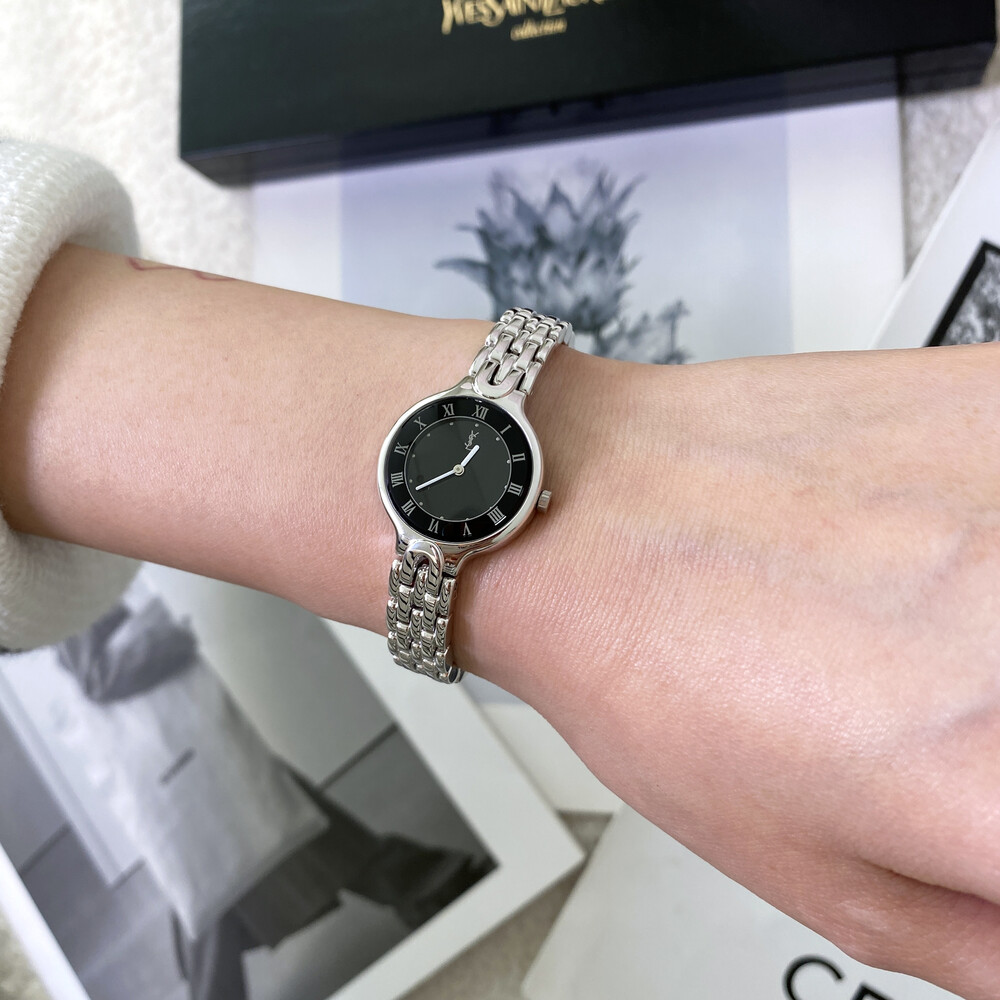 매력적인 라운드 바디와 블랙 다이얼 위를 장식하는 생로랑 YSL 시그니처가 매력적인 모델입니다.