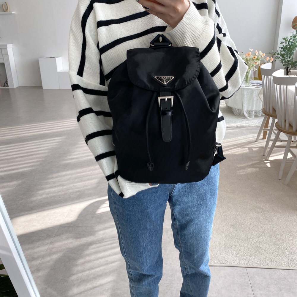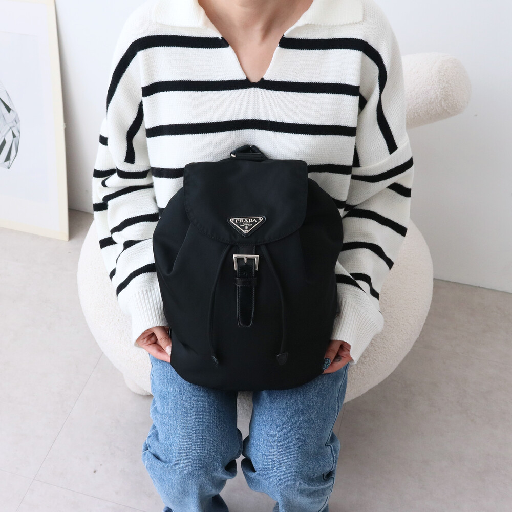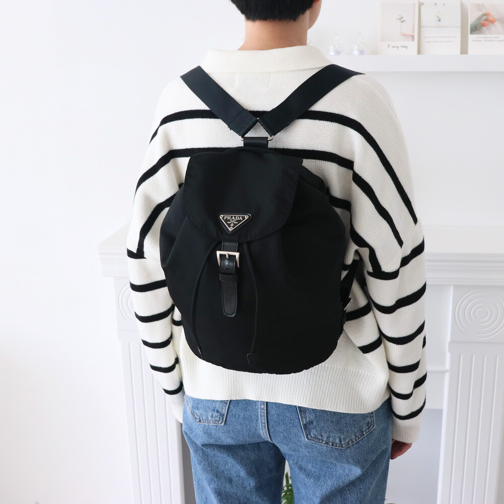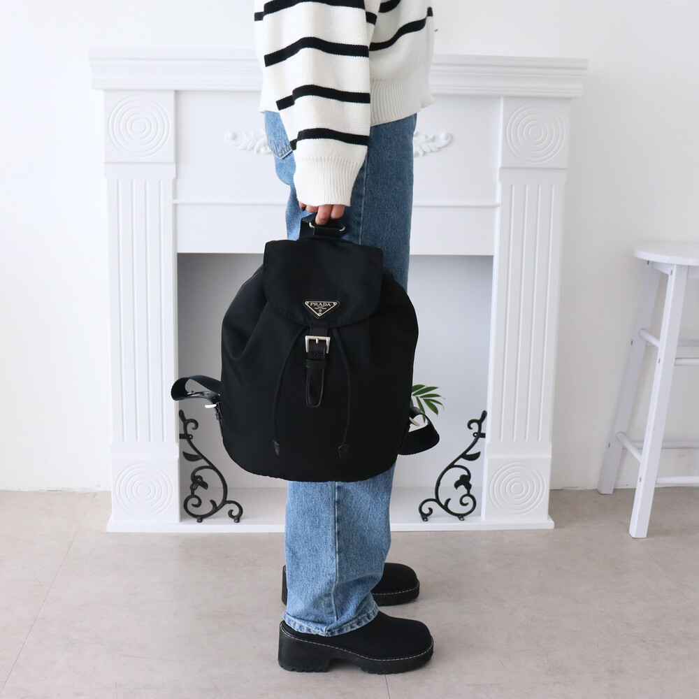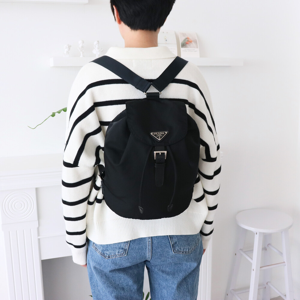 프라다 헤리티지 나일론 바디와 프라다 삼각 플레이트 장식이 매력적인 모델입니다.