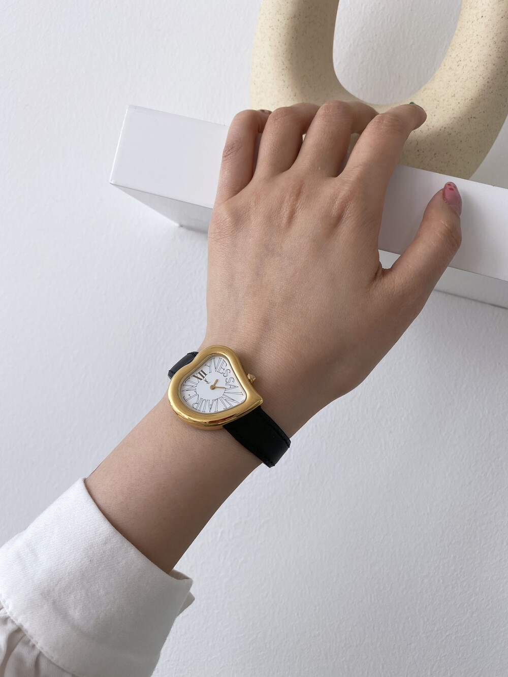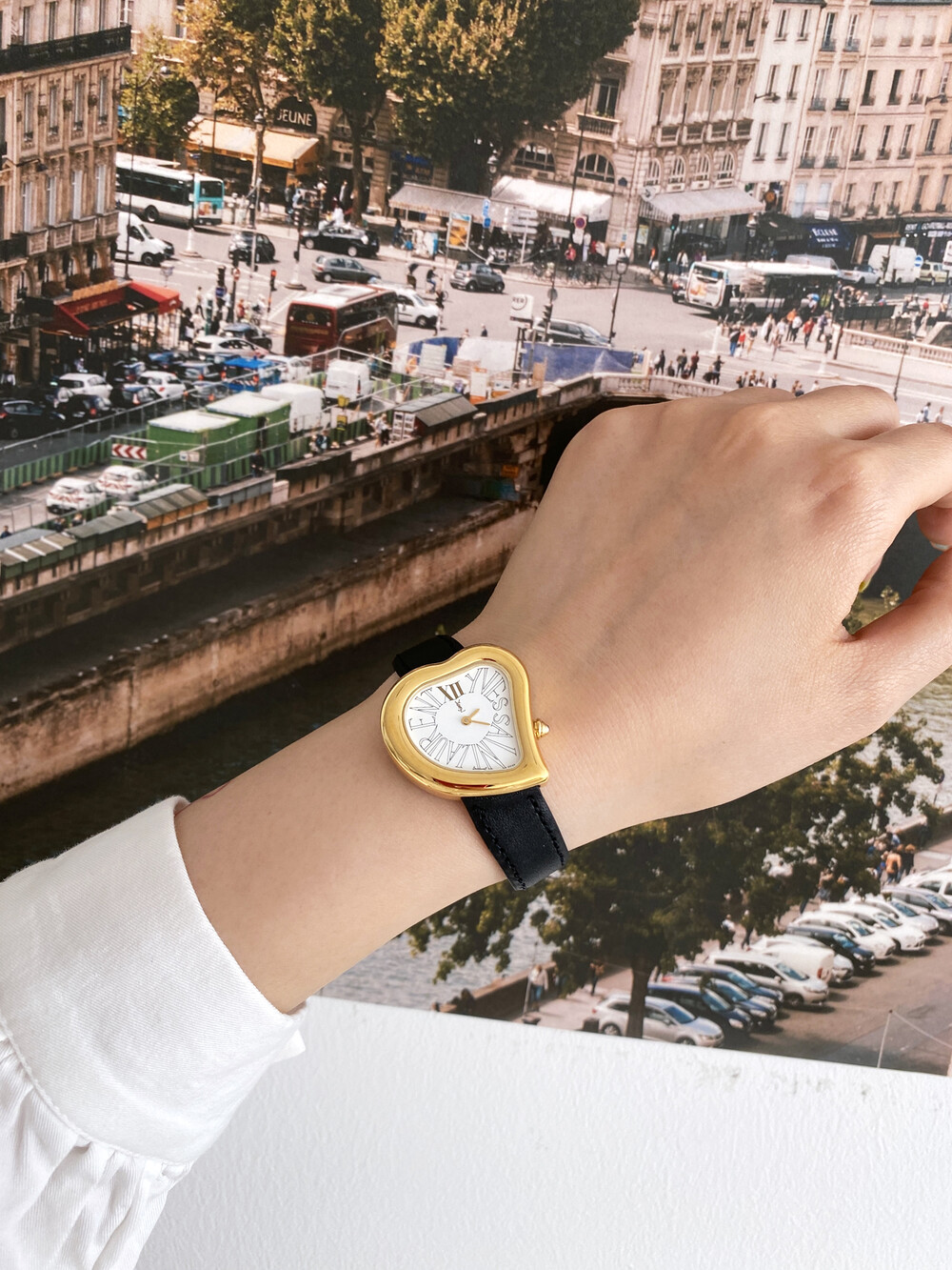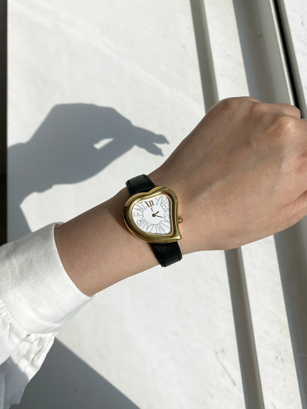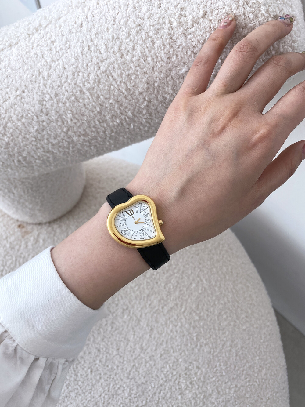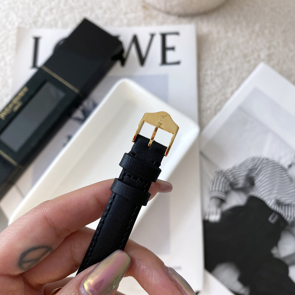 그리고 화이트 다이얼 위를 장식하는 생로랑 시그니처가 매력적인 모델입니다.