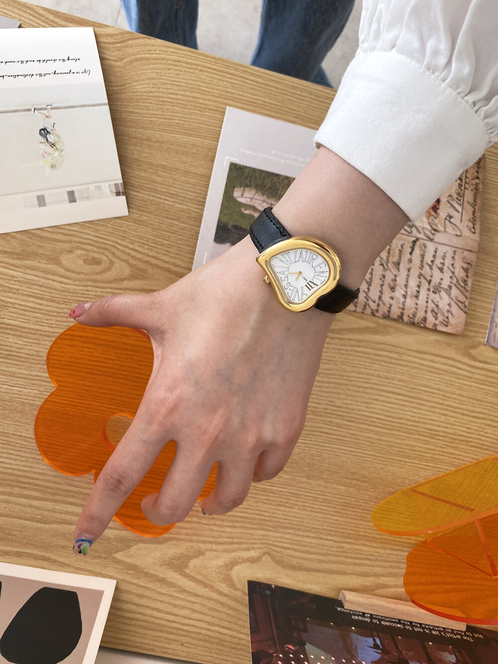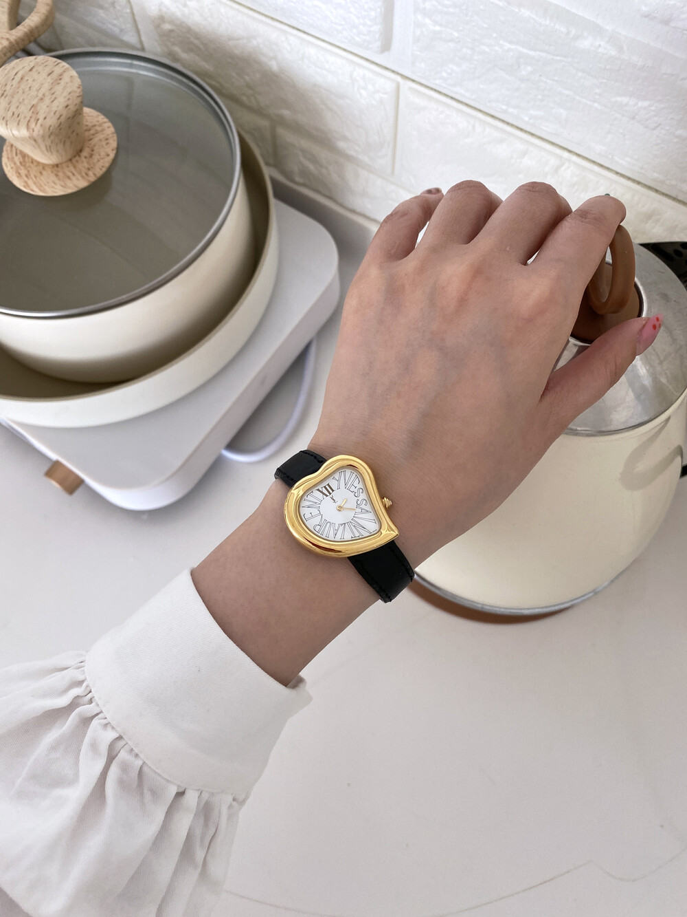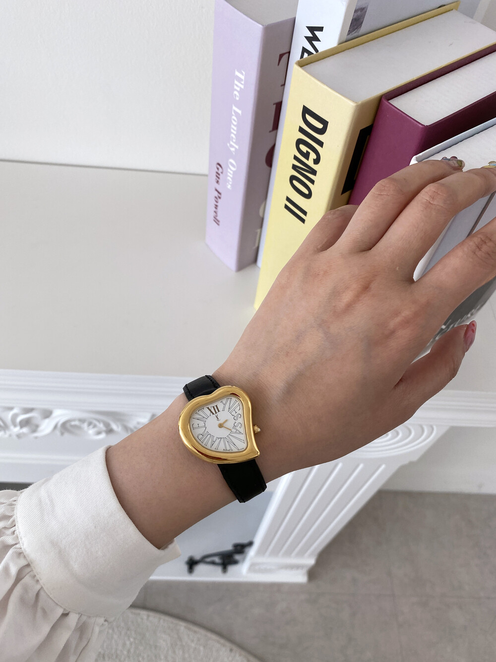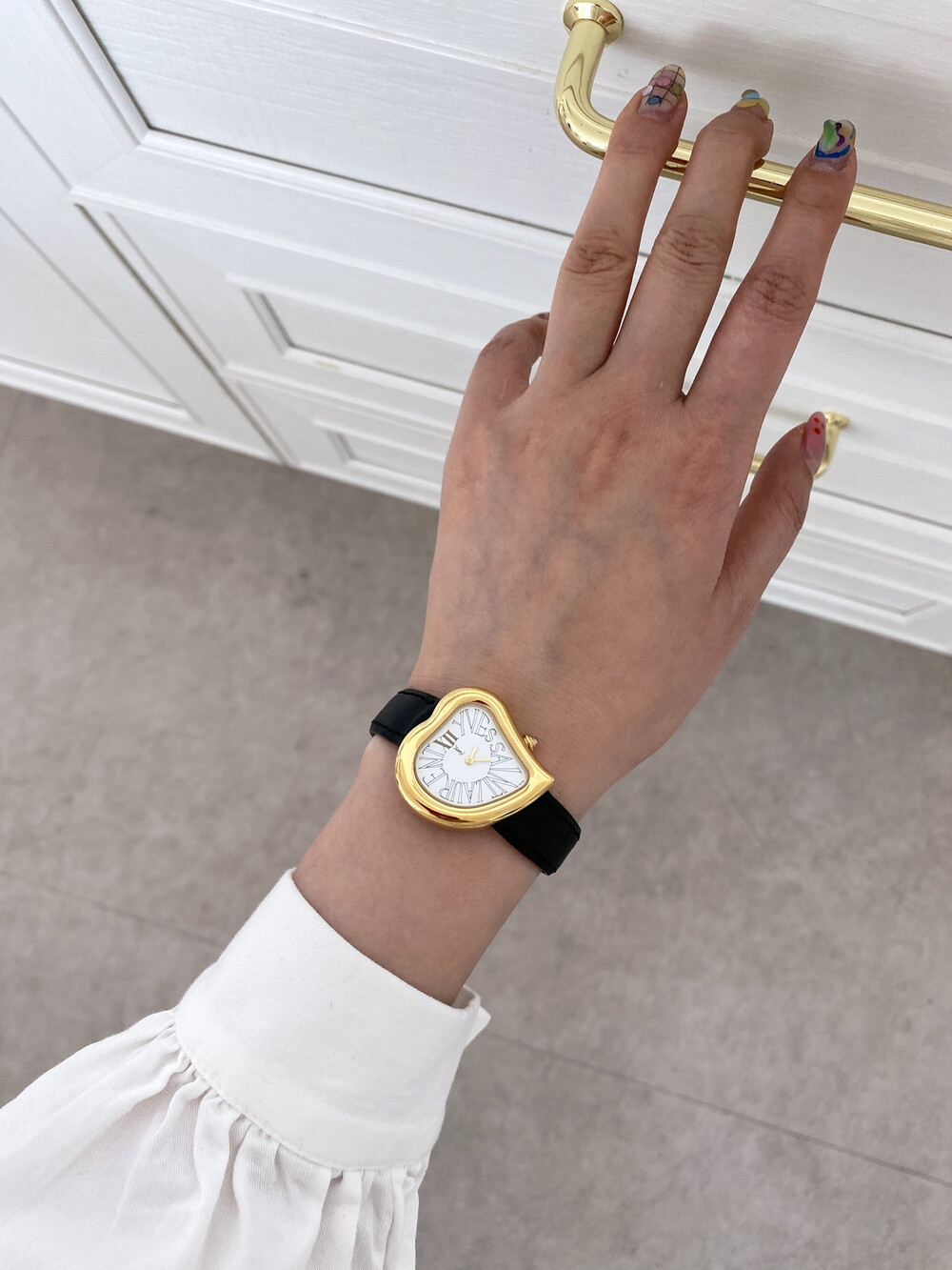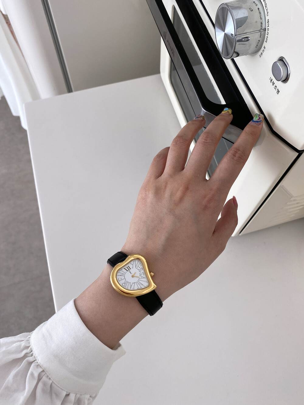 그리고 화이트 다이얼 위를 장식하는 생로랑 시그니처가 매력적인 모델입니다.