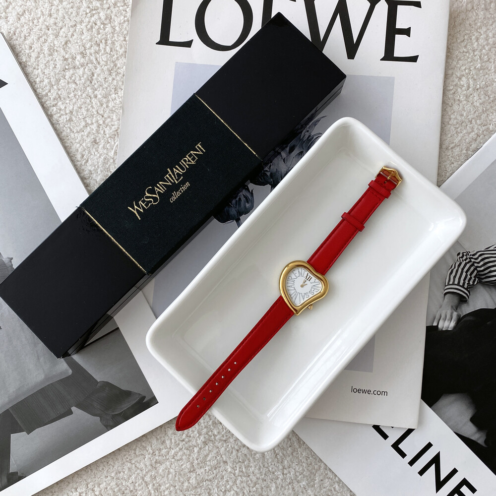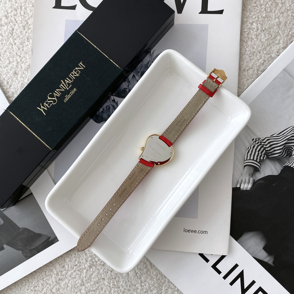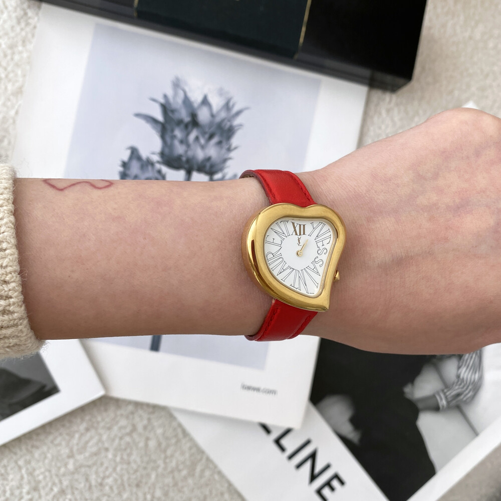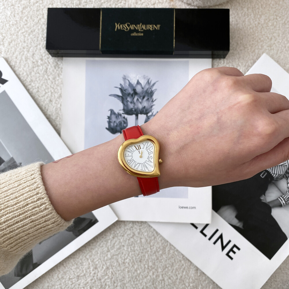 입생로랑 40주년을 기념하여 제작된 모델로 골드 톤 하트 케이스와 가죽 밴드,