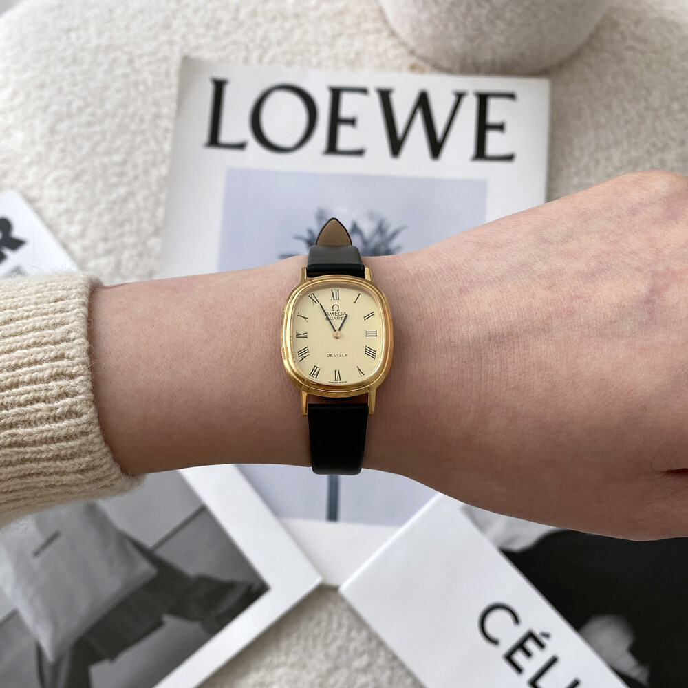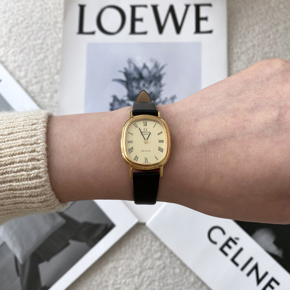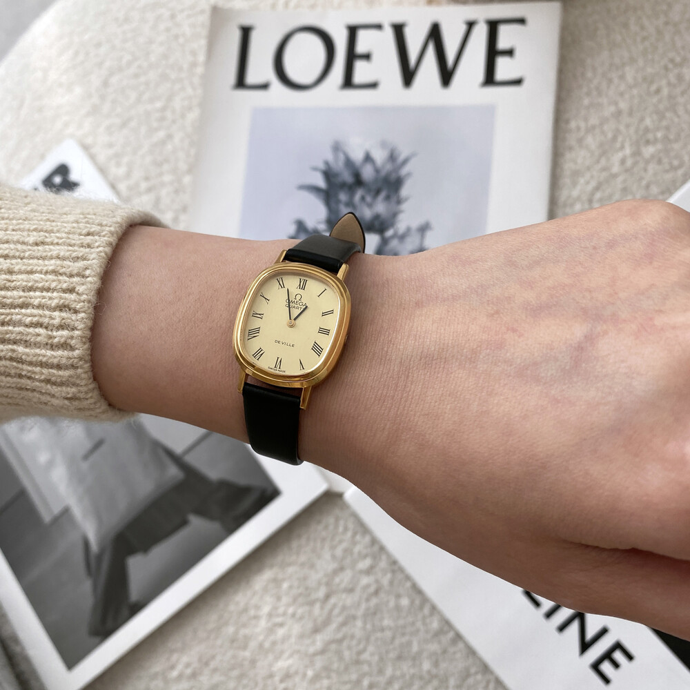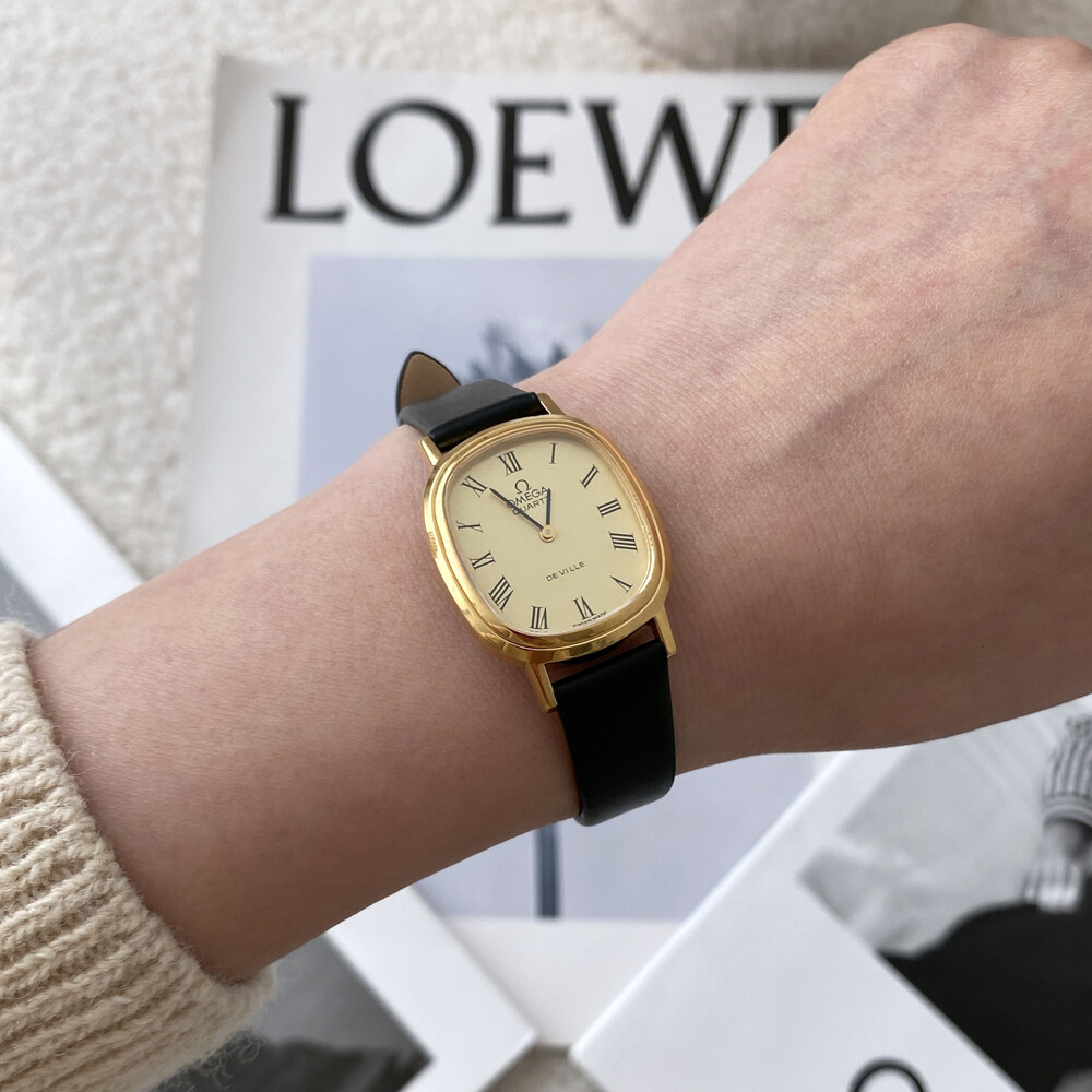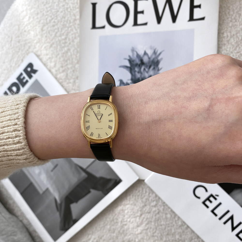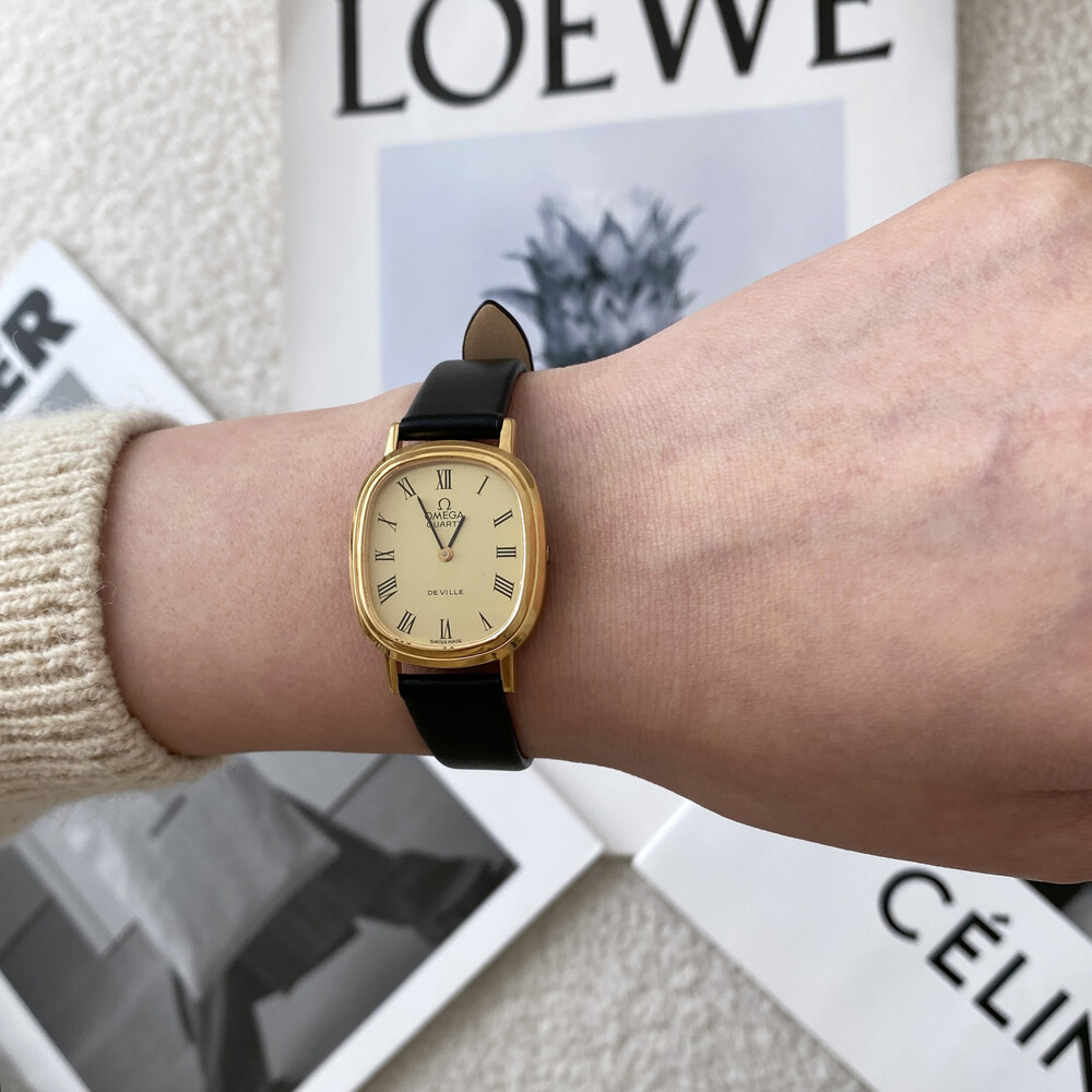 1980년도에 제작된 오메가 드빌 모델로 부드러운 타원형 케이스와 다이얼 위를 장식하는 로마 인덱스와