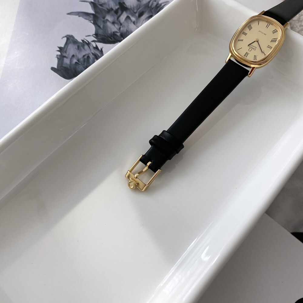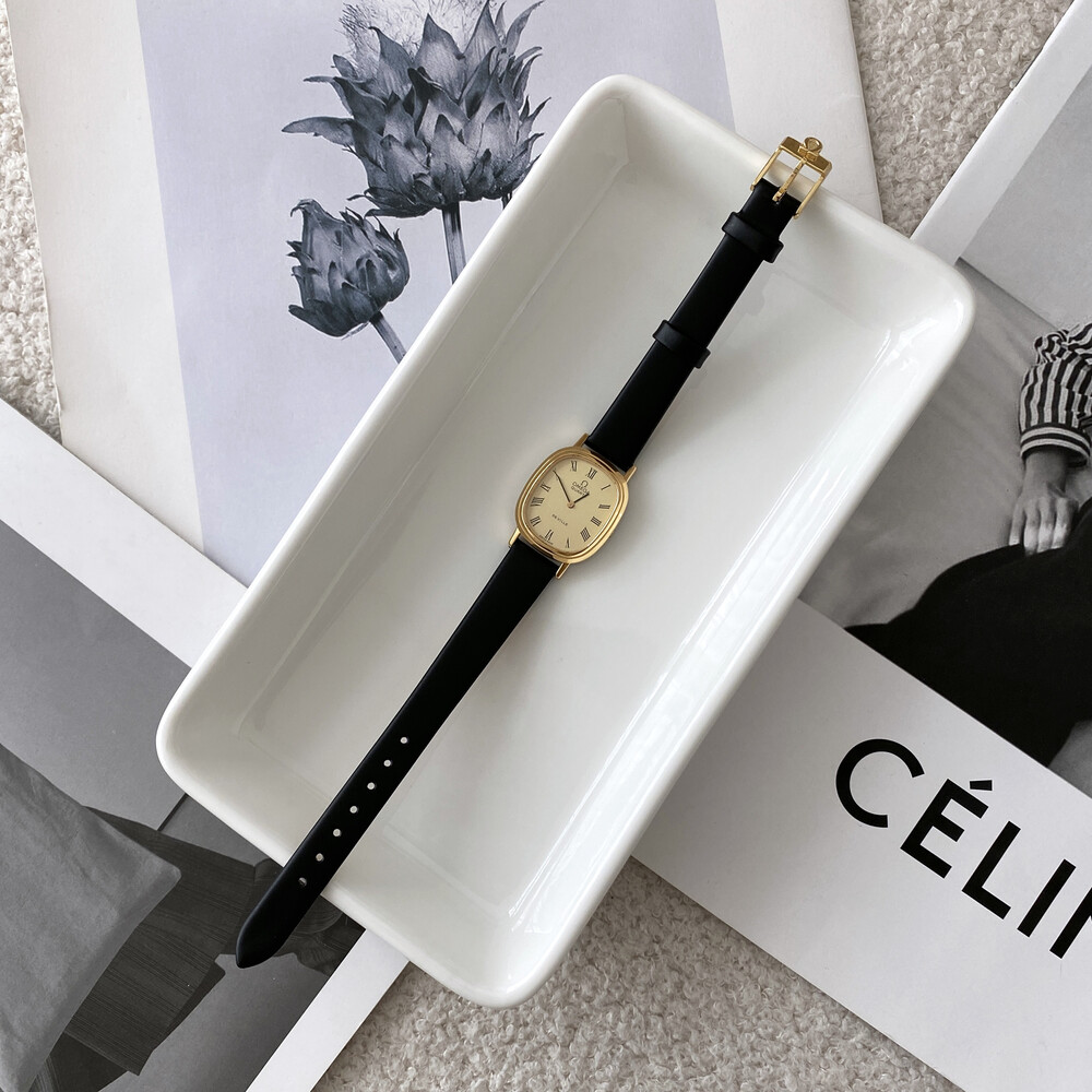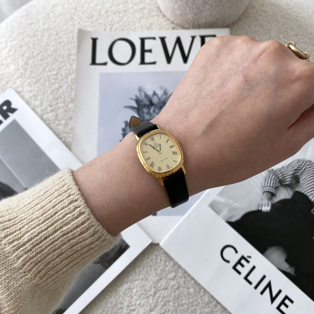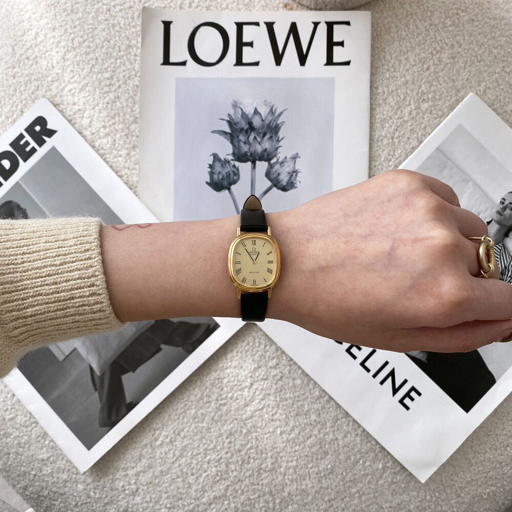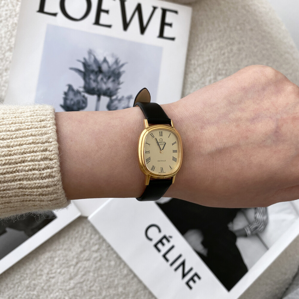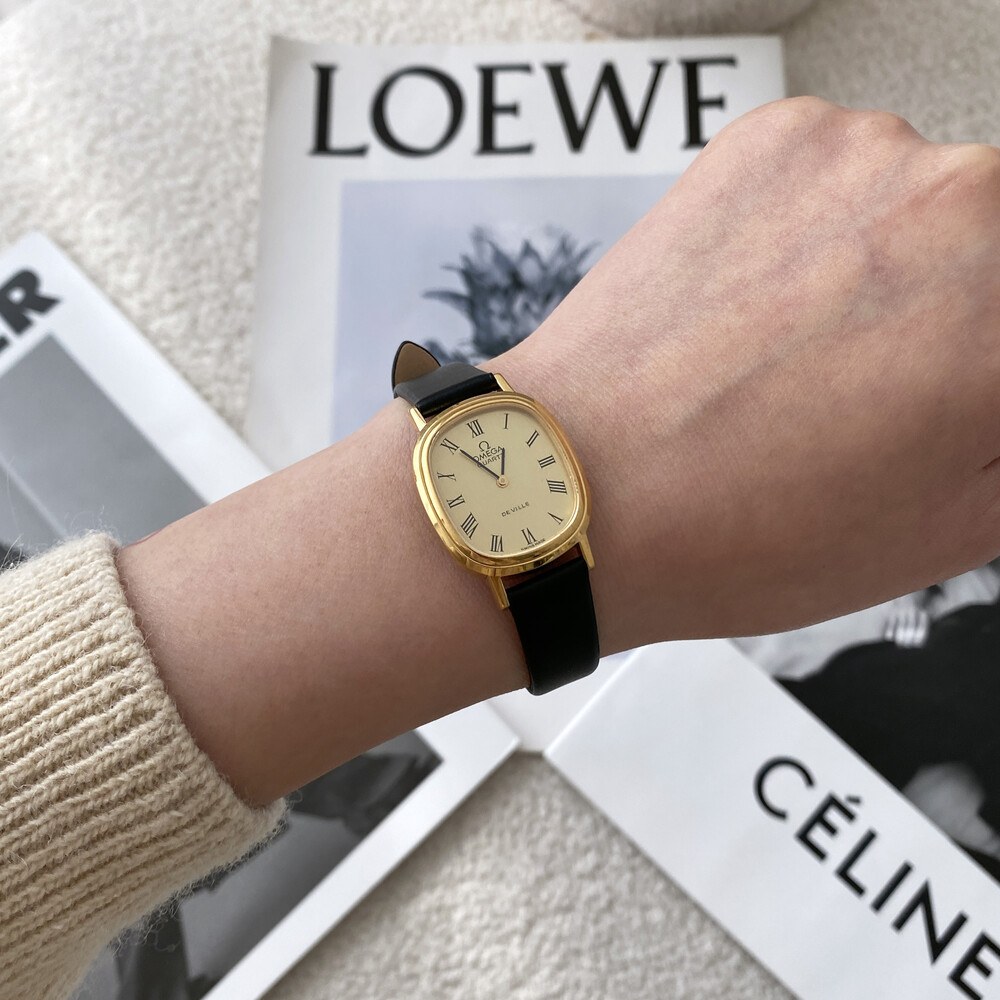 1980년도에 제작된 오메가 드빌 모델로 부드러운 타원형 케이스와 다이얼 위를 장식하는 로마 인덱스와
