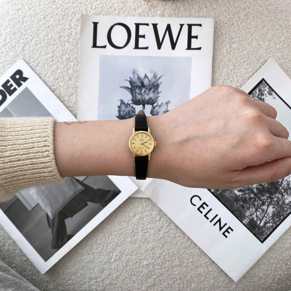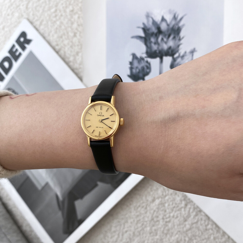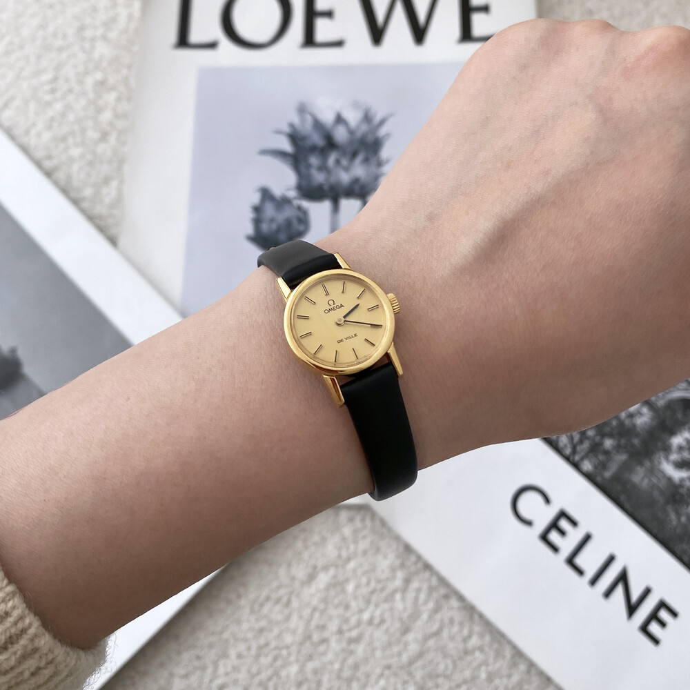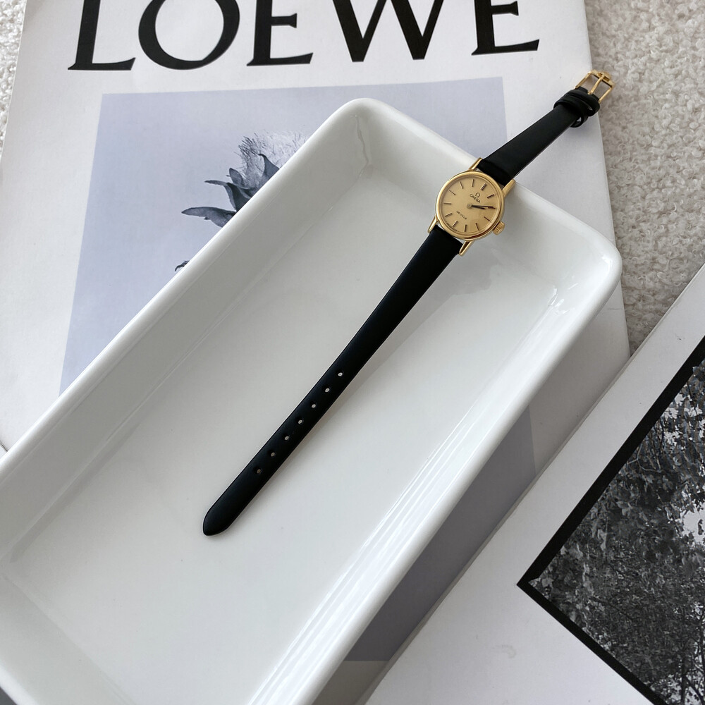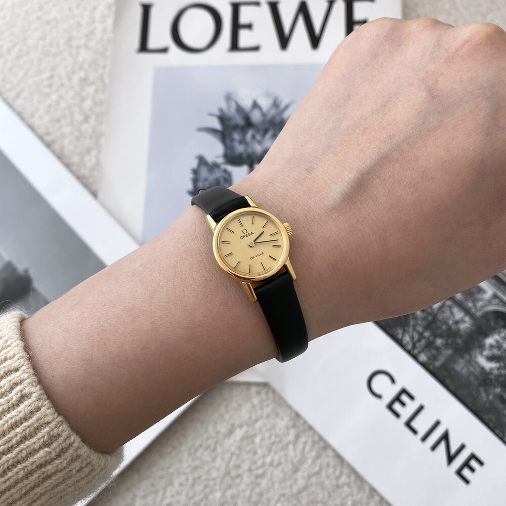 1977년도에 출시된 오메가 드빌 모델로 부드러운 골드톤 케이스,