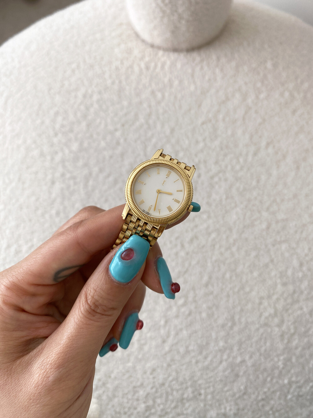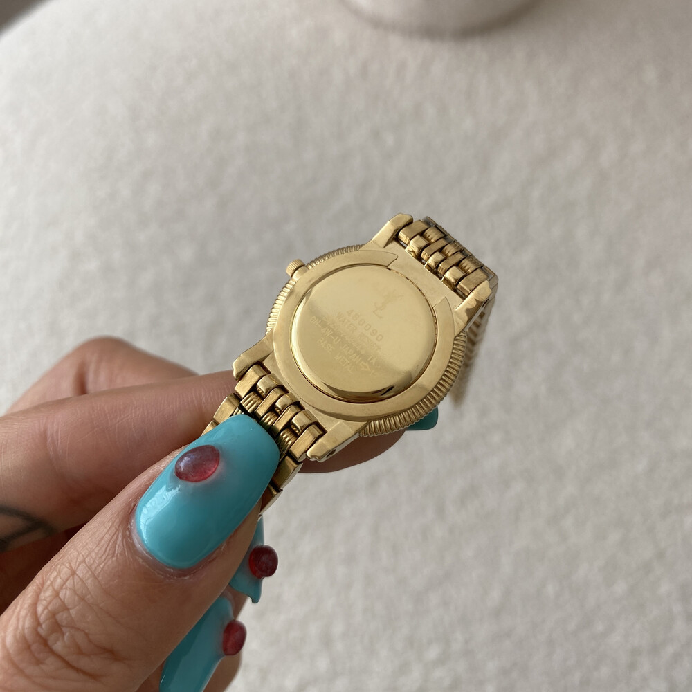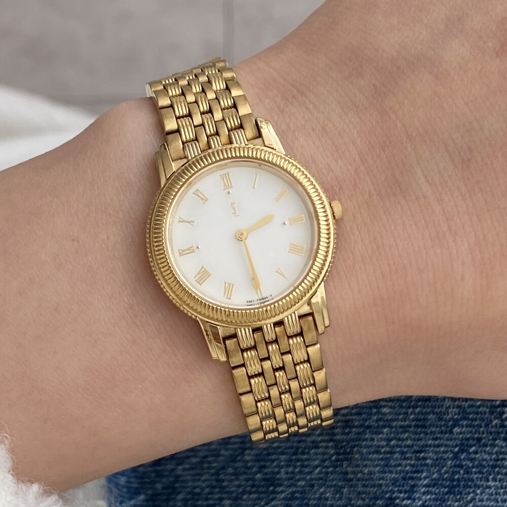 부드러운 골드 톤 케이스와 다이얼 위를 장식하는 생로랑 YSL 시그니처가