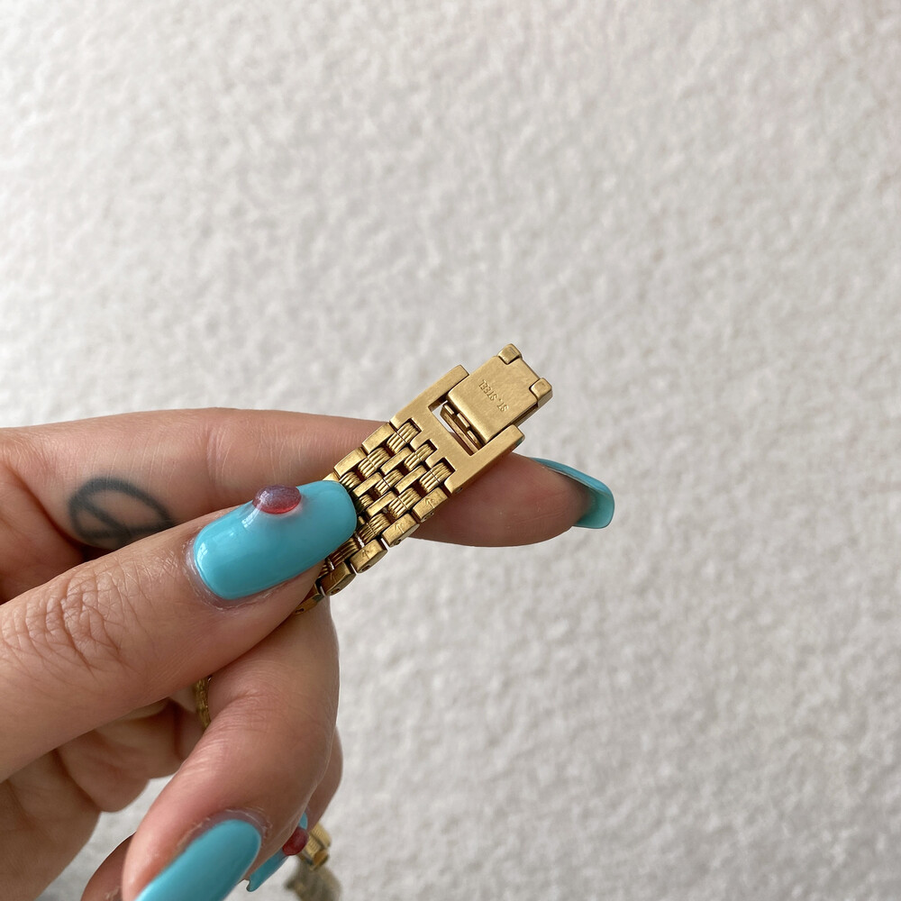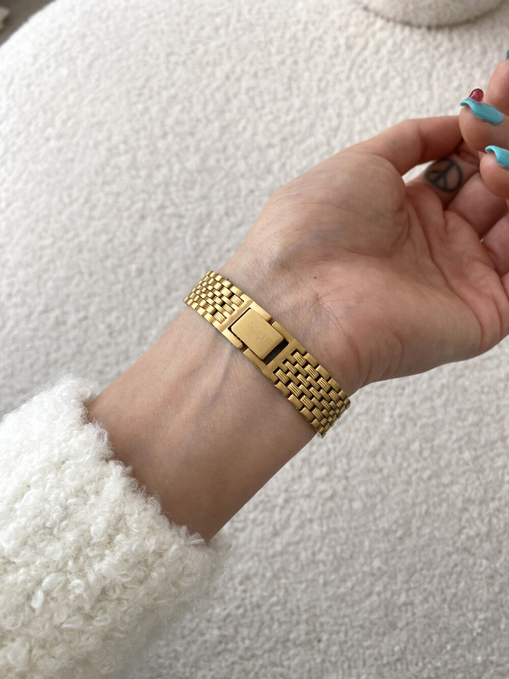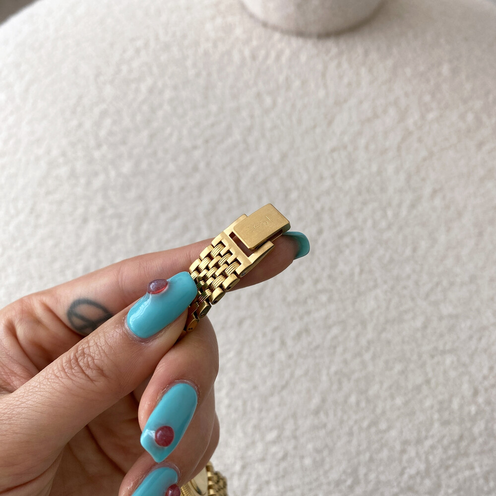 부드러운 골드 톤 케이스와 다이얼 위를 장식하는 생로랑 YSL 시그니처가