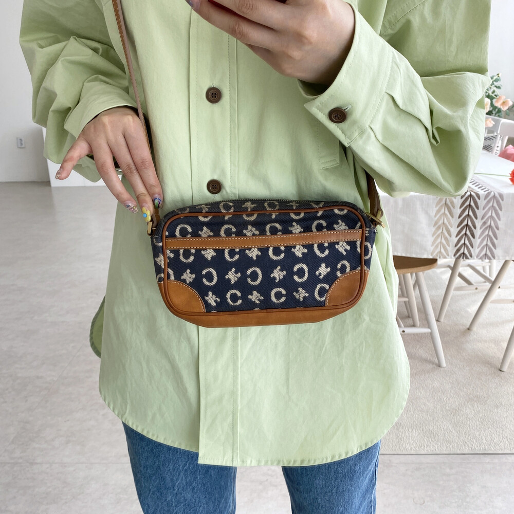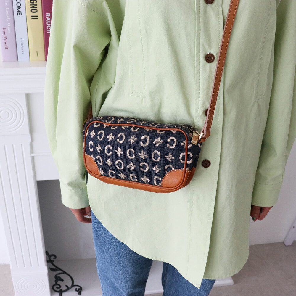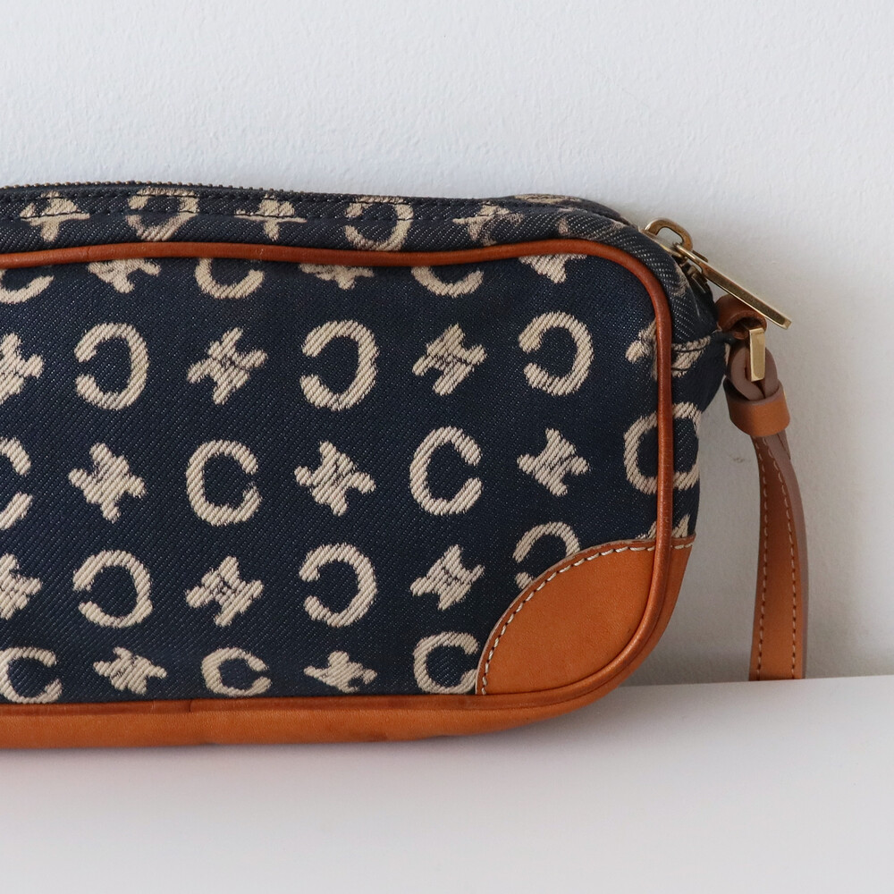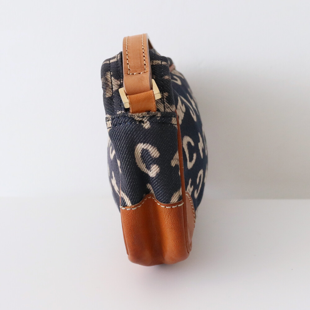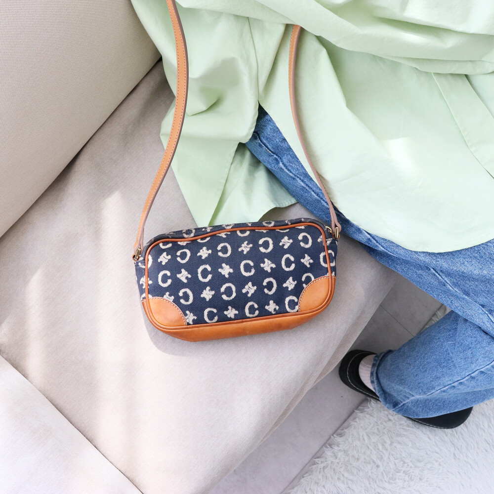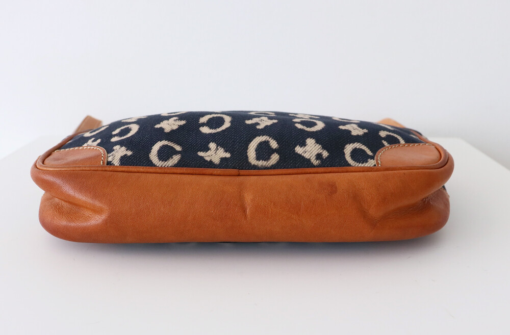 라이트 브라운 가죽 트리밍과 셀린느 시그니처 트리오페 패턴이 어우러진 데님 캔버스 소재로 제작되어,