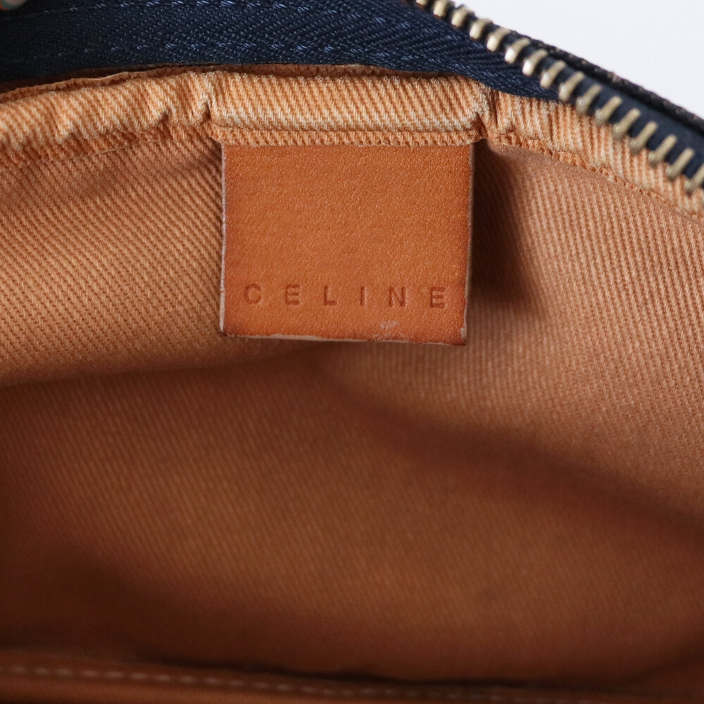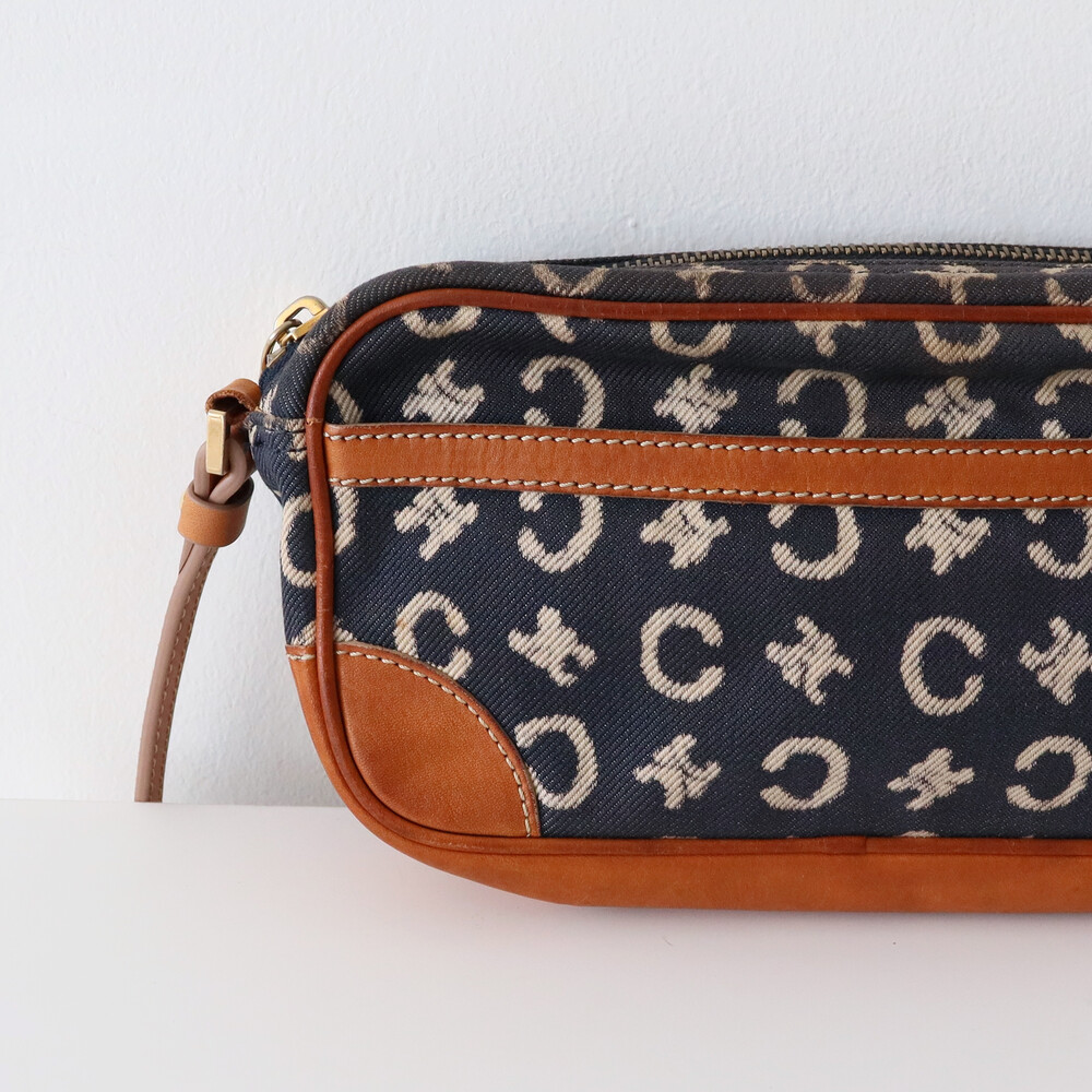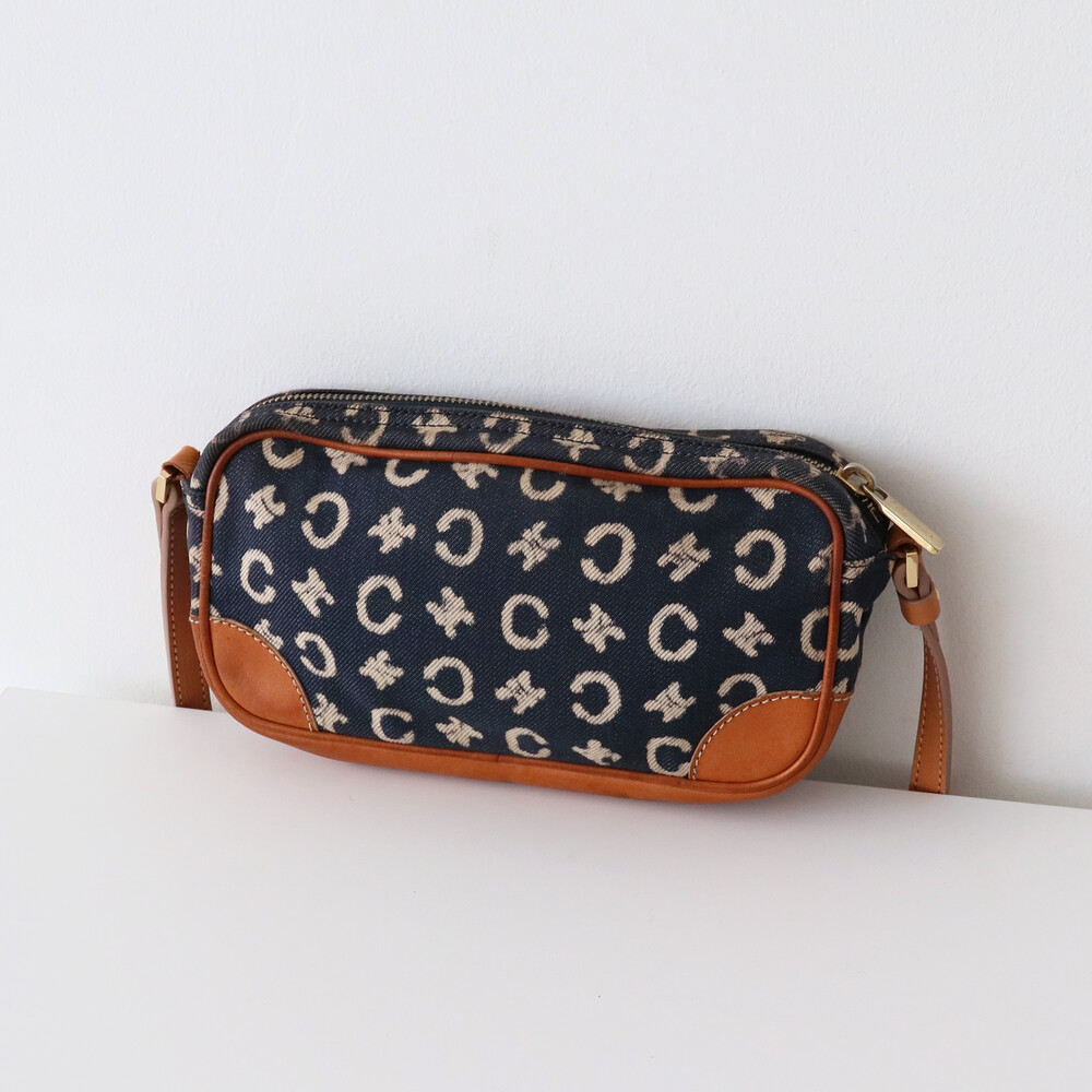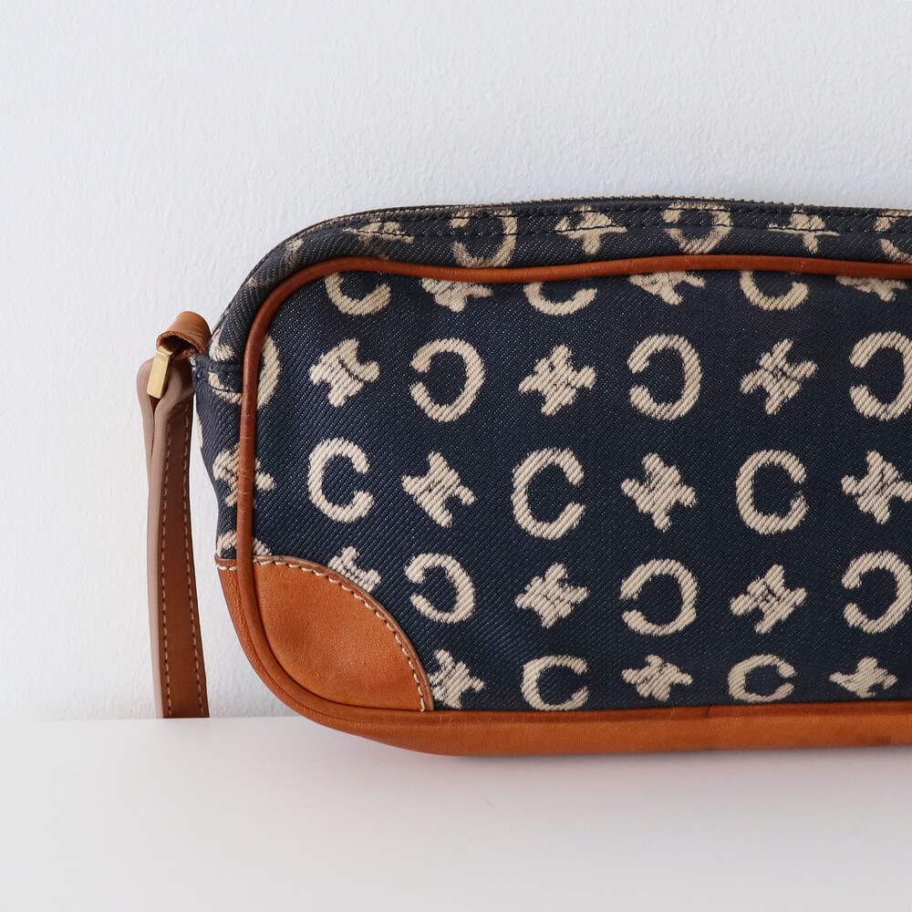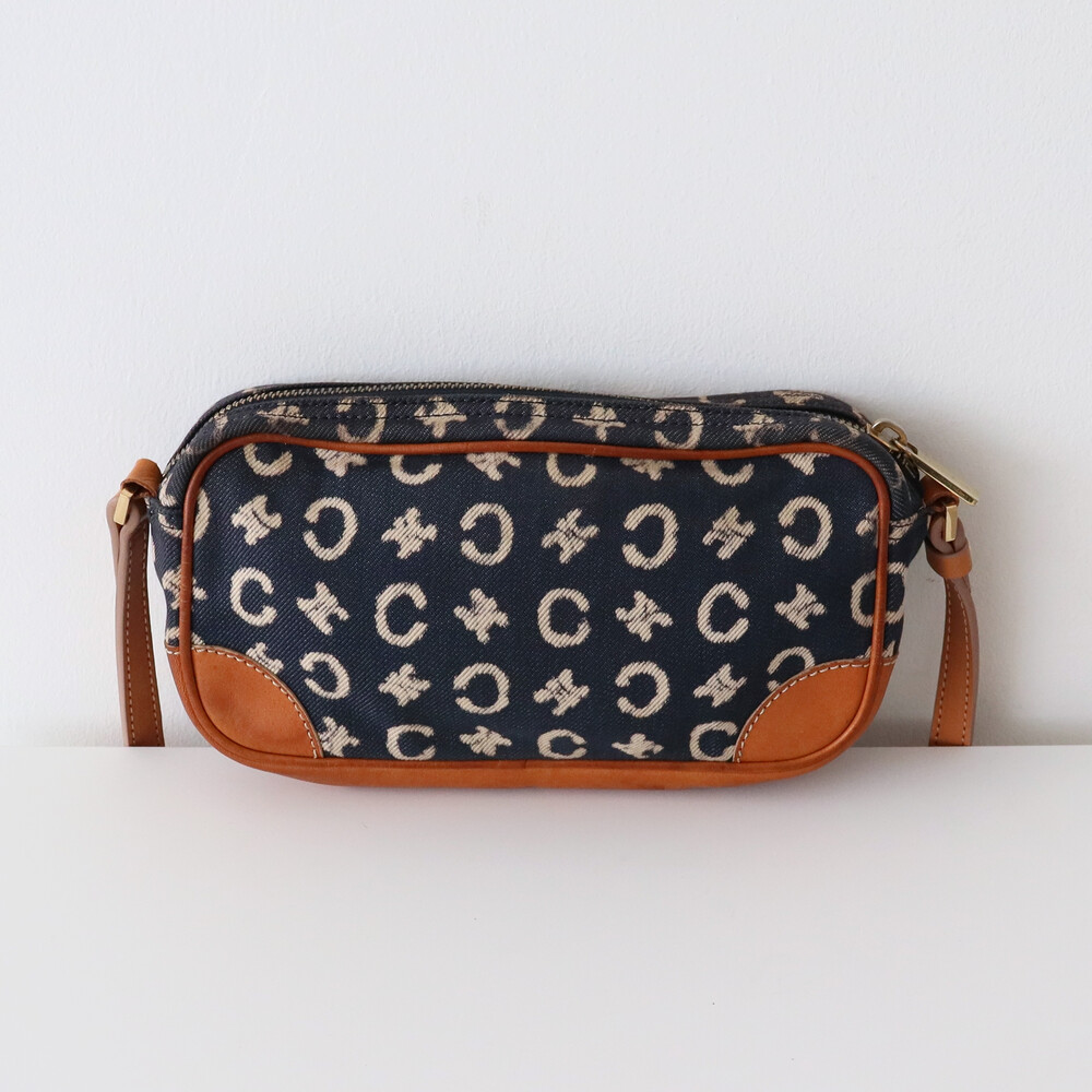 라이트 브라운 가죽 트리밍과 셀린느 시그니처 트리오페 패턴이 어우러진 데님 캔버스 소재로 제작되어,
