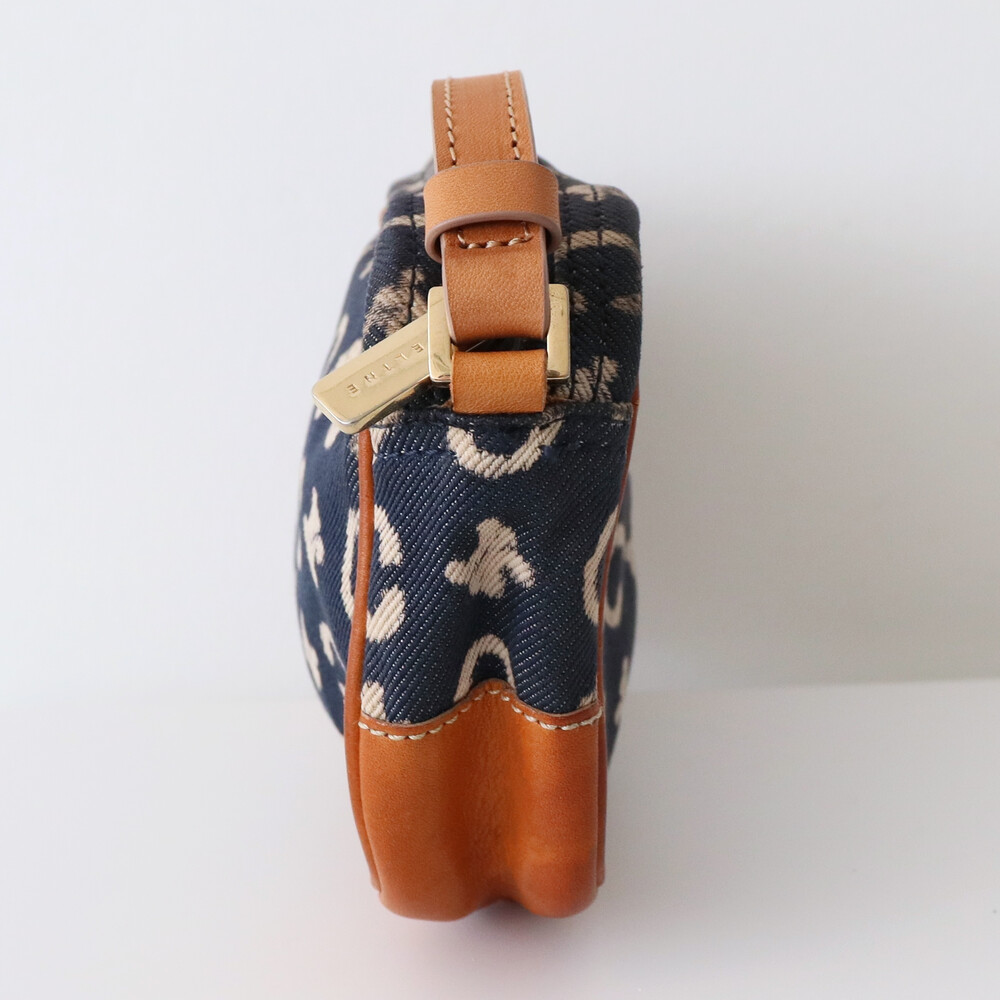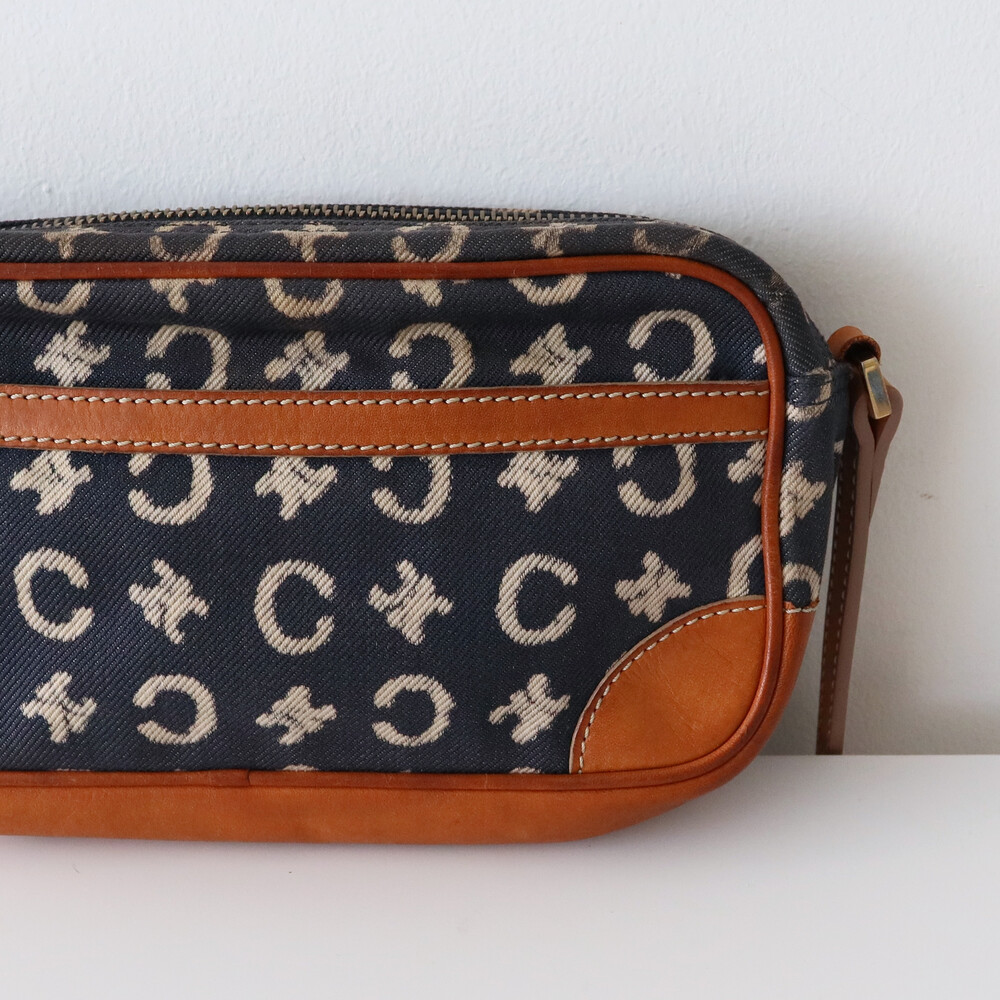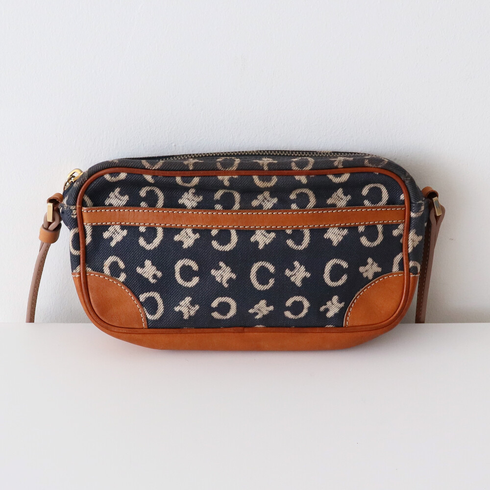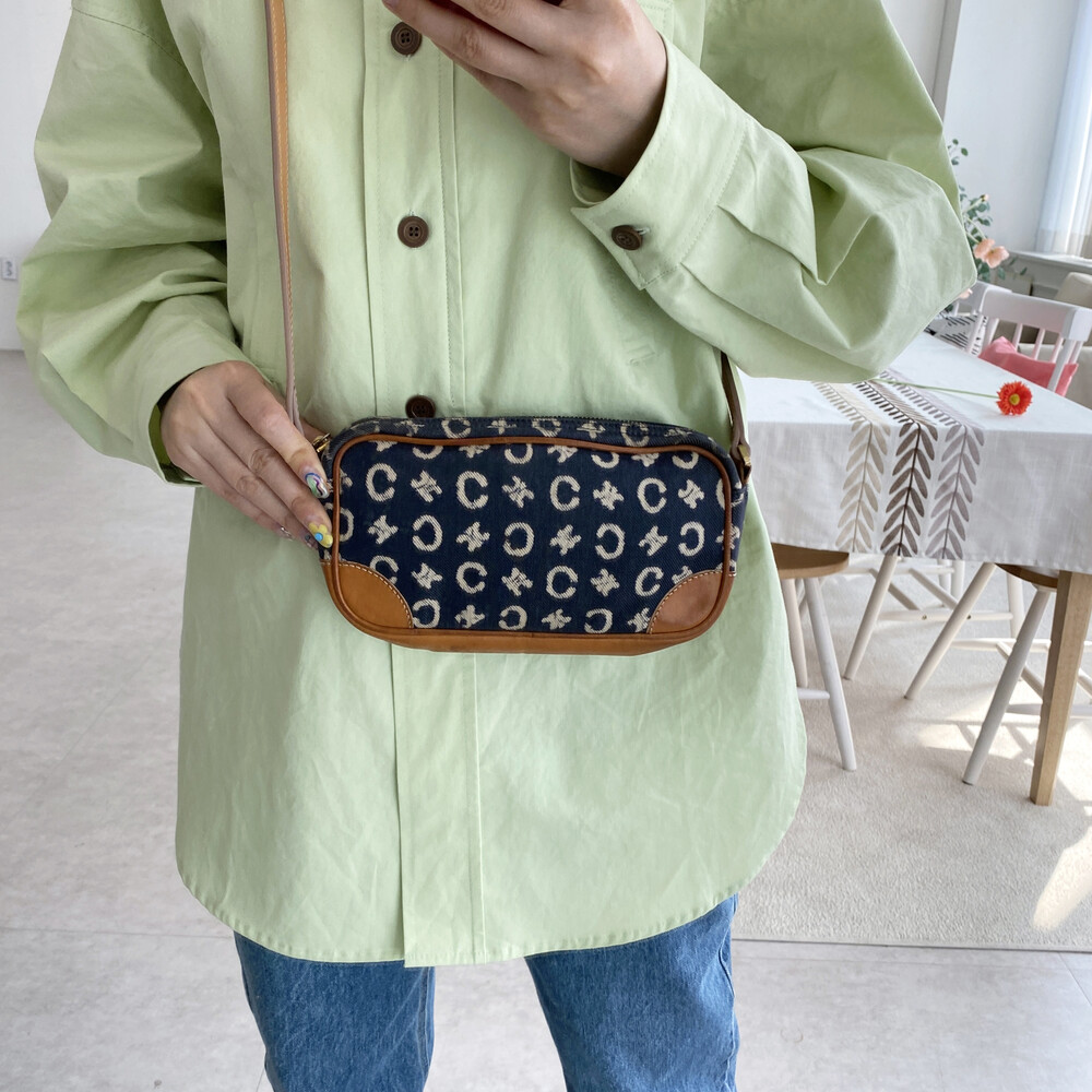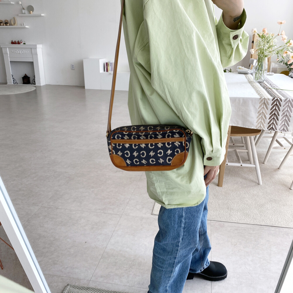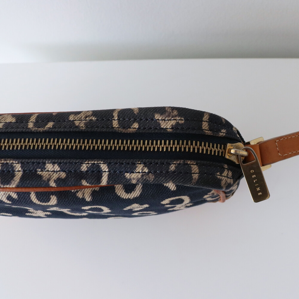 라이트 브라운 가죽 트리밍과 셀린느 시그니처 트리오페 패턴이 어우러진 데님 캔버스 소재로 제작되어,