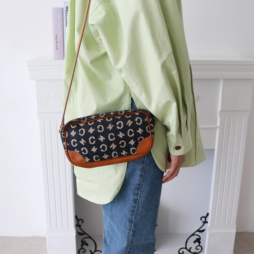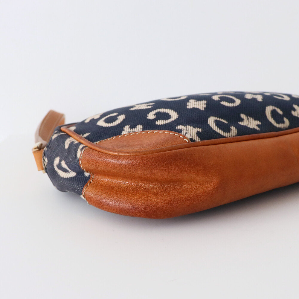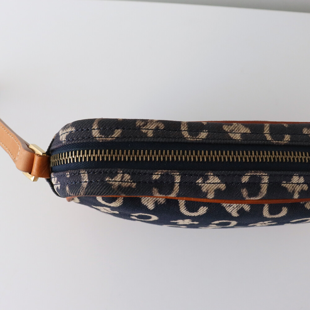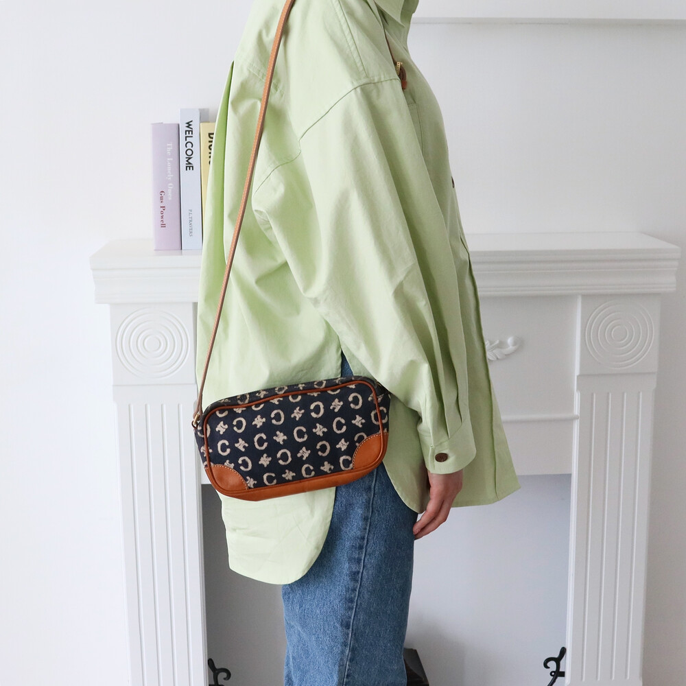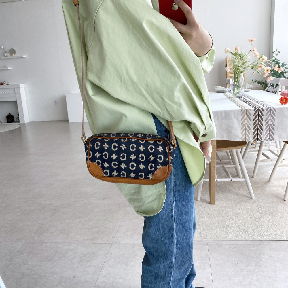 라이트 브라운 가죽 트리밍과 셀린느 시그니처 트리오페 패턴이 어우러진 데님 캔버스 소재로 제작되어,