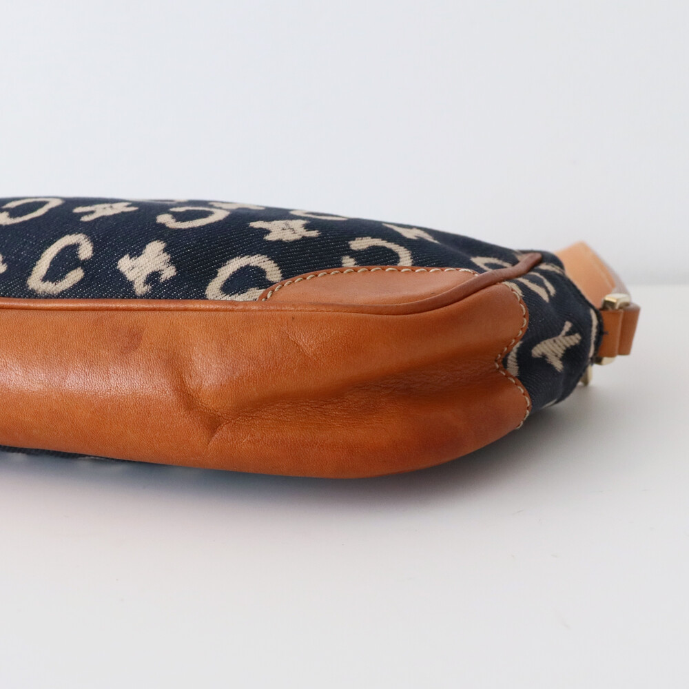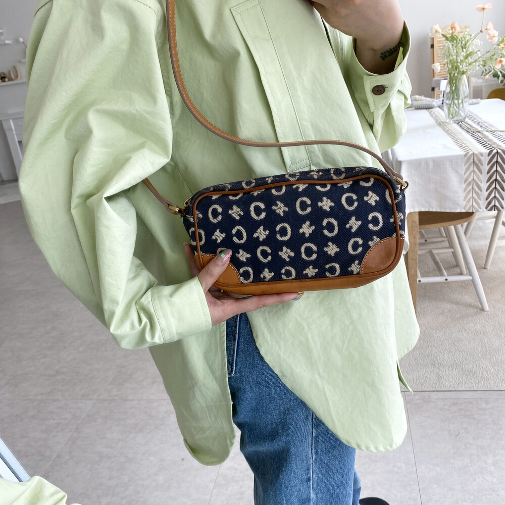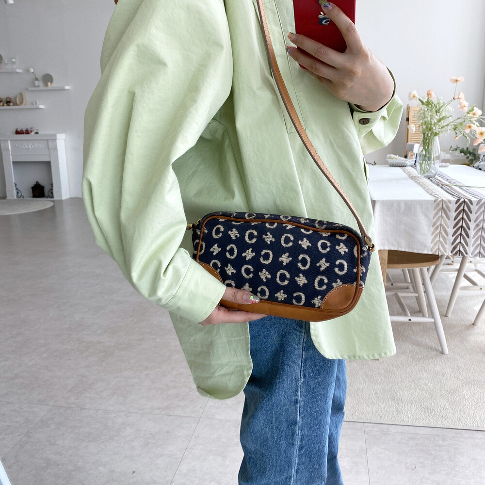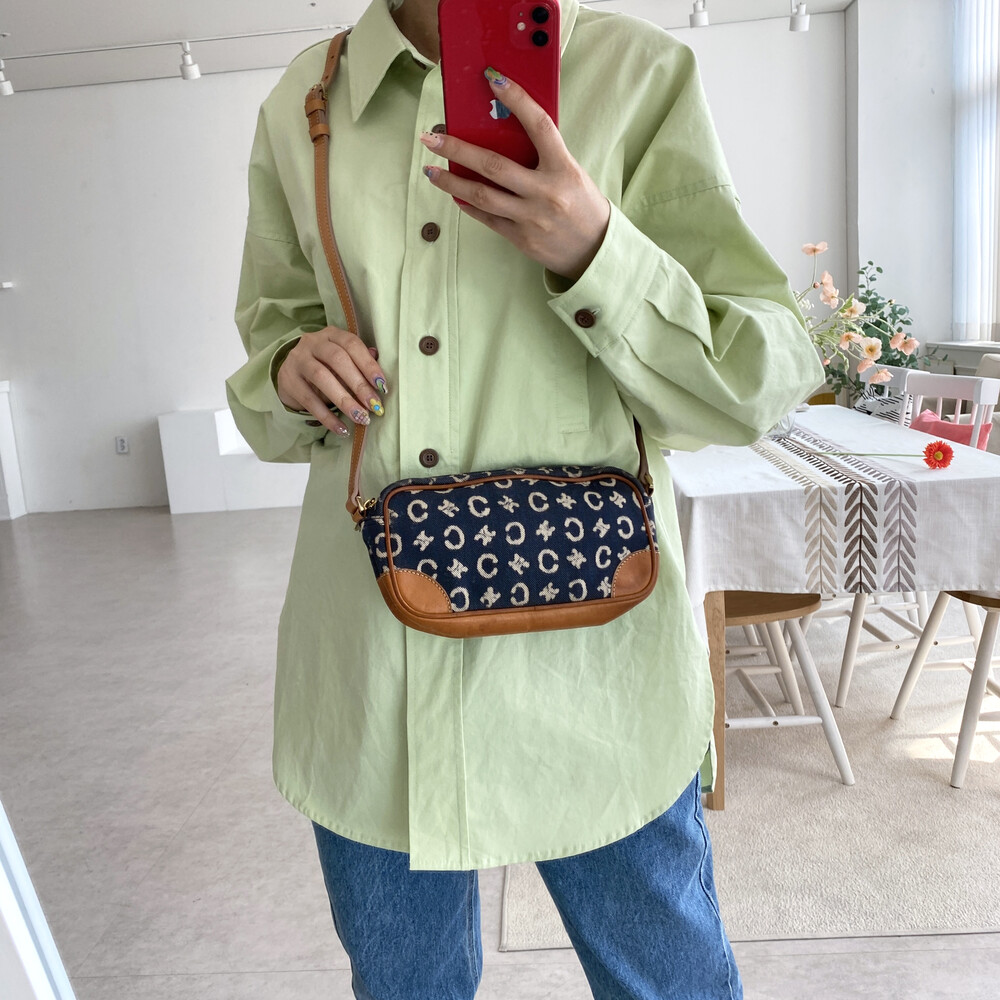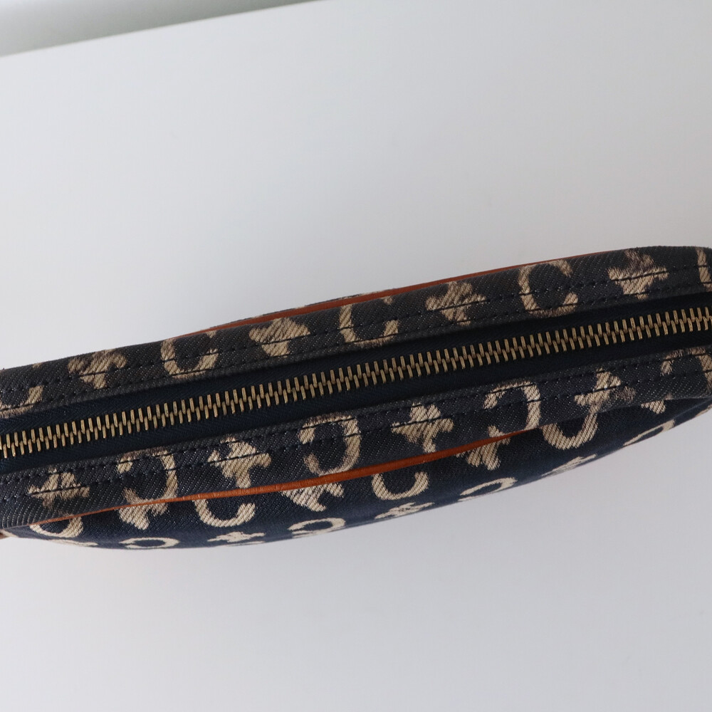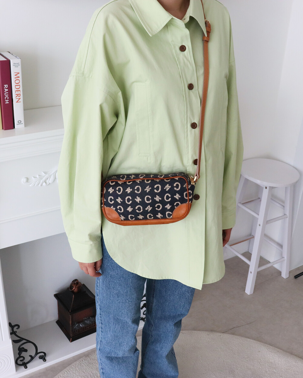 라이트 브라운 가죽 트리밍과 셀린느 시그니처 트리오페 패턴이 어우러진 데님 캔버스 소재로 제작되어,