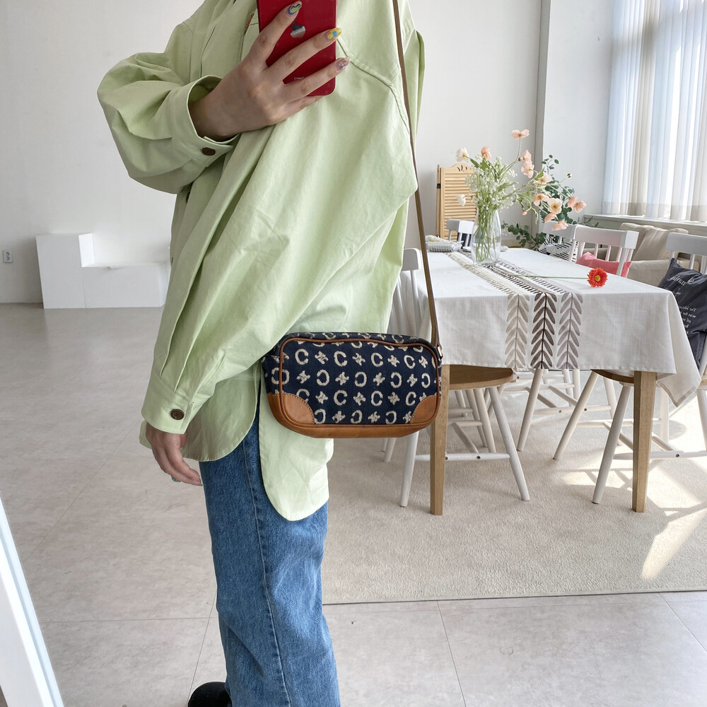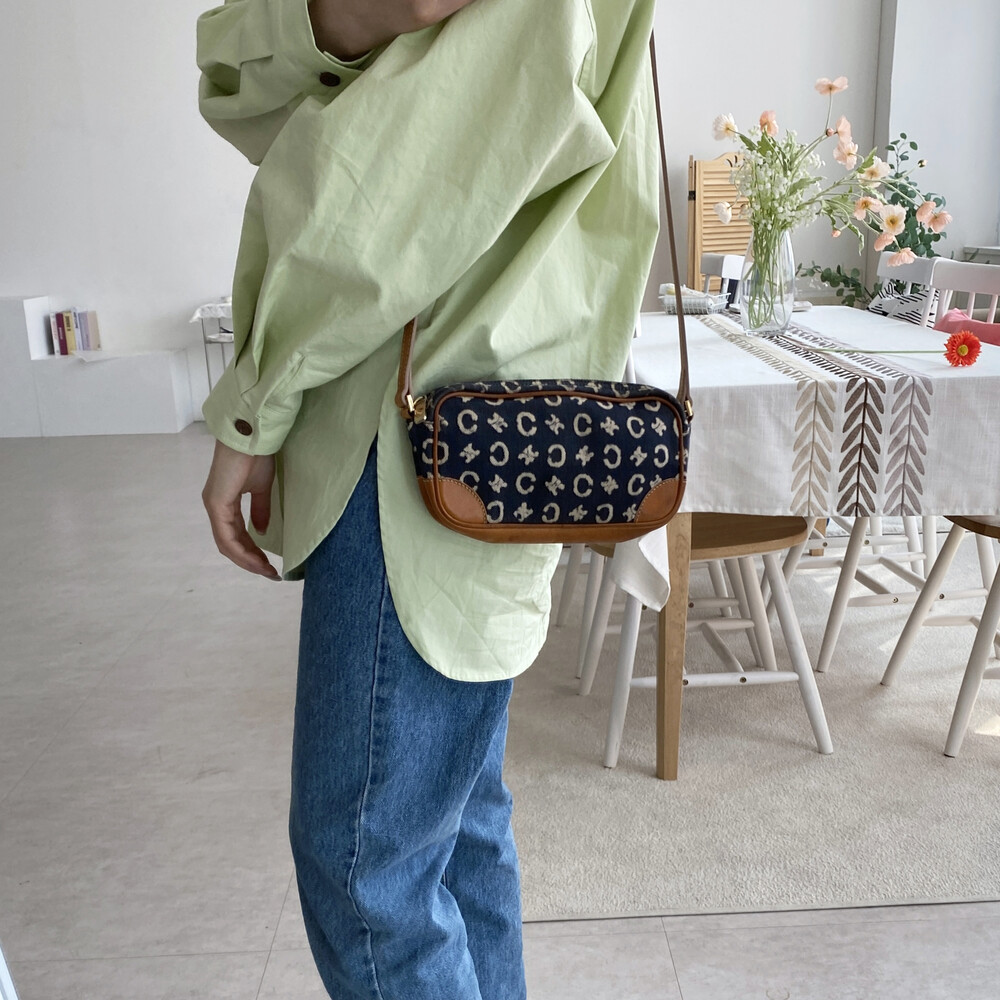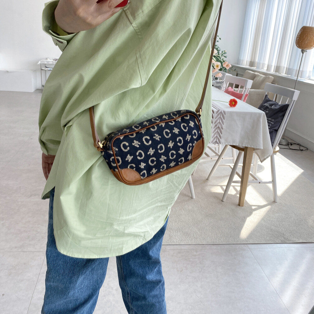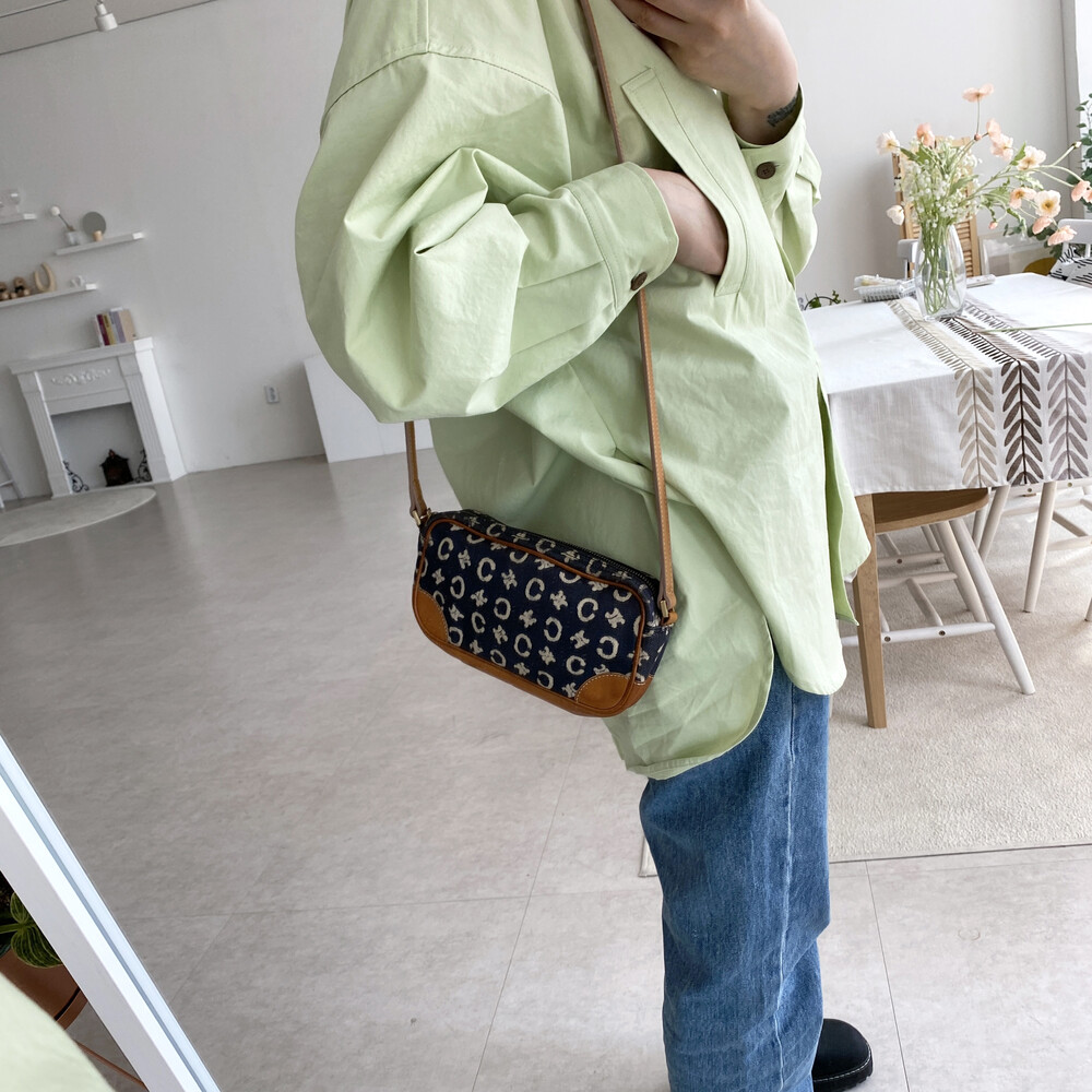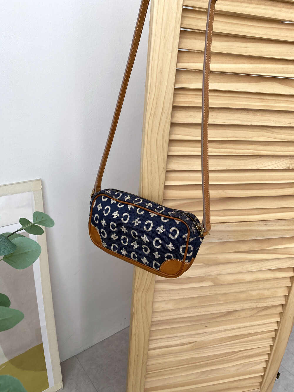 라이트 브라운 가죽 트리밍과 셀린느 시그니처 트리오페 패턴이 어우러진 데님 캔버스 소재로 제작되어,