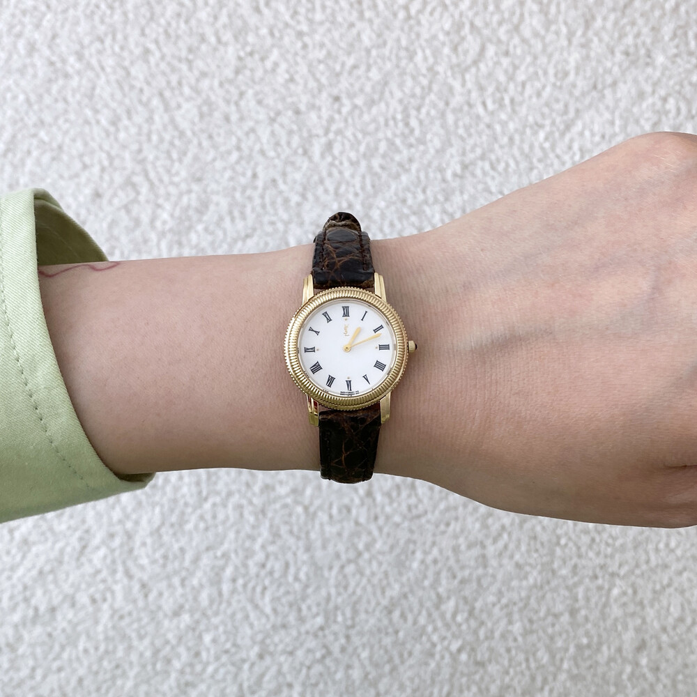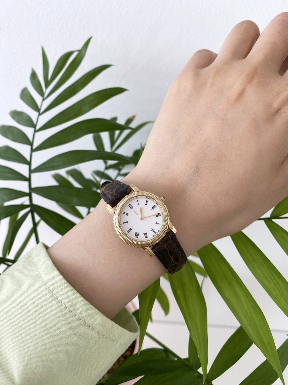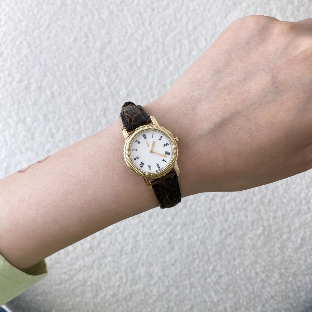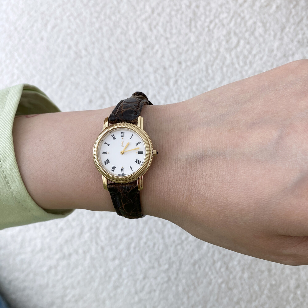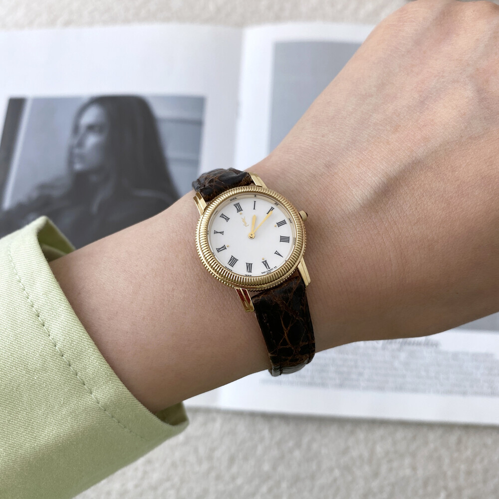 부드러운 골드 톤 케이스와 다이얼 위를 장식하는 생로랑 YSL 시그니처가