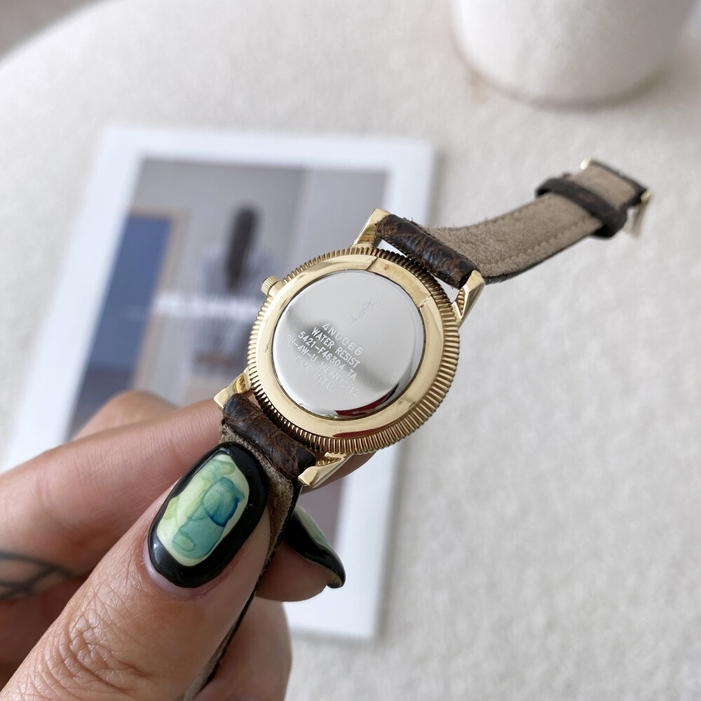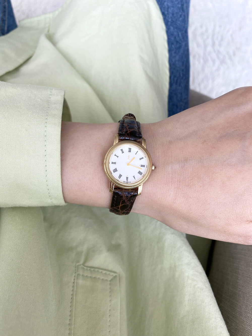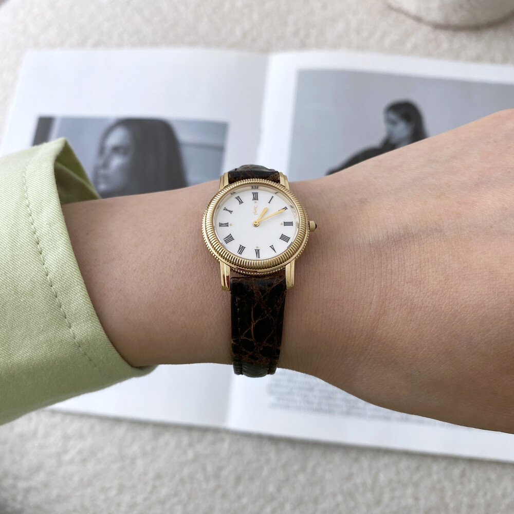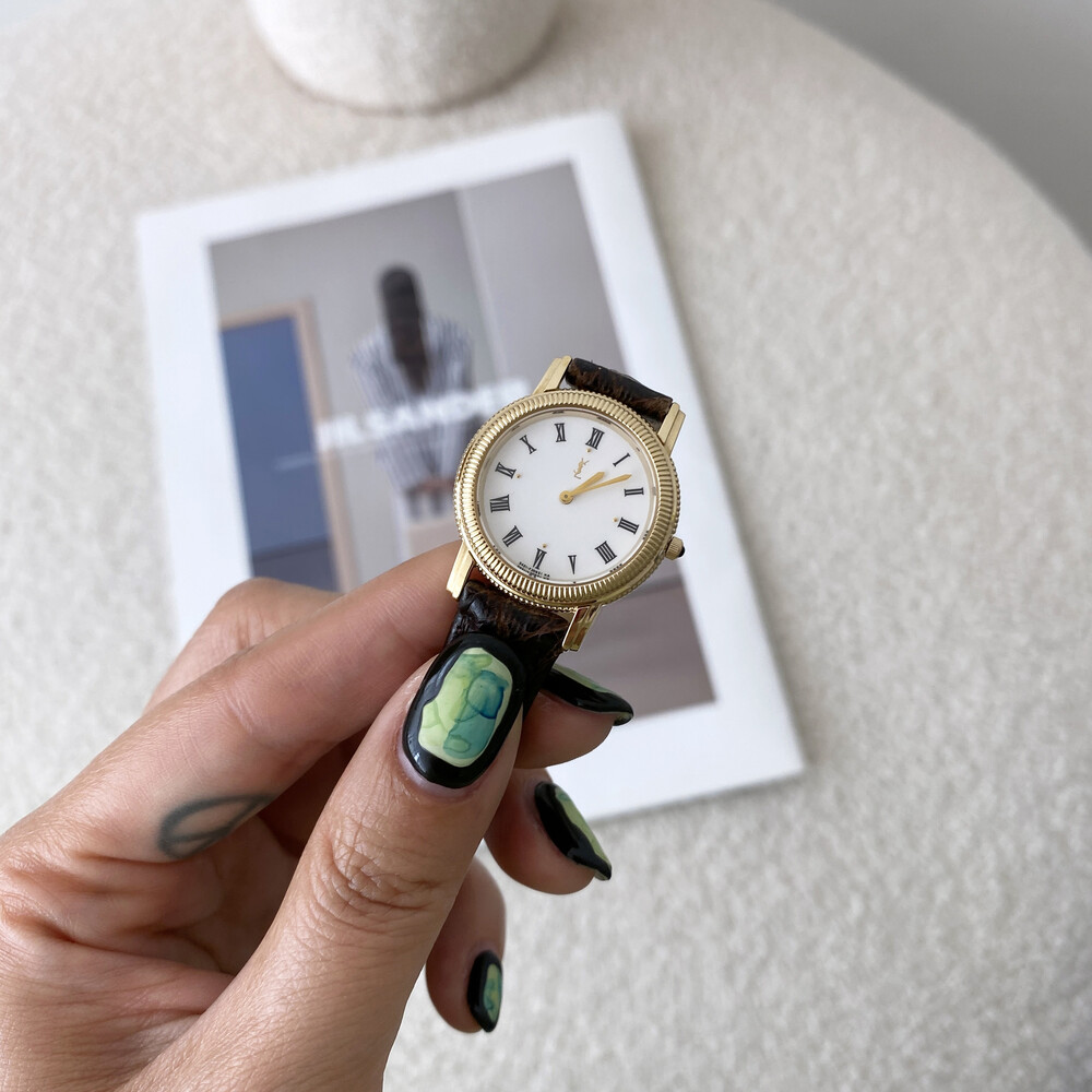 부드러운 골드 톤 케이스와 다이얼 위를 장식하는 생로랑 YSL 시그니처가
