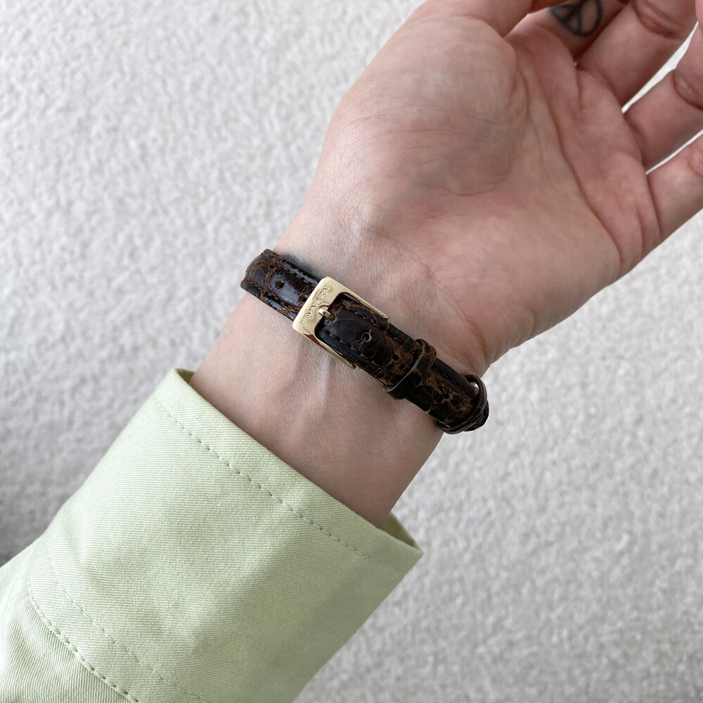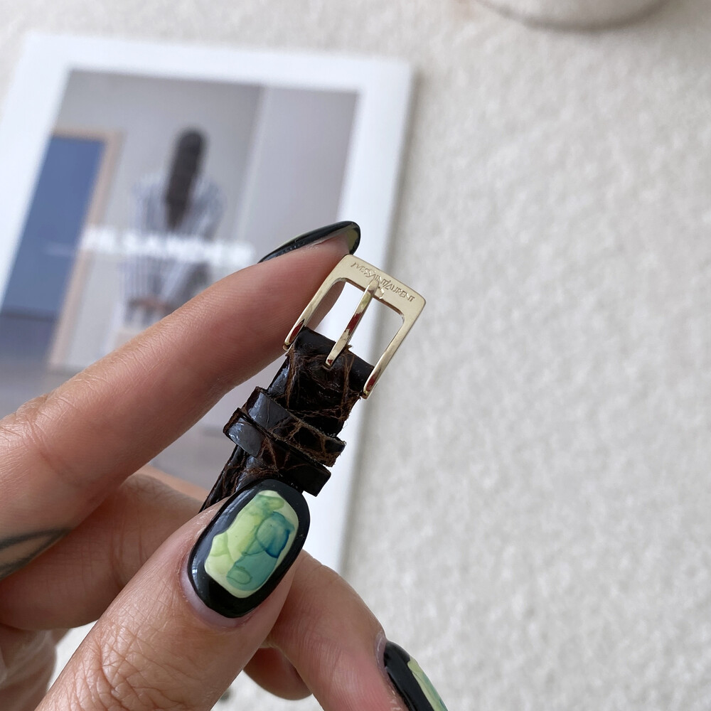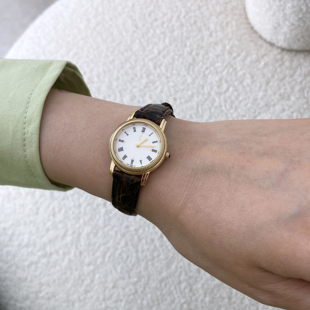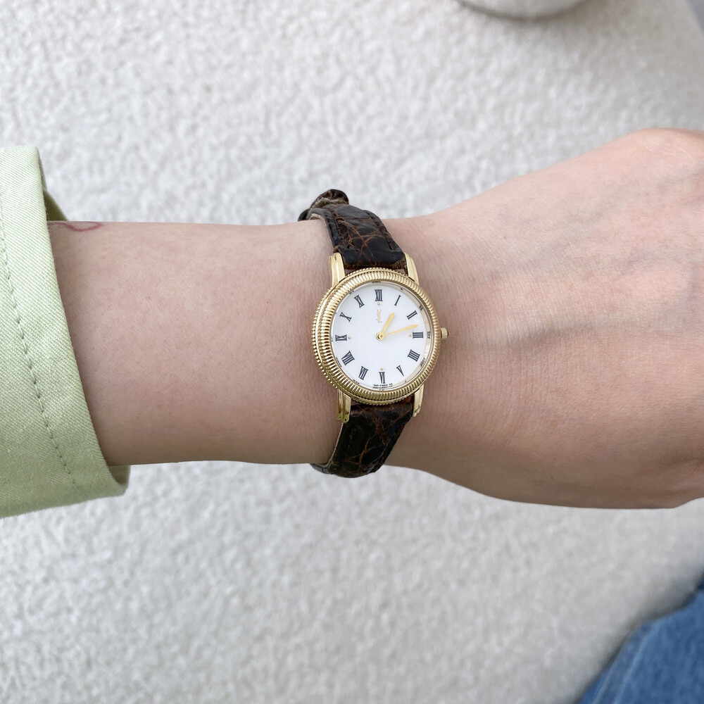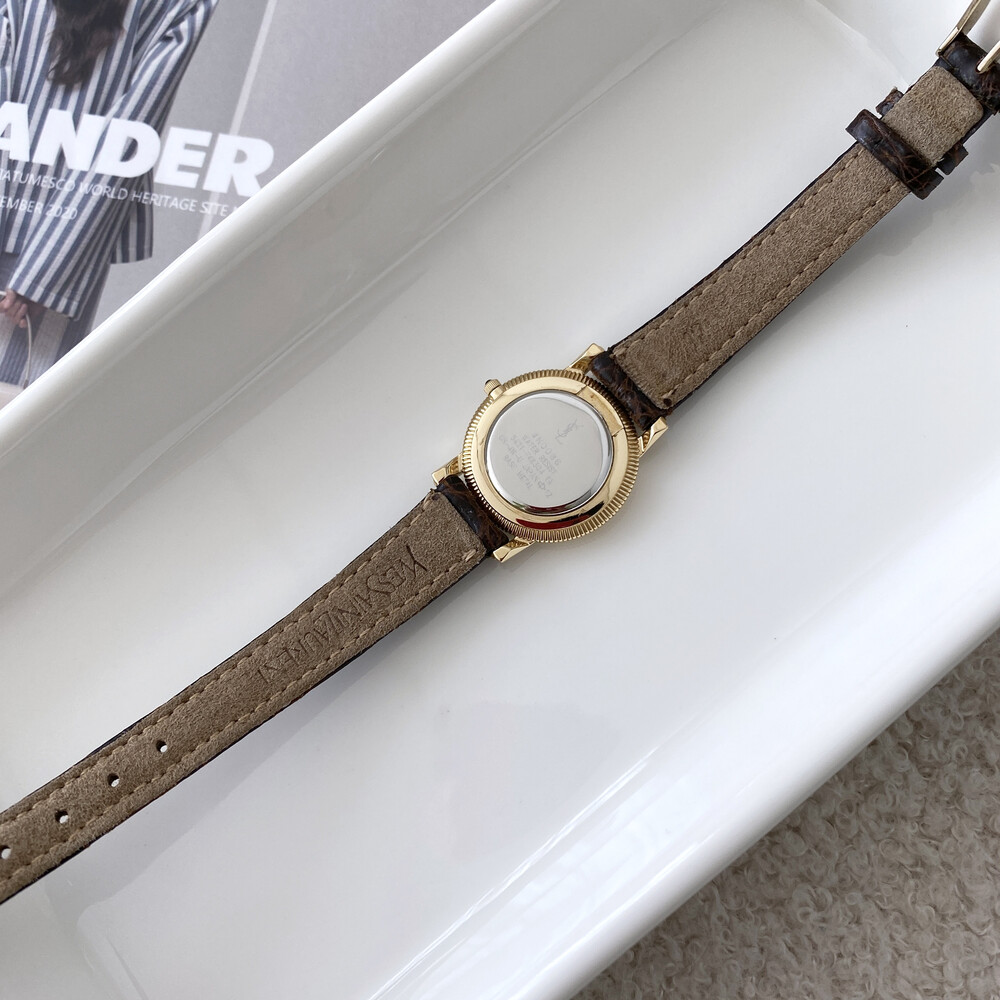 부드러운 골드 톤 케이스와 다이얼 위를 장식하는 생로랑 YSL 시그니처가