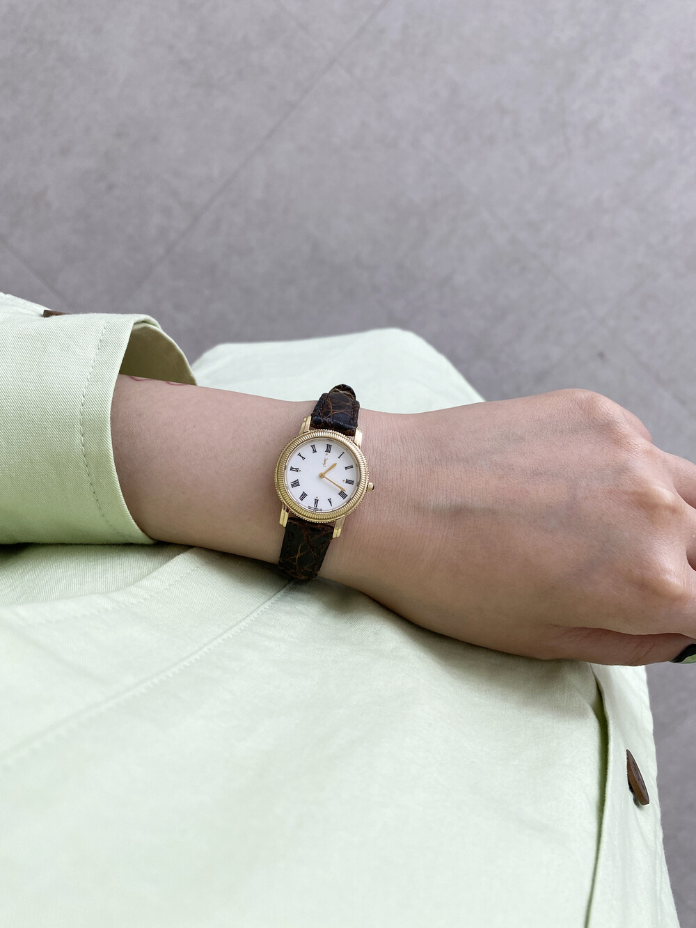 여성용으로 제작된 생로랑 시계이며 쿼츠 무브먼트로 제작되었습니다.