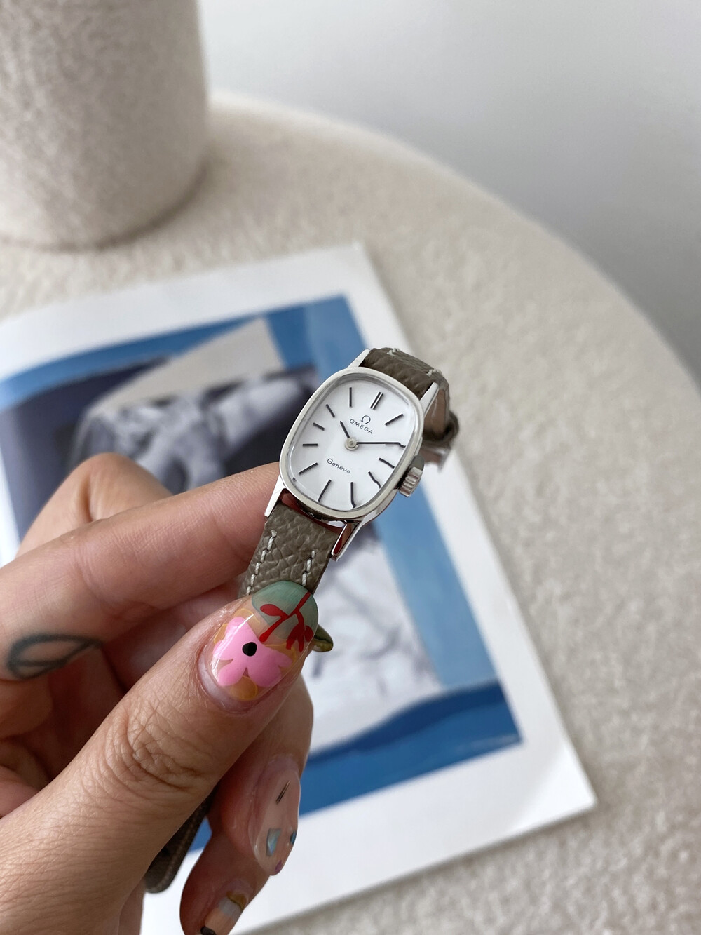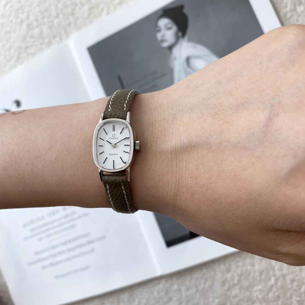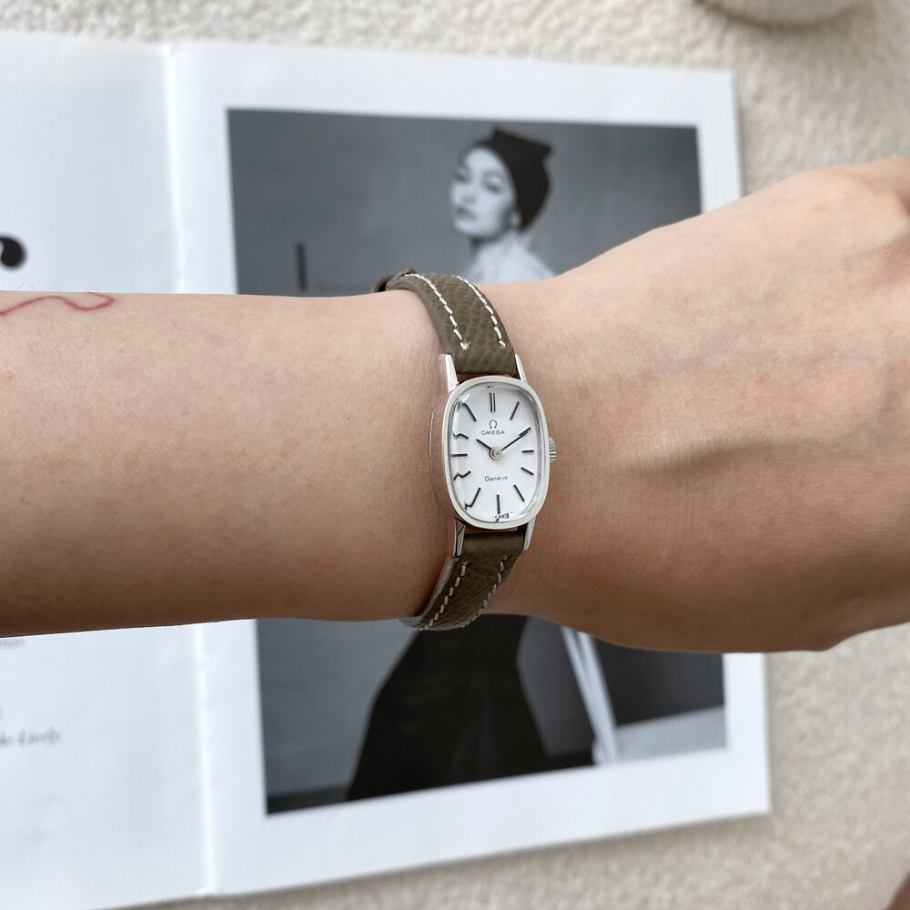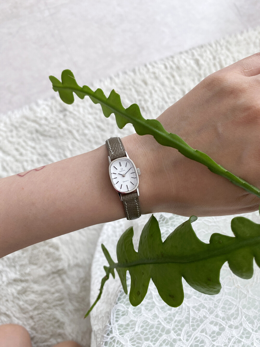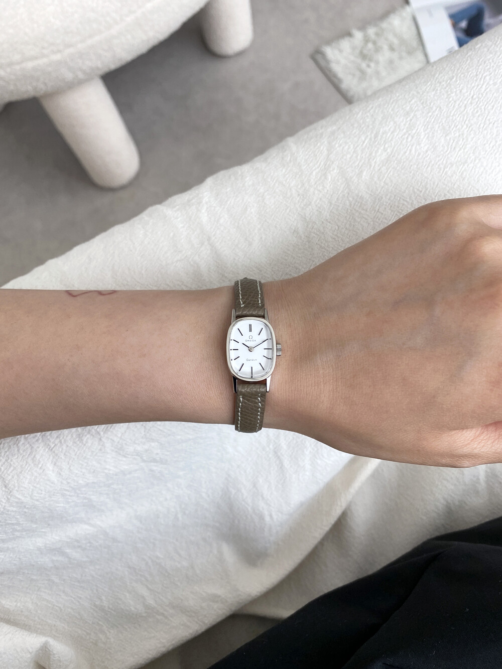 1973년도에 제작된 오메가 제네브 모델로 부드러운 곡선의 오발 실버 케이스,
