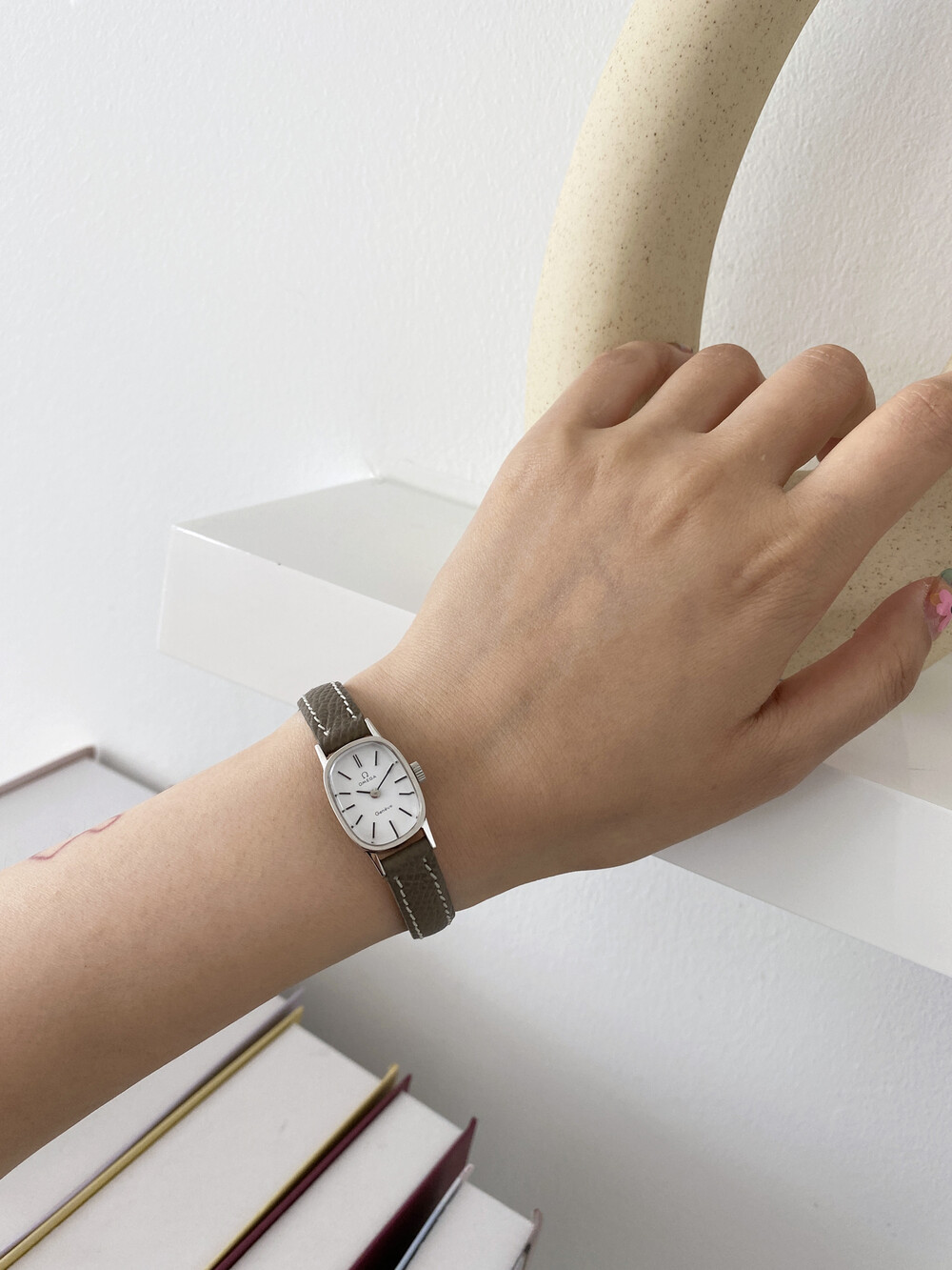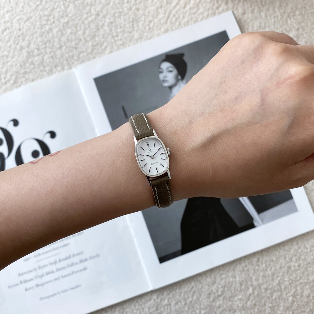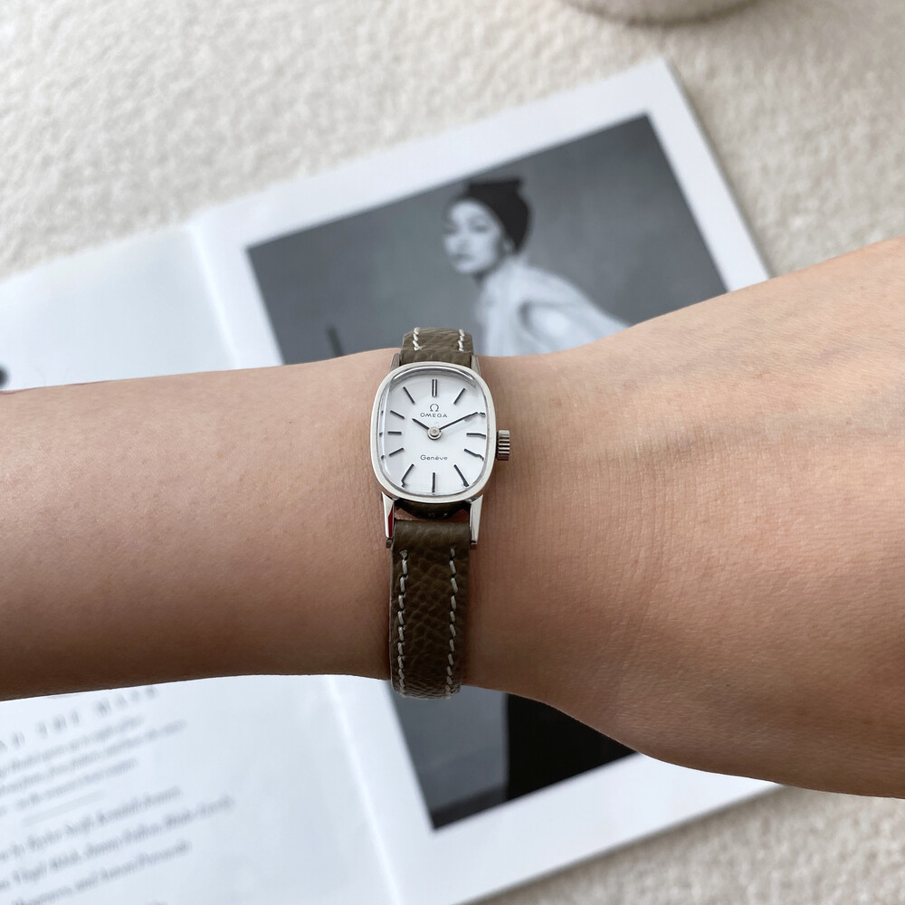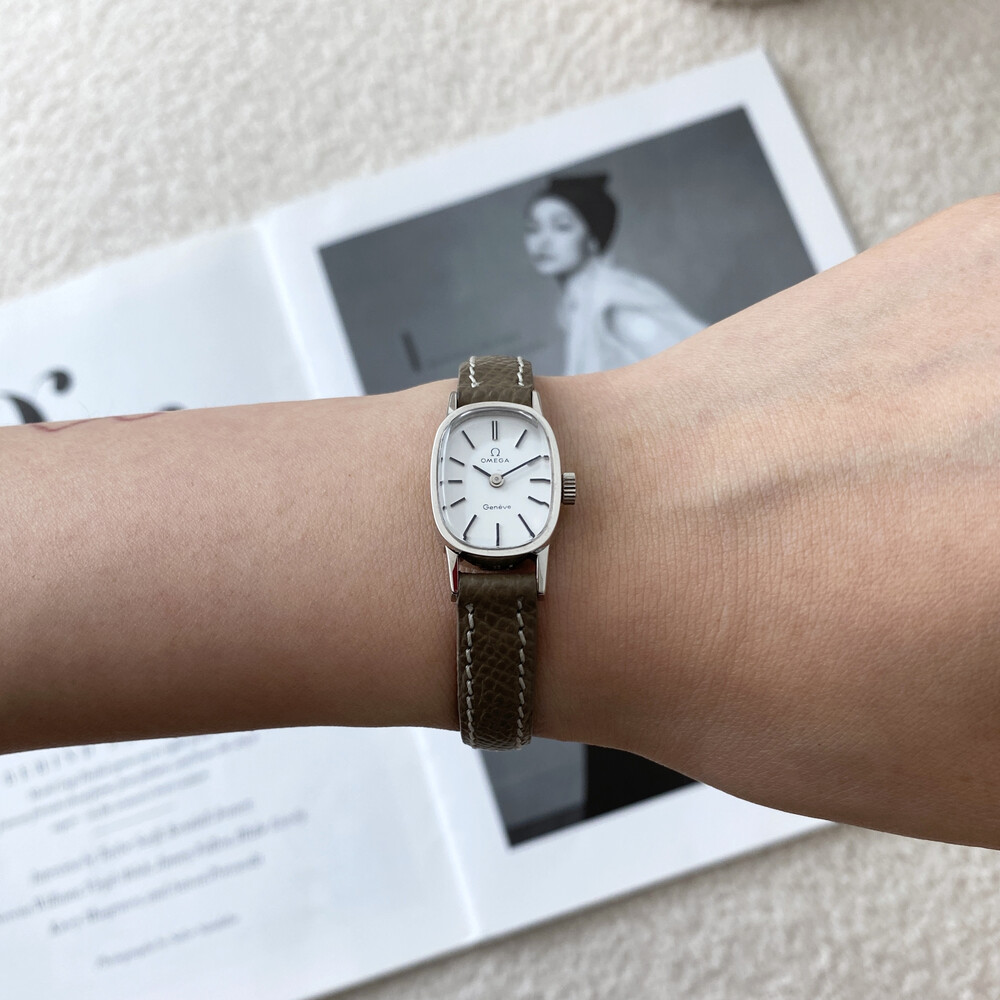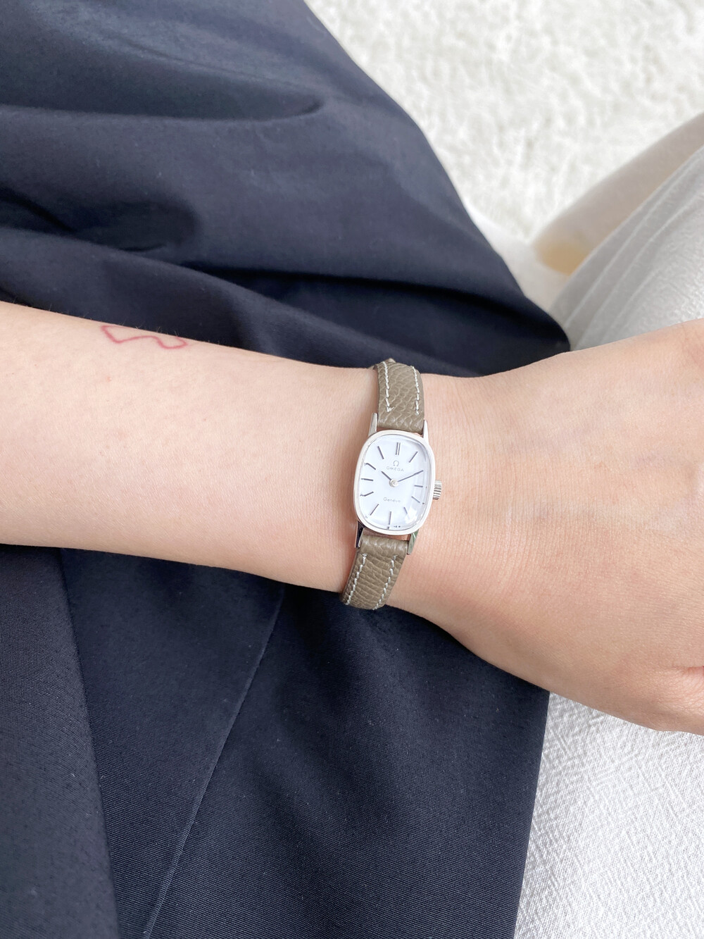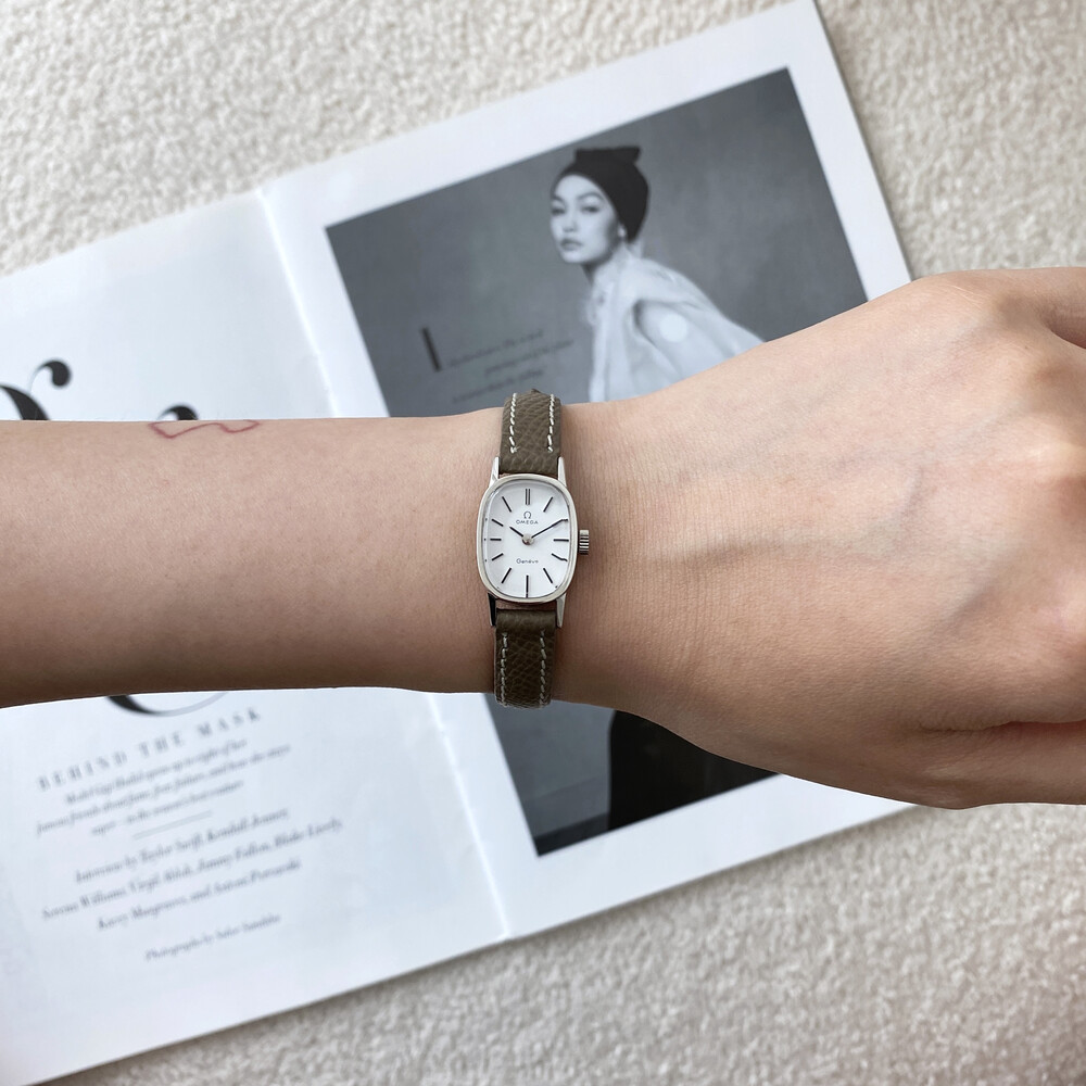 1973년도에 제작된 오메가 제네브 모델로 부드러운 곡선의 오발 실버 케이스,