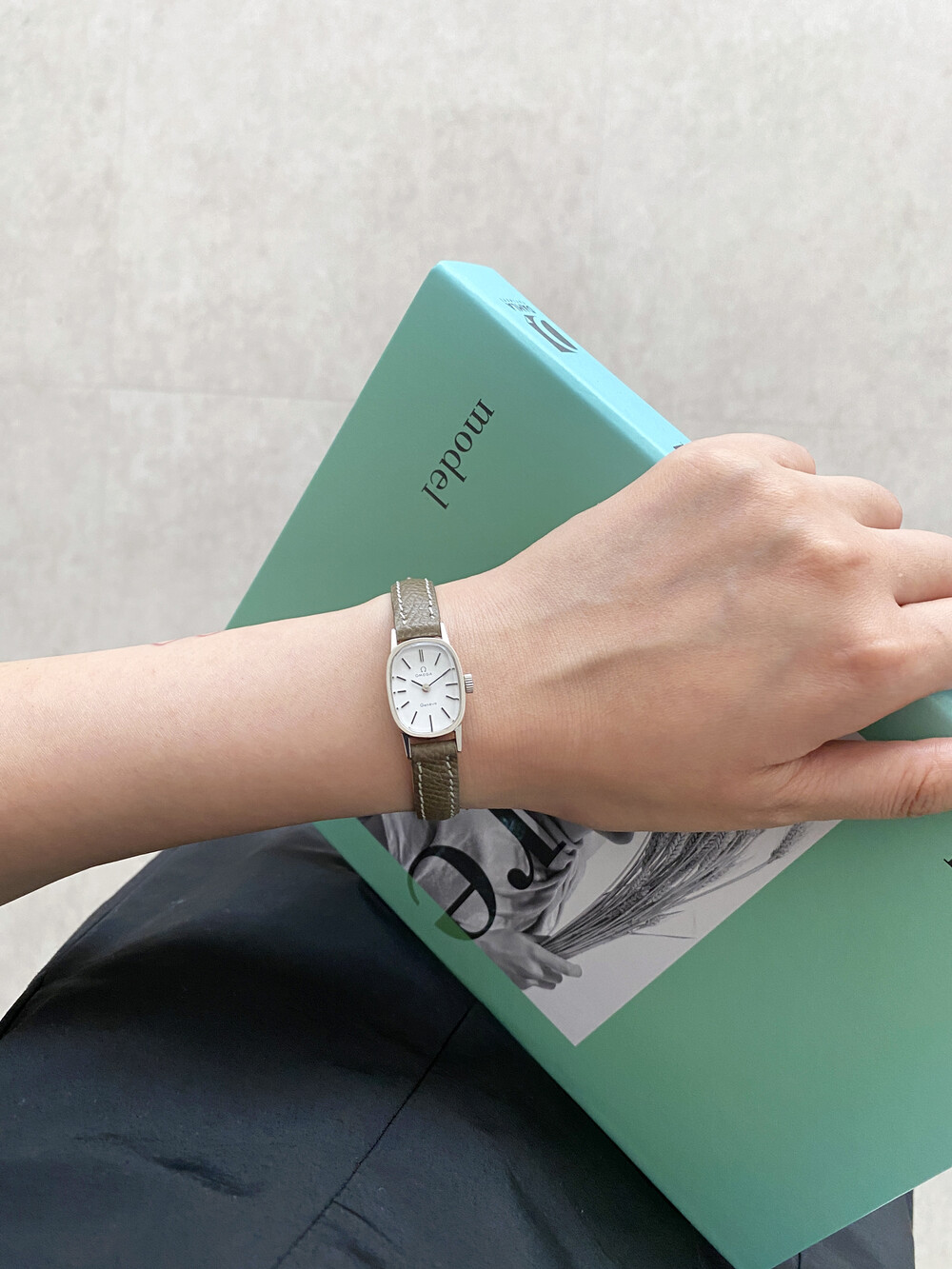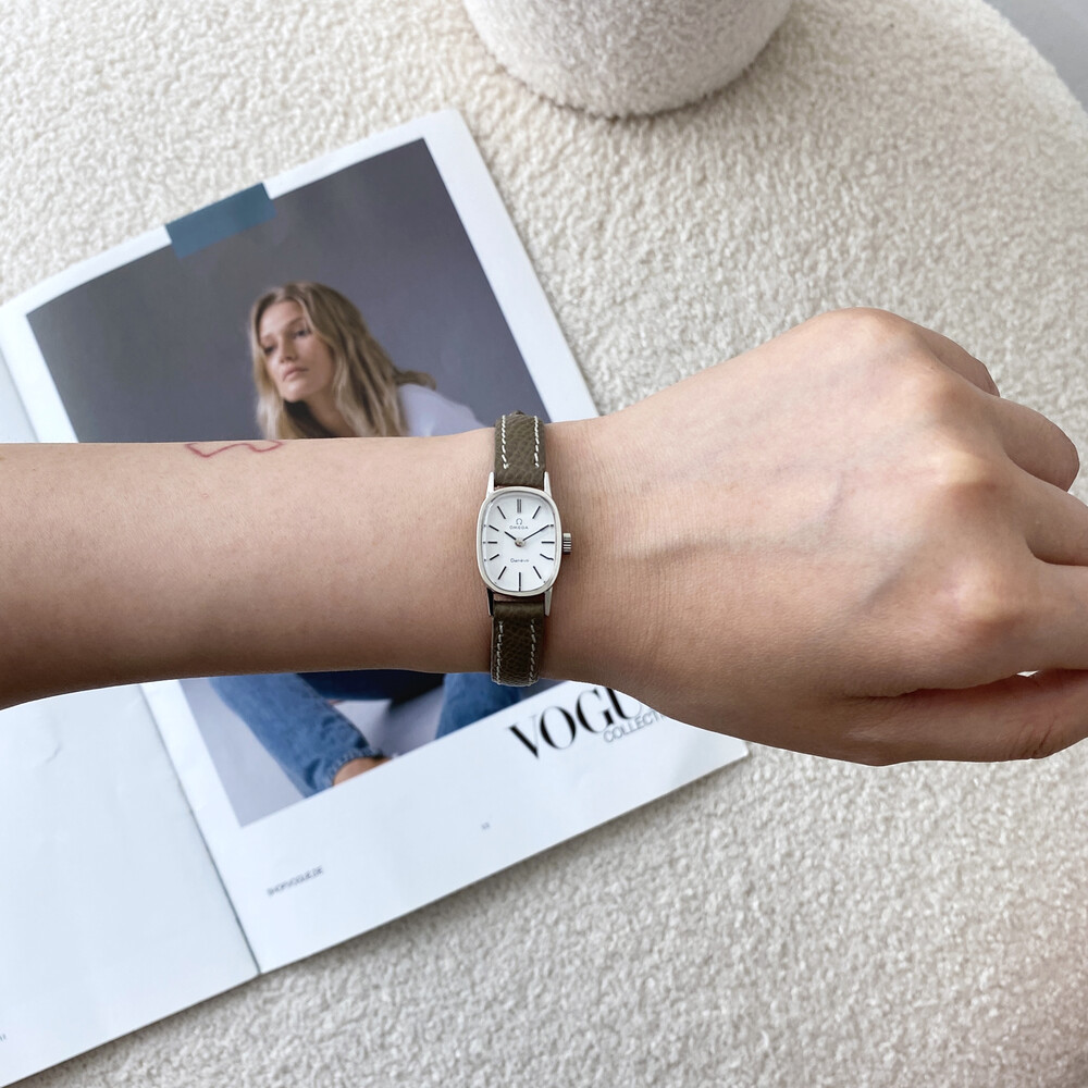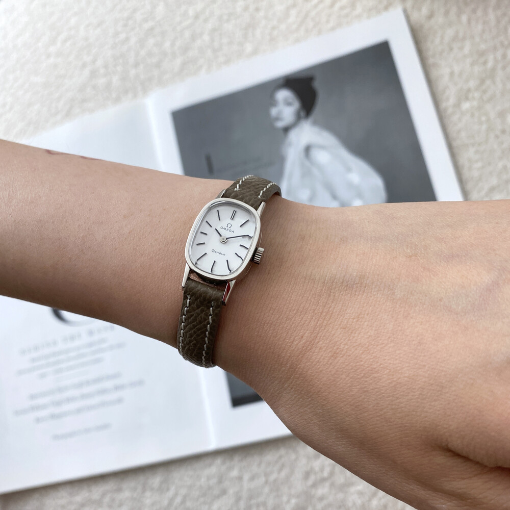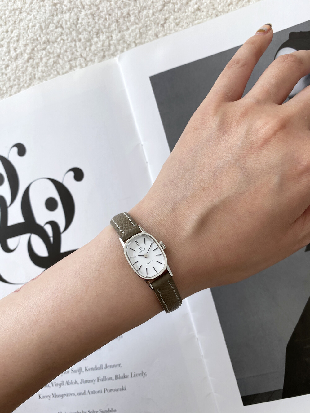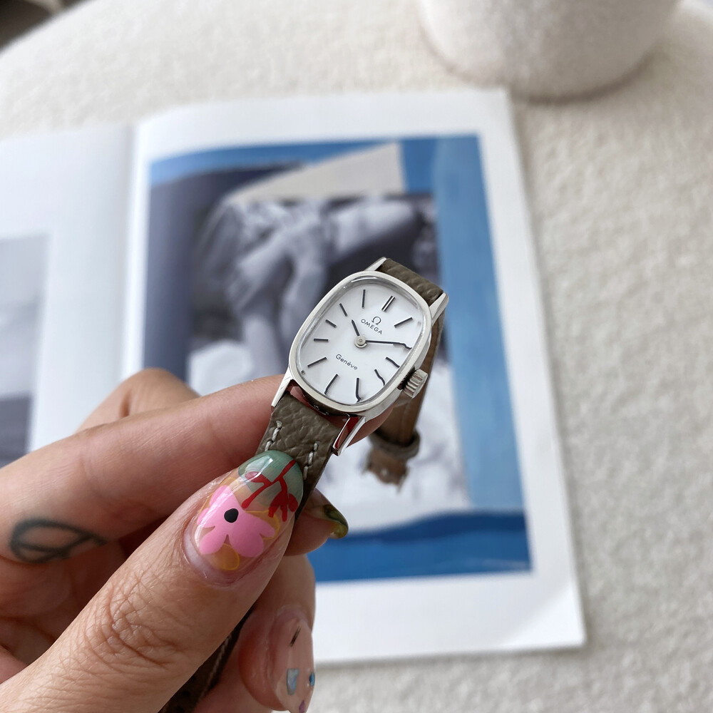 1973년도에 제작된 오메가 제네브 모델로 부드러운 곡선의 오발 실버 케이스,