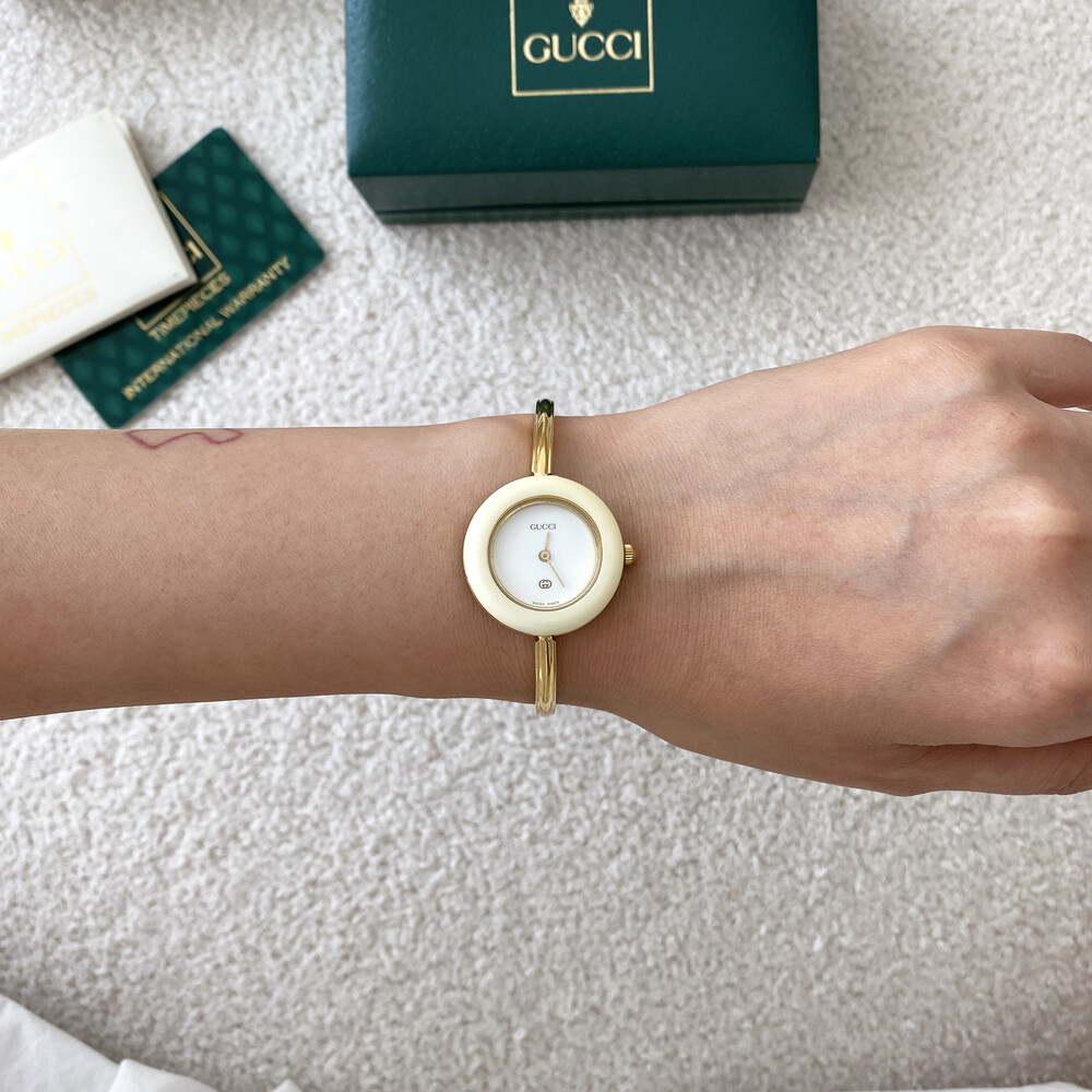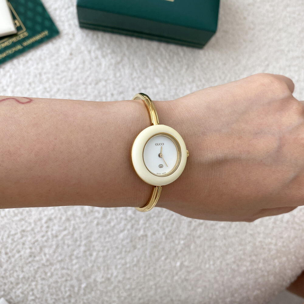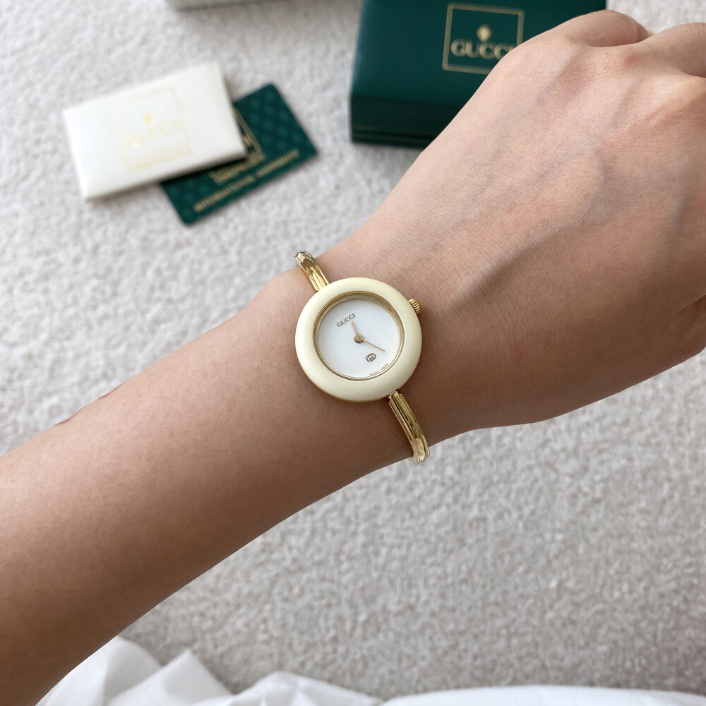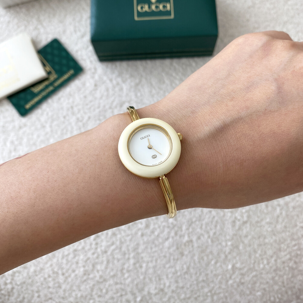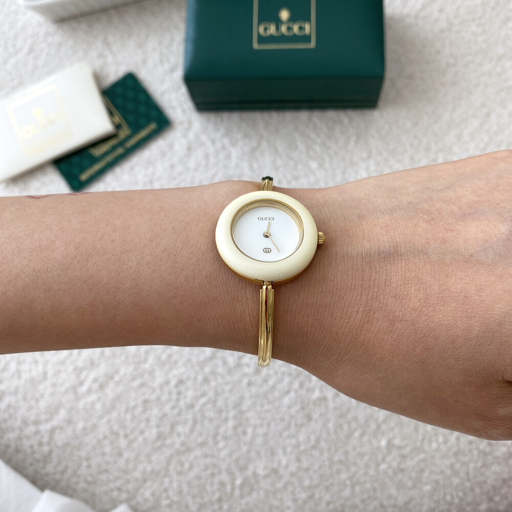 손목을 부드럽게 타고 내리는 자연스러운 실루엣과 화이트 다이얼의 구찌 각인은