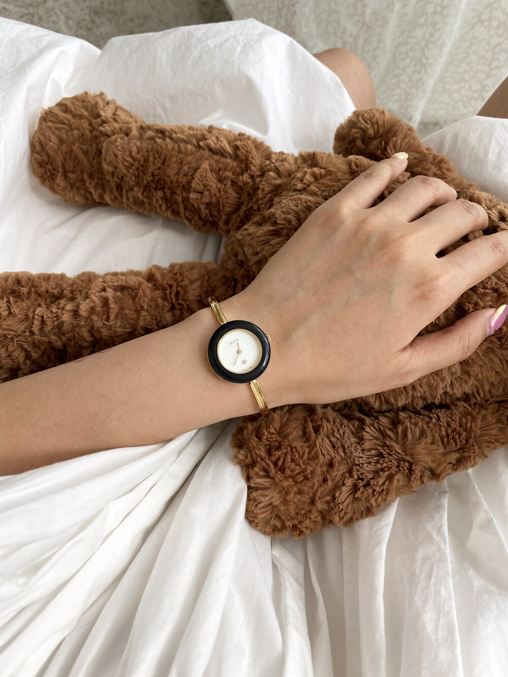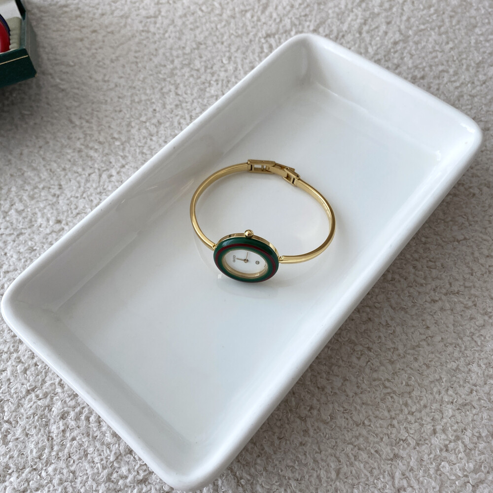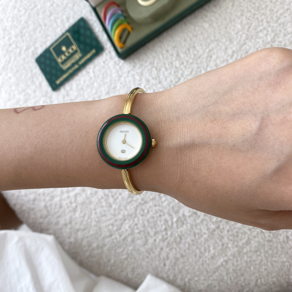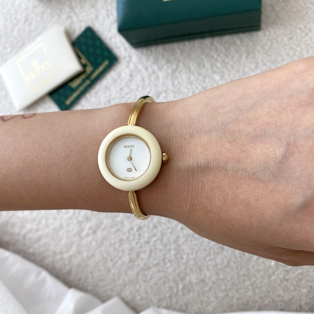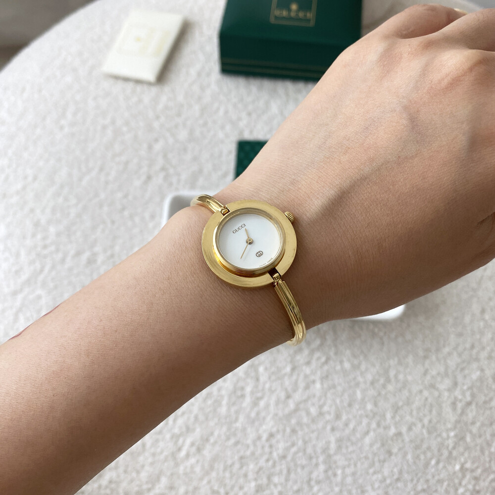손목을 부드럽게 타고 내리는 자연스러운 실루엣과 화이트 다이얼의 구찌 각인은