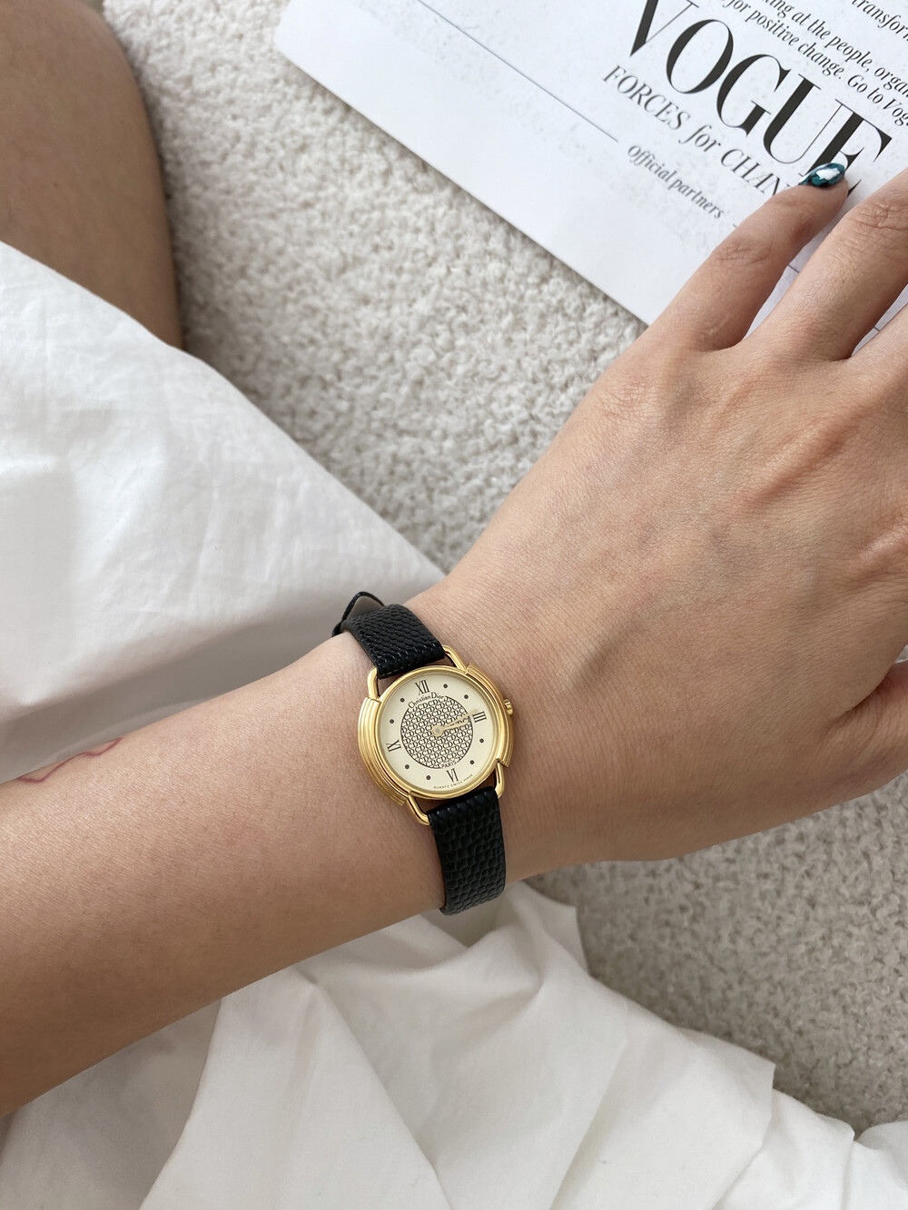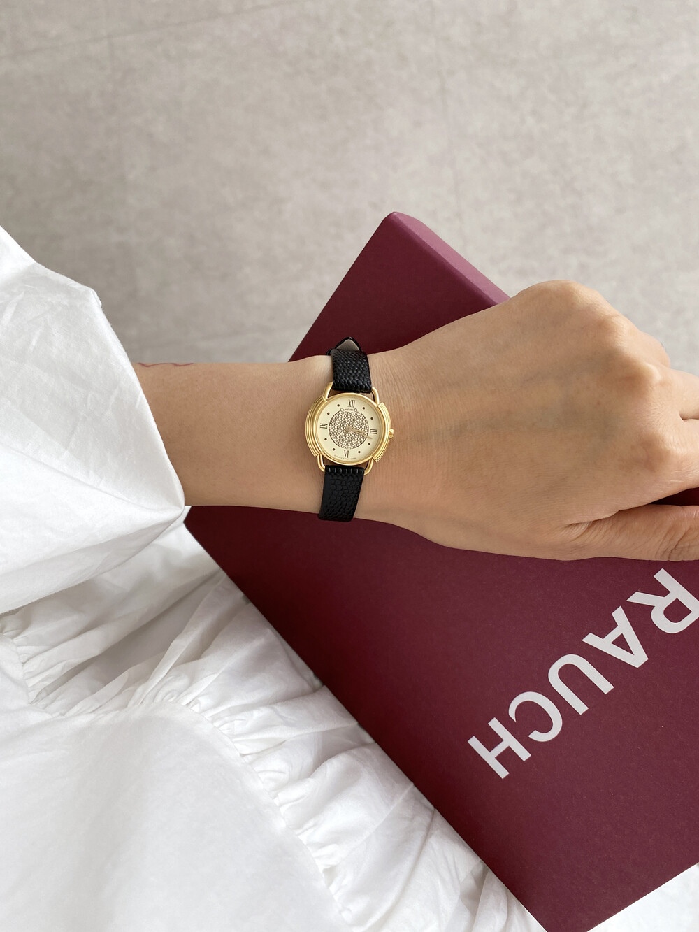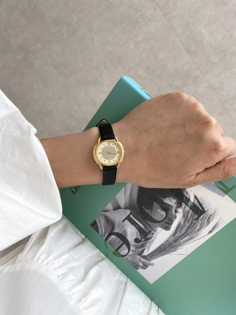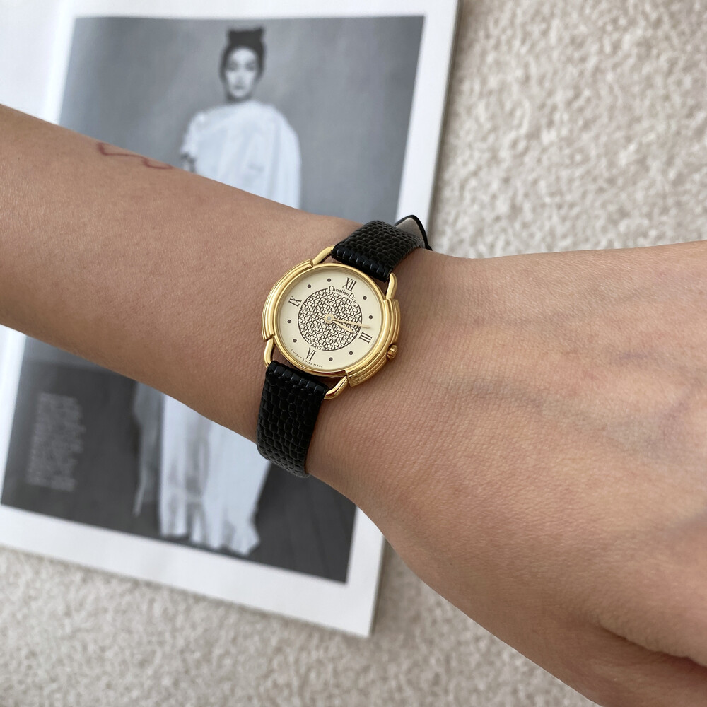 골드 톤 라운드 케이스와 샴페인 톤 다이얼 중앙을 장식하는 디올 트로터 패턴이 매력적인 모델입니다.