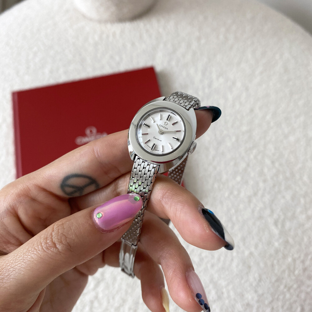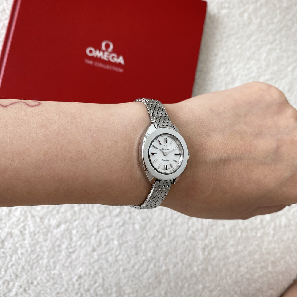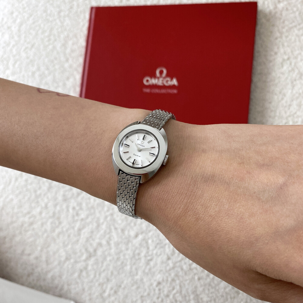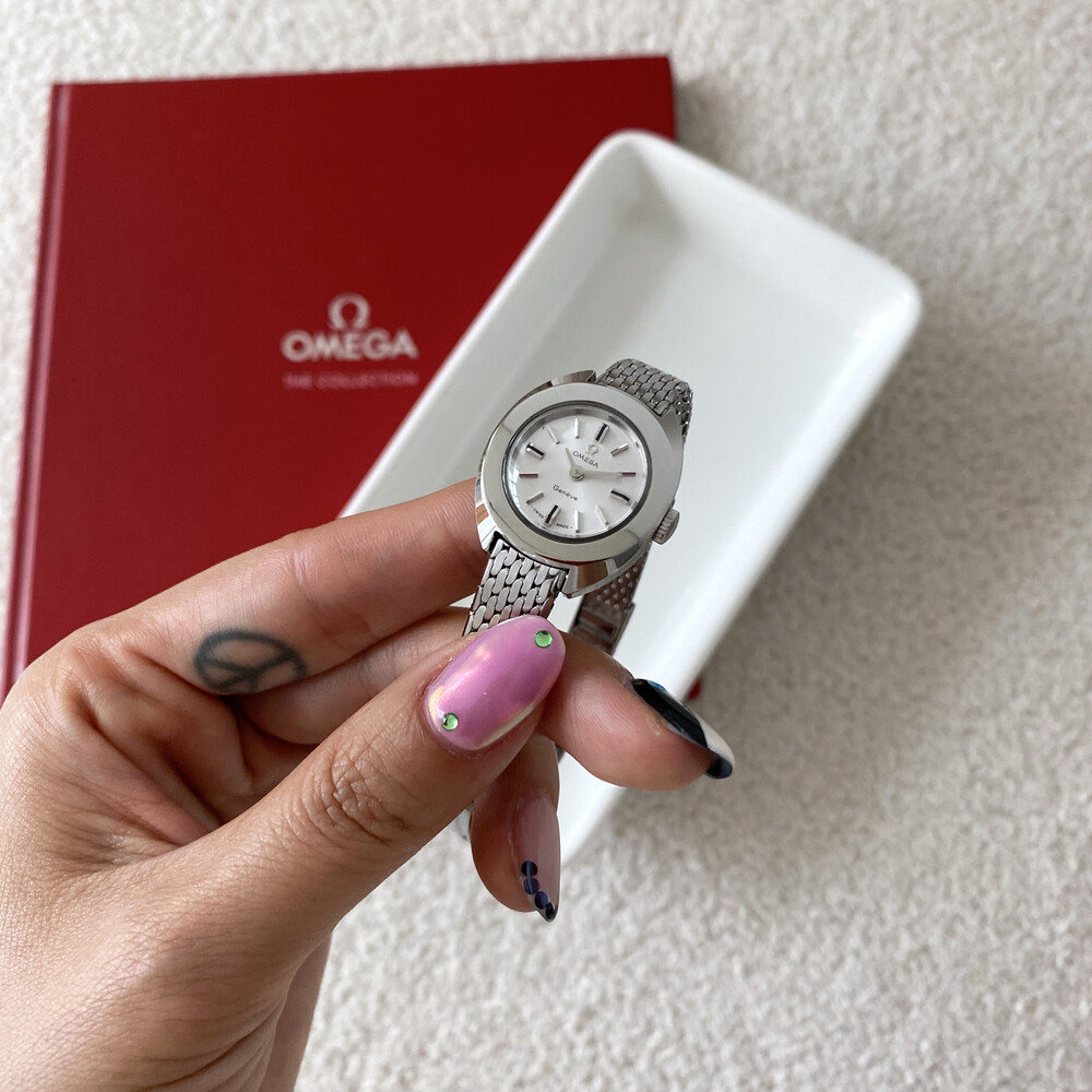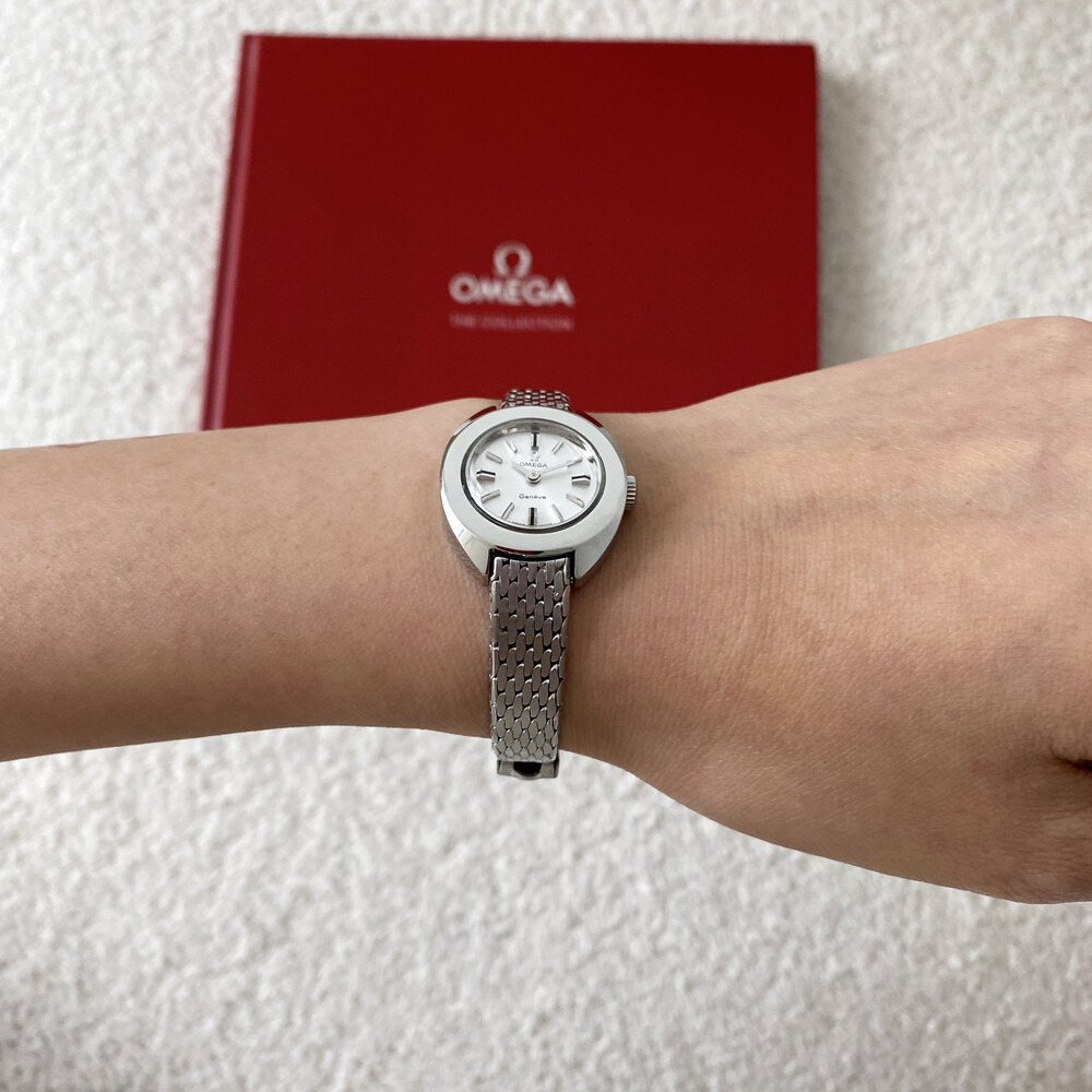 1969년도에 제작된 오메가 제네브 모델로 부드러운 곡선의 실버 케이스와 입체적인 바 인덱스,