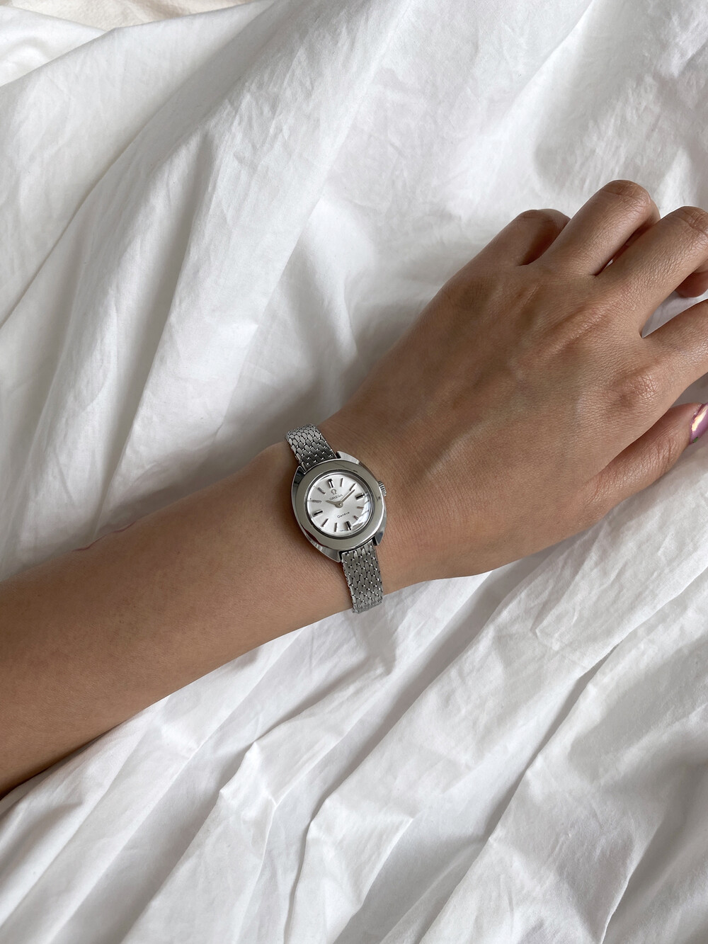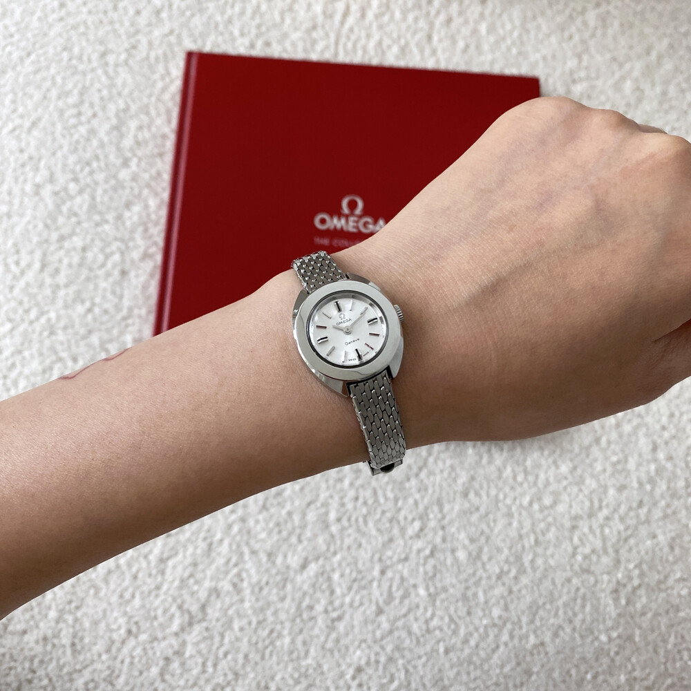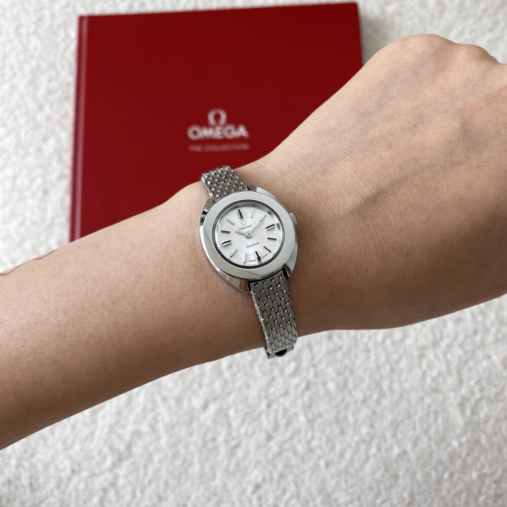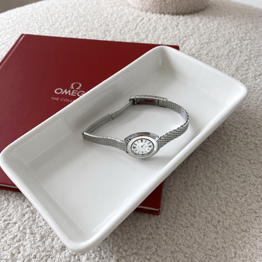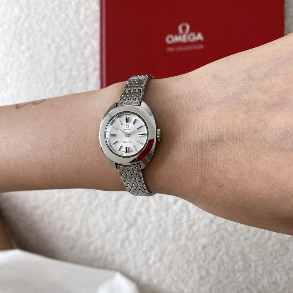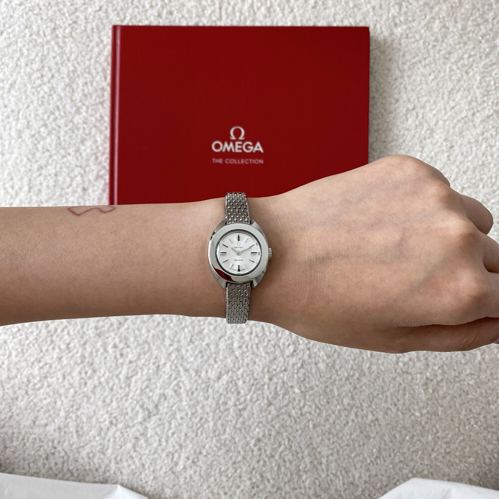 1969년도에 제작된 오메가 제네브 모델로 부드러운 곡선의 실버 케이스와 입체적인 바 인덱스,