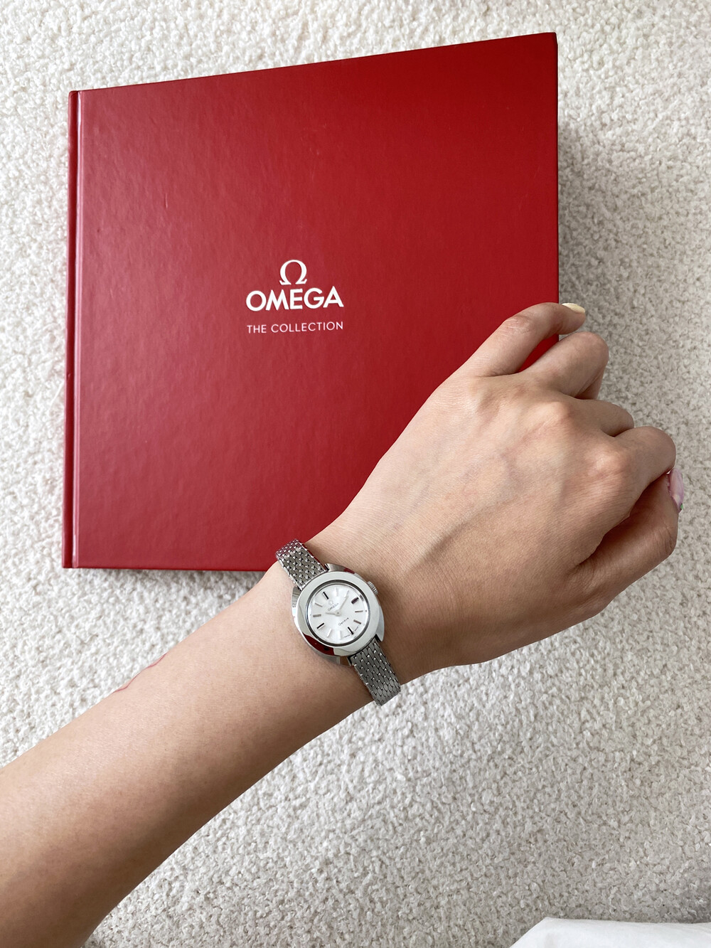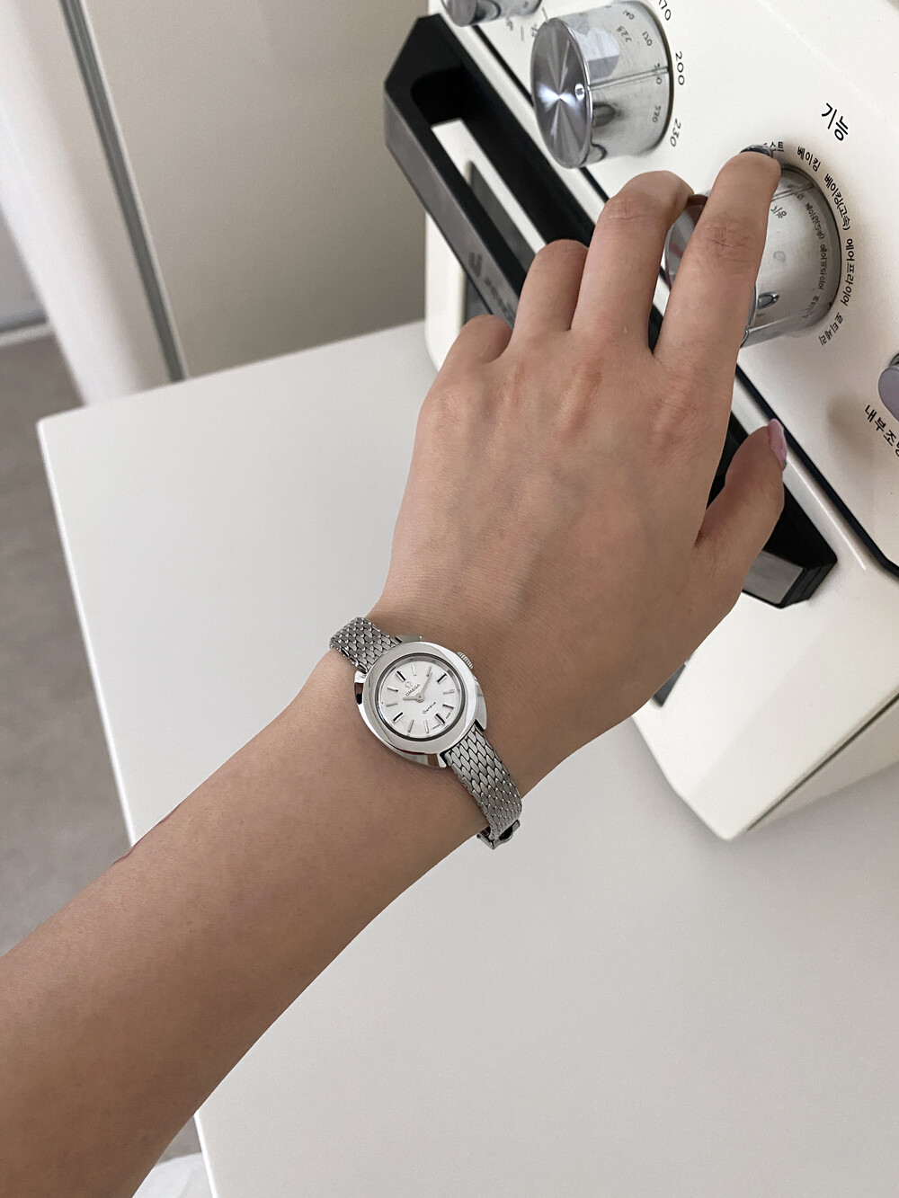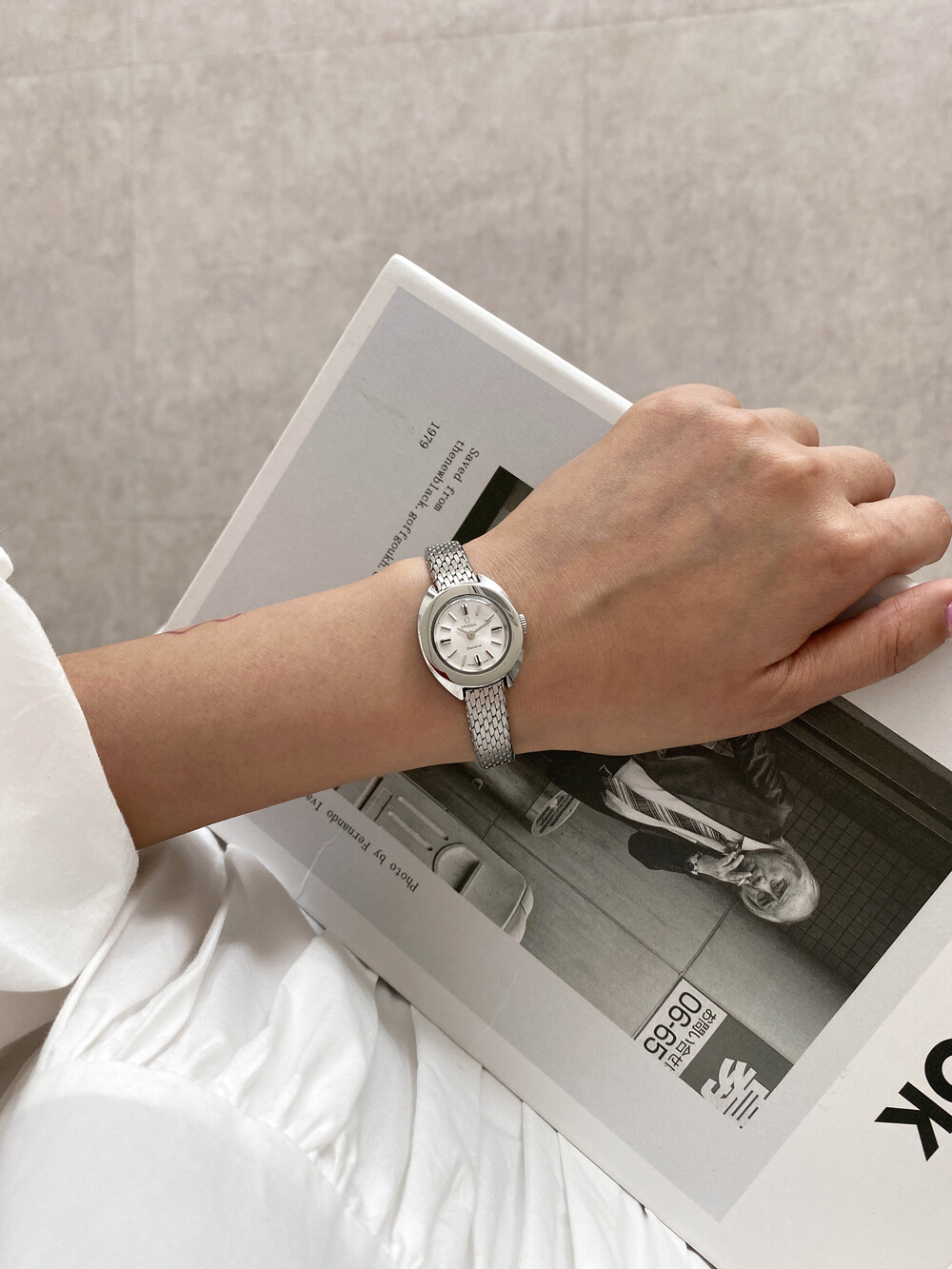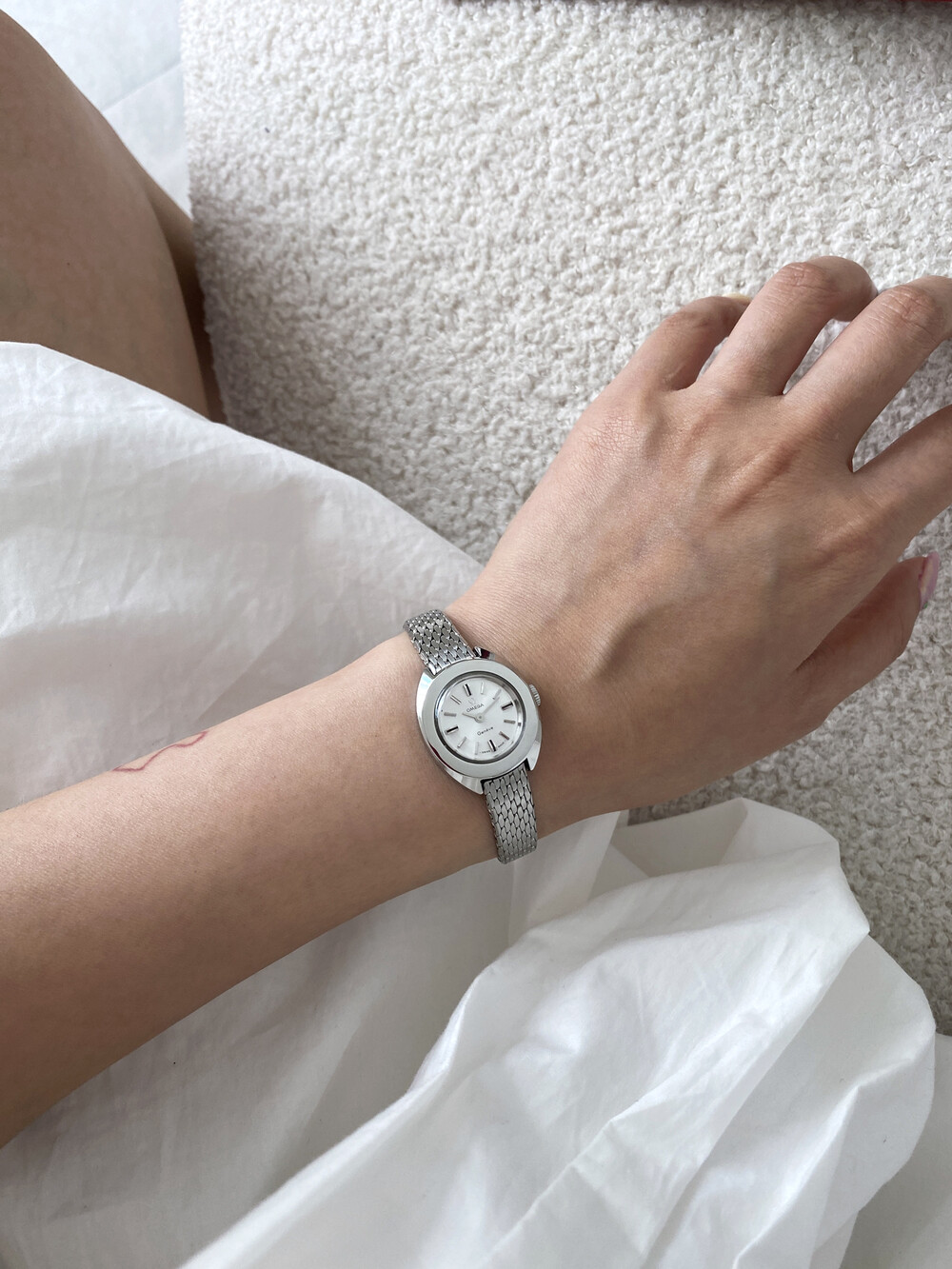 1969년도에 제작된 오메가 제네브 모델로 부드러운 곡선의 실버 케이스와 입체적인 바 인덱스,