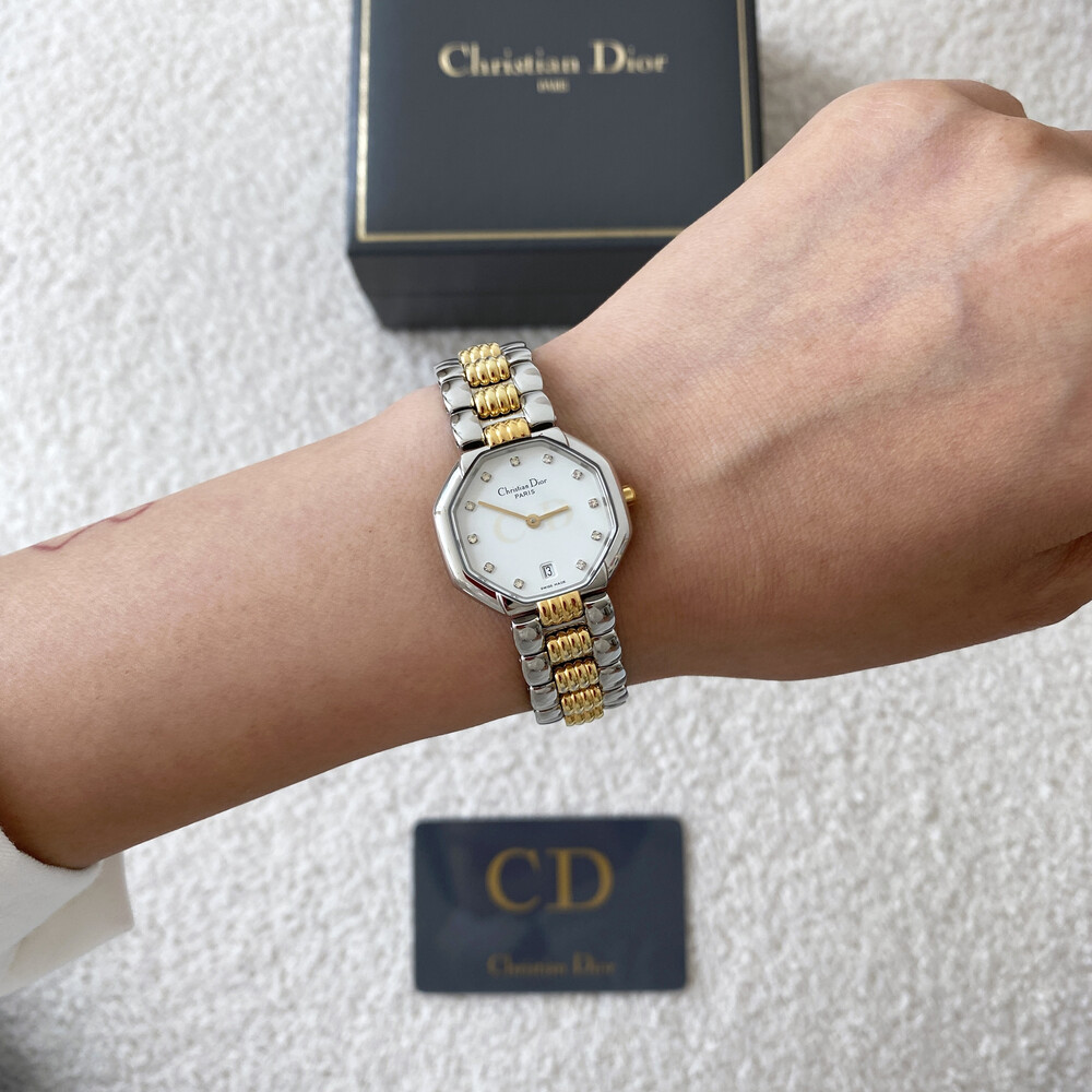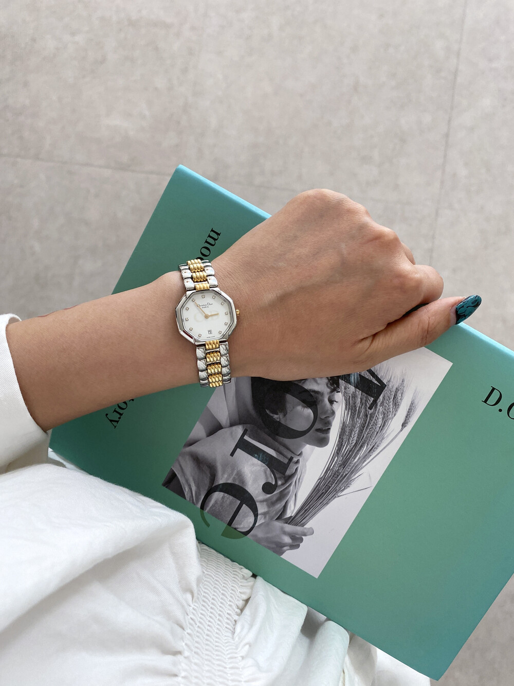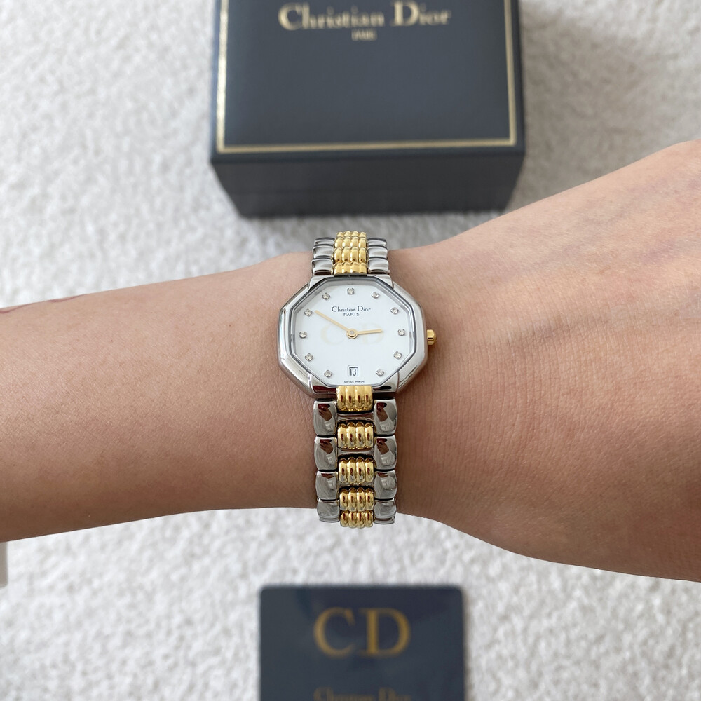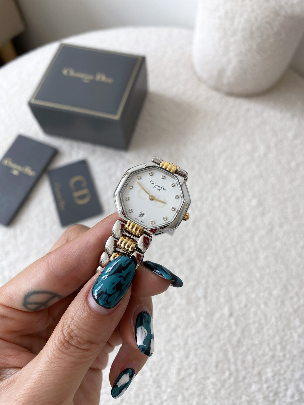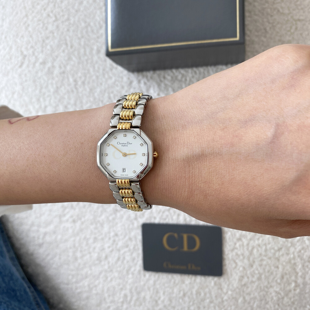 여성용으로 제작된 빈티지 디올 시계이며 스위스에서 생산된 쿼츠 무브먼트로 제작되었습니다.
