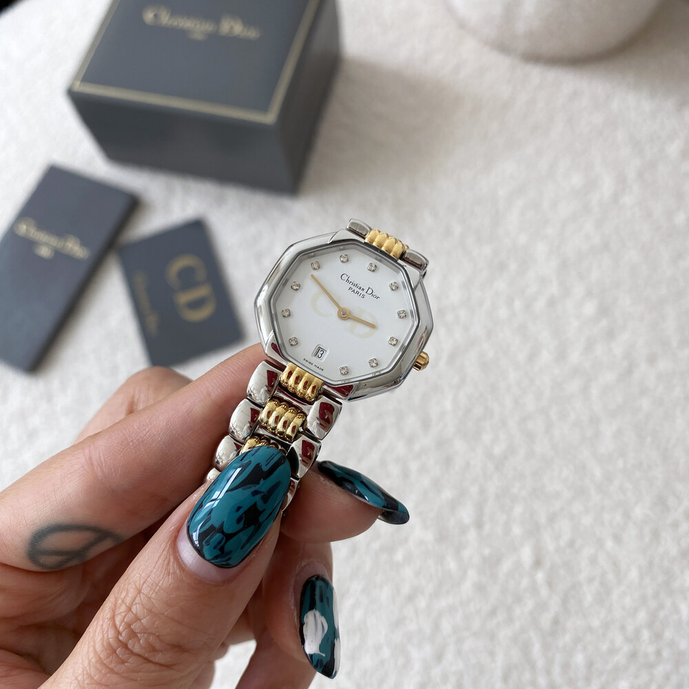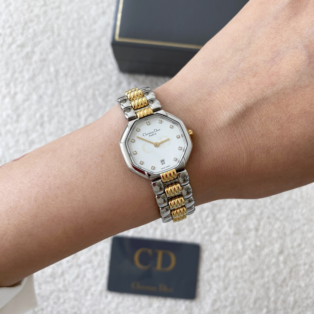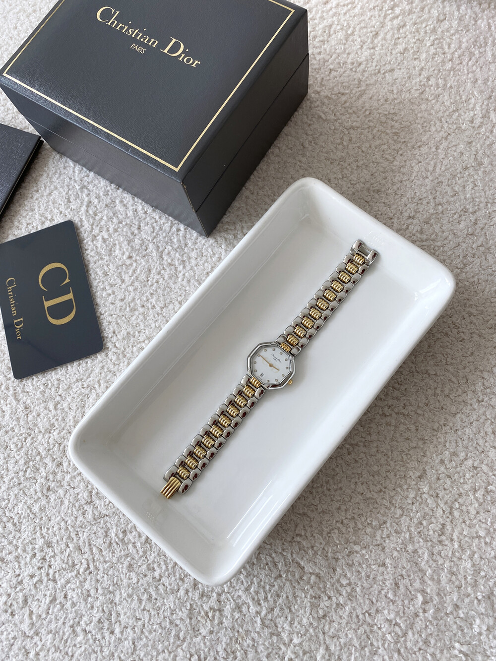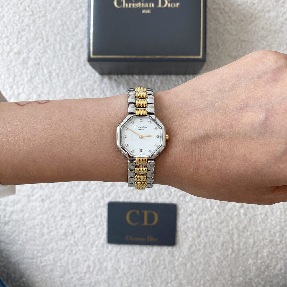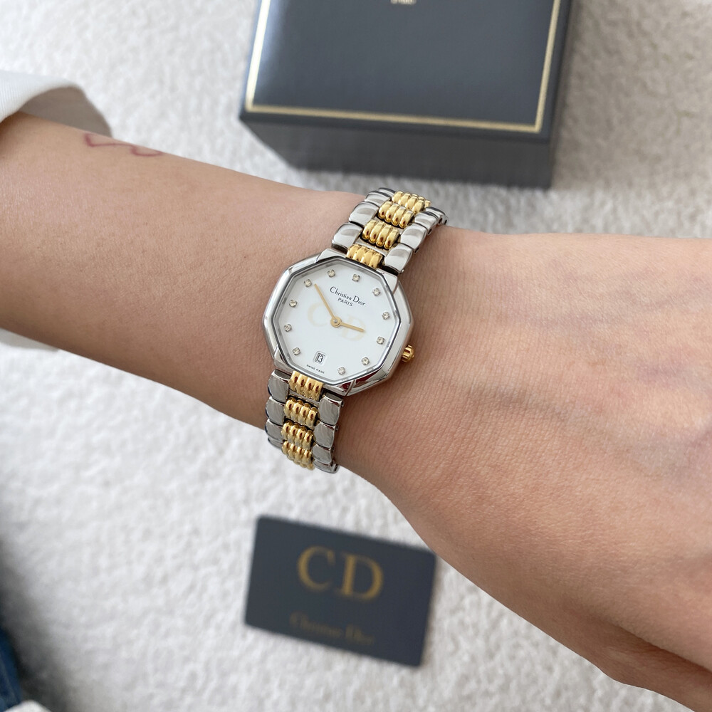 여성용으로 제작된 빈티지 디올 시계이며 스위스에서 생산된 쿼츠 무브먼트로 제작되었습니다.