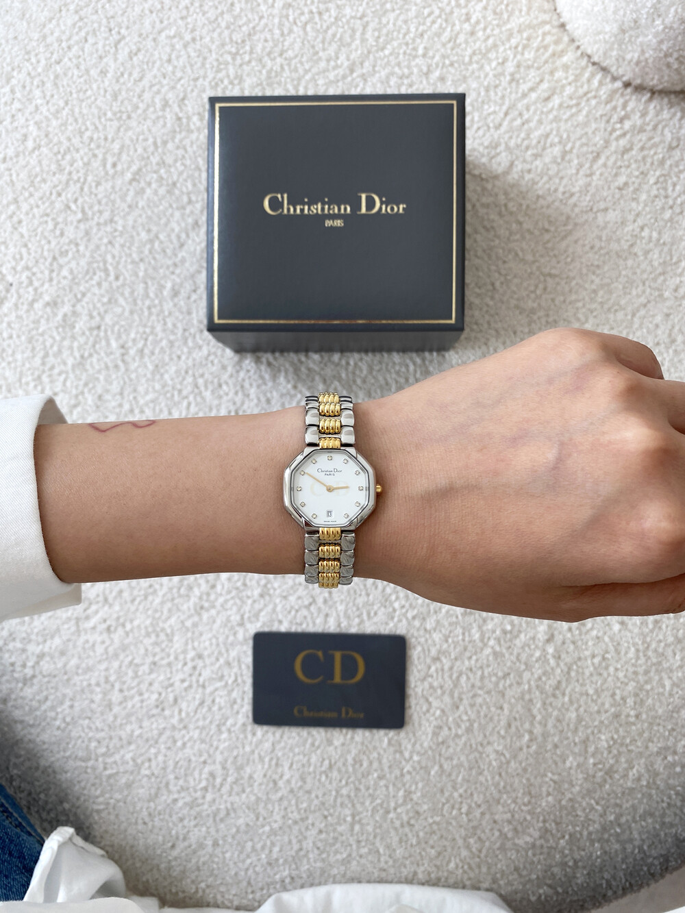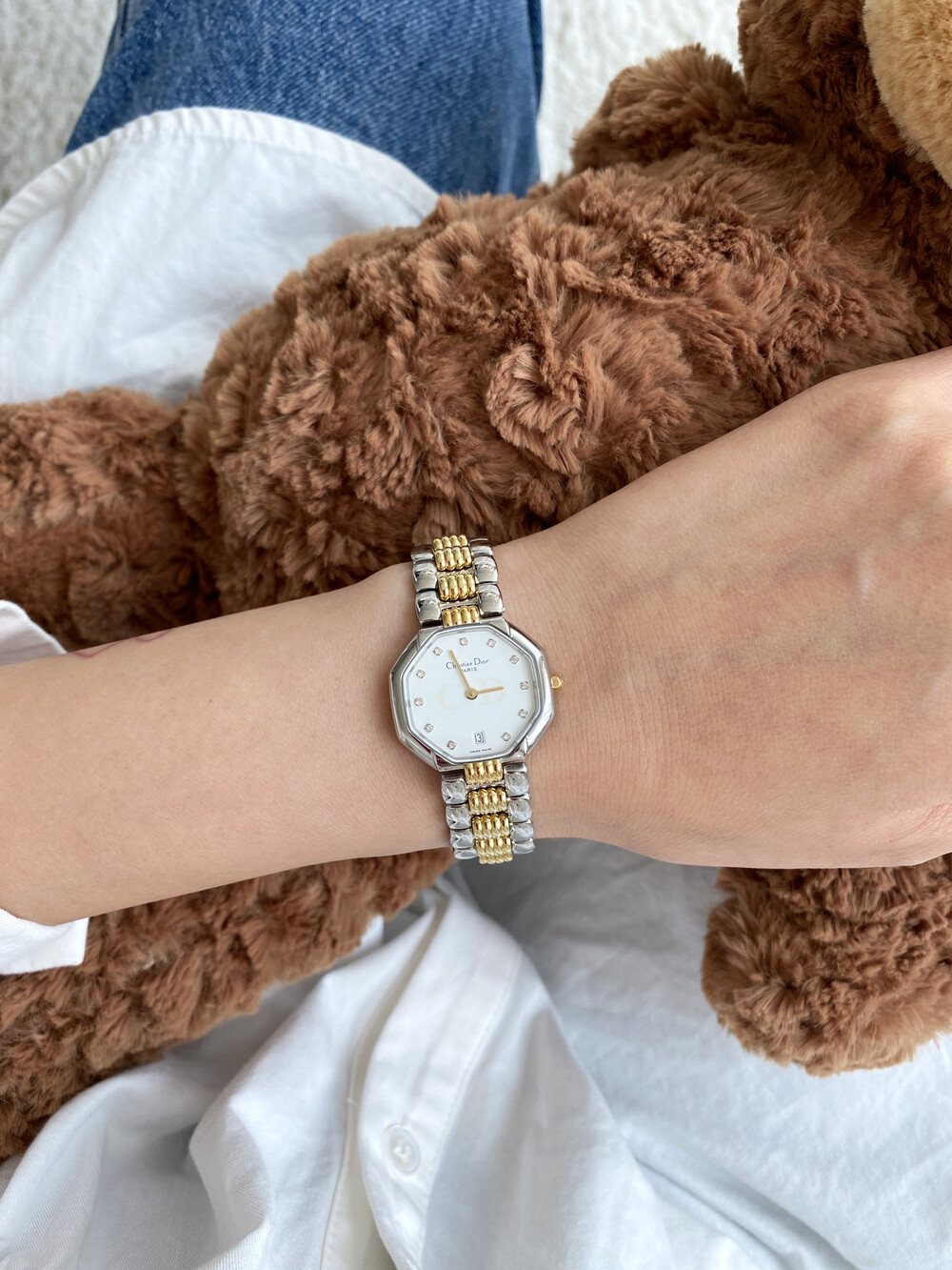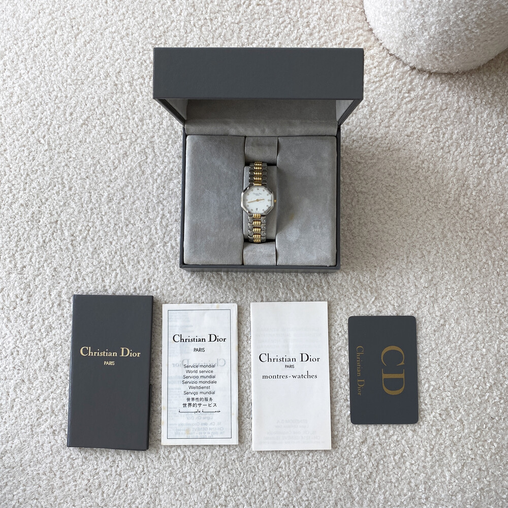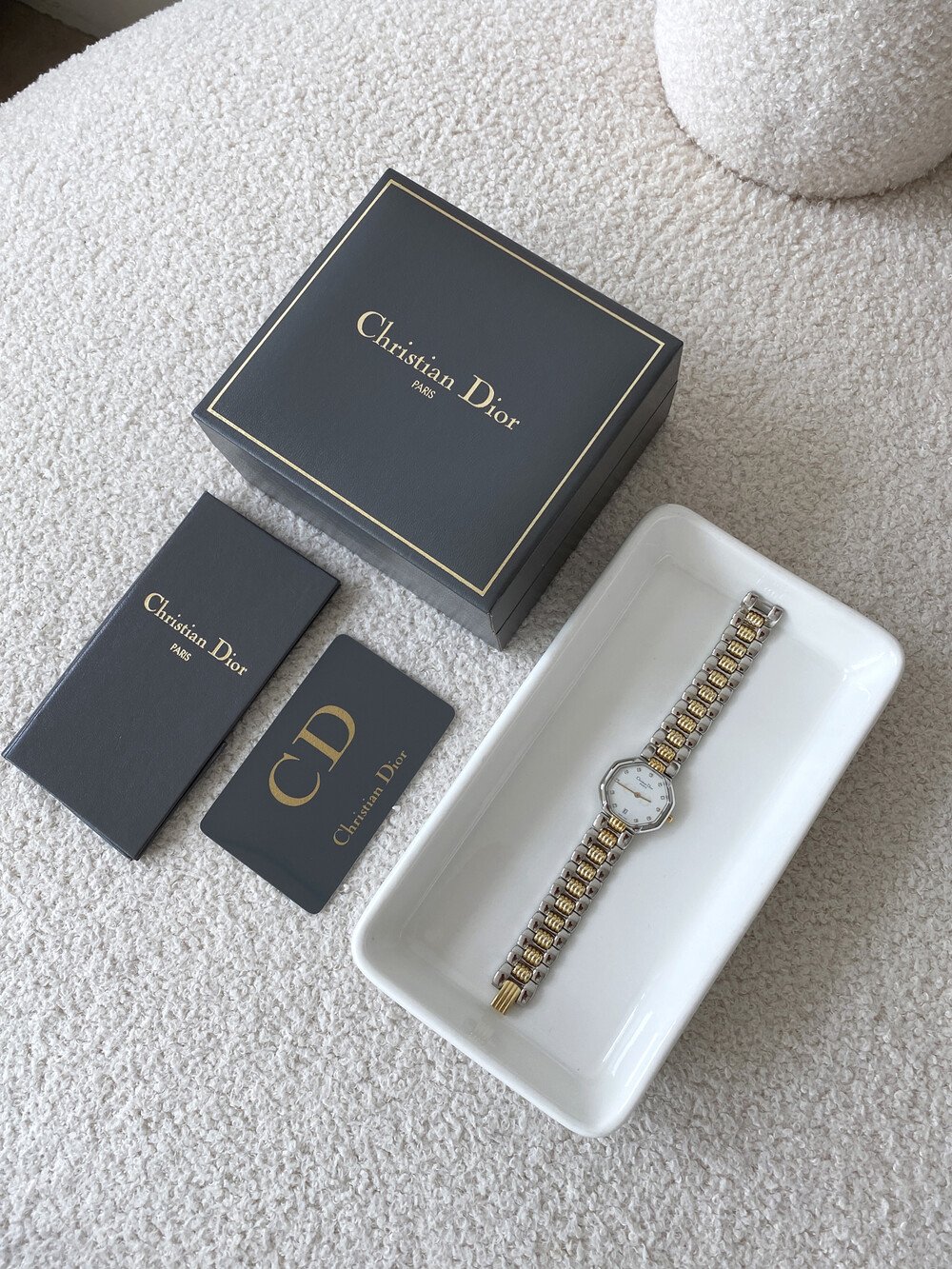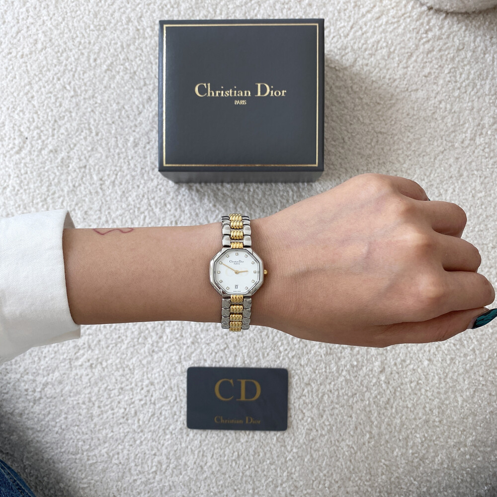 여성용으로 제작된 빈티지 디올 시계이며 스위스에서 생산된 쿼츠 무브먼트로 제작되었습니다.