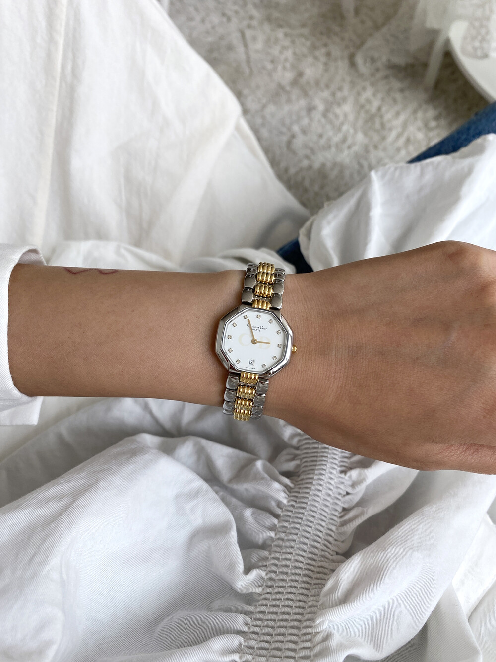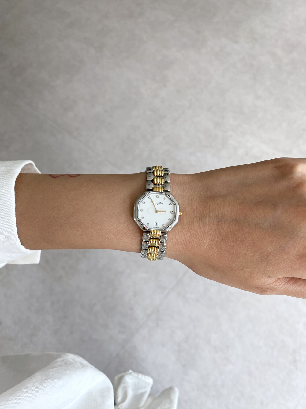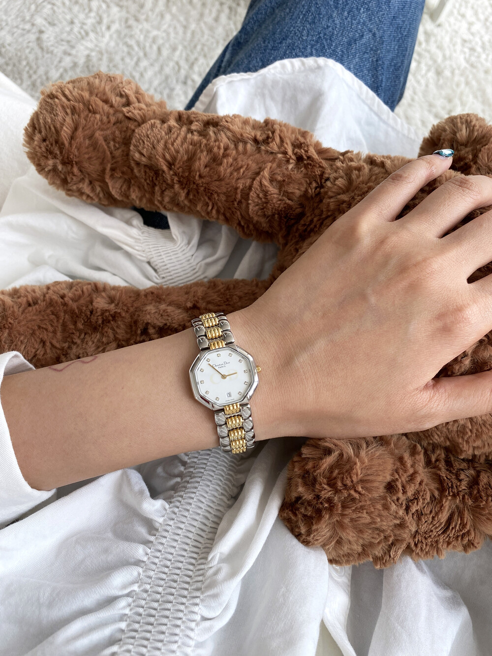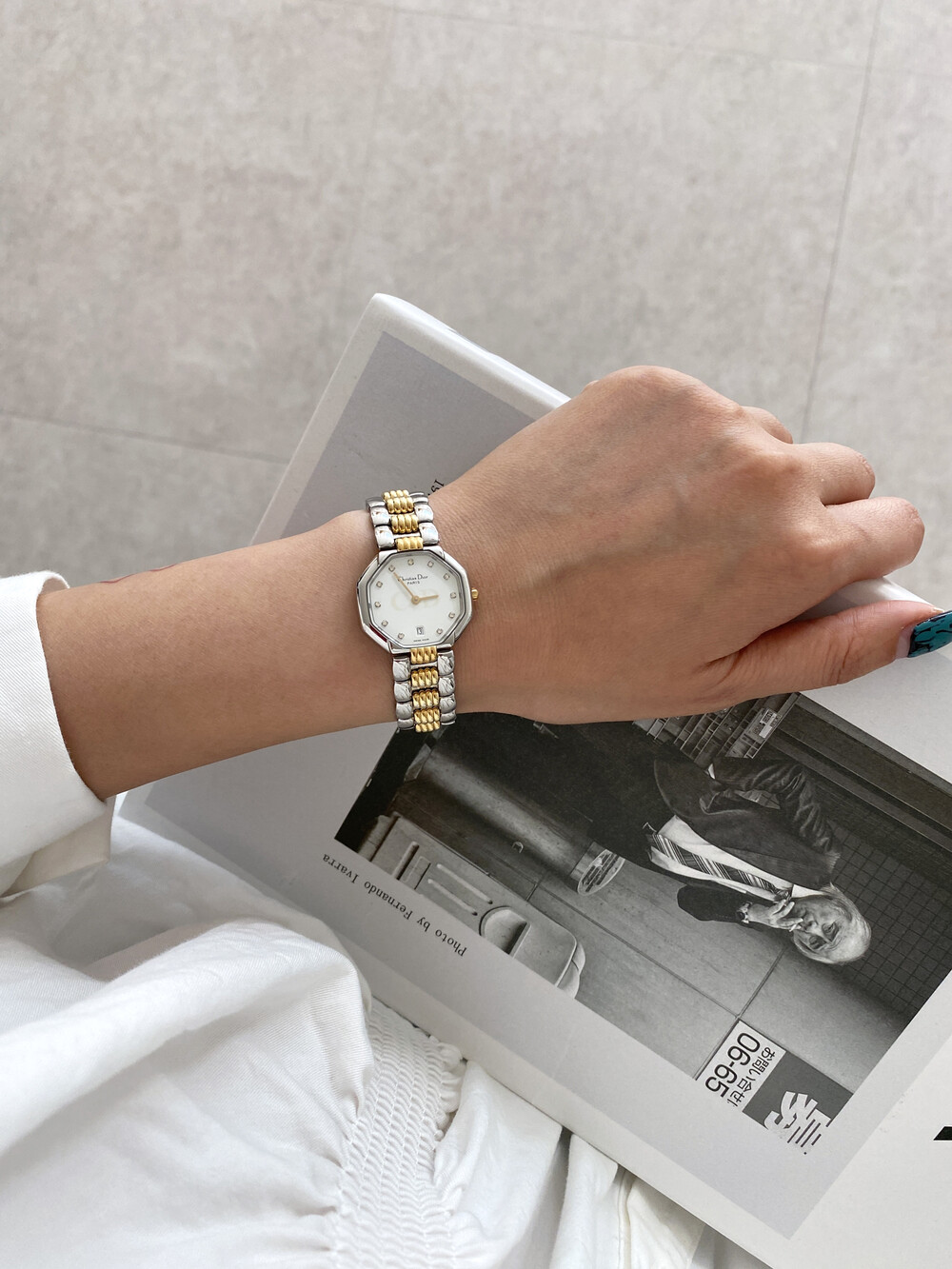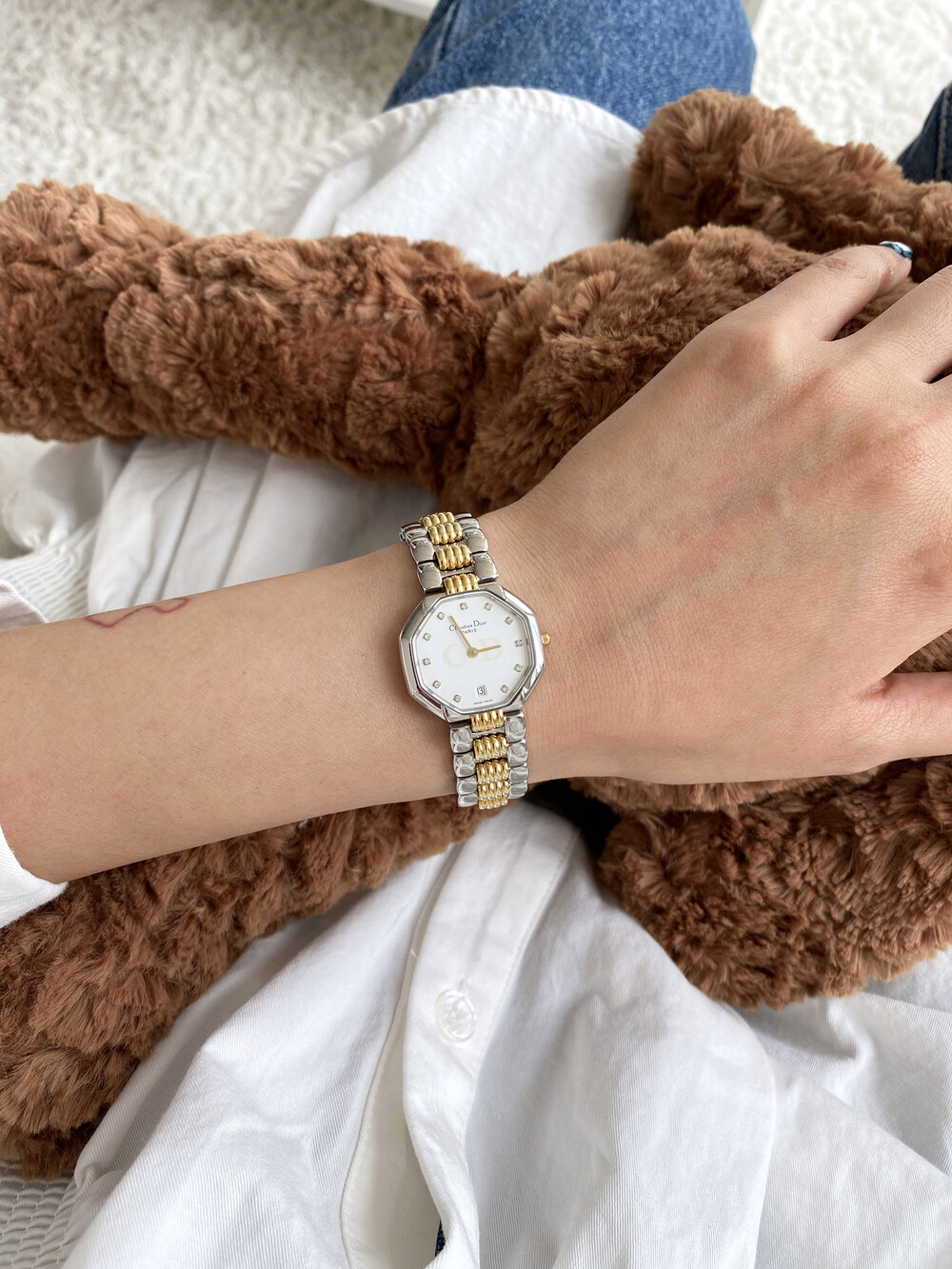 여성용으로 제작된 빈티지 디올 시계이며 스위스에서 생산된 쿼츠 무브먼트로 제작되었습니다.